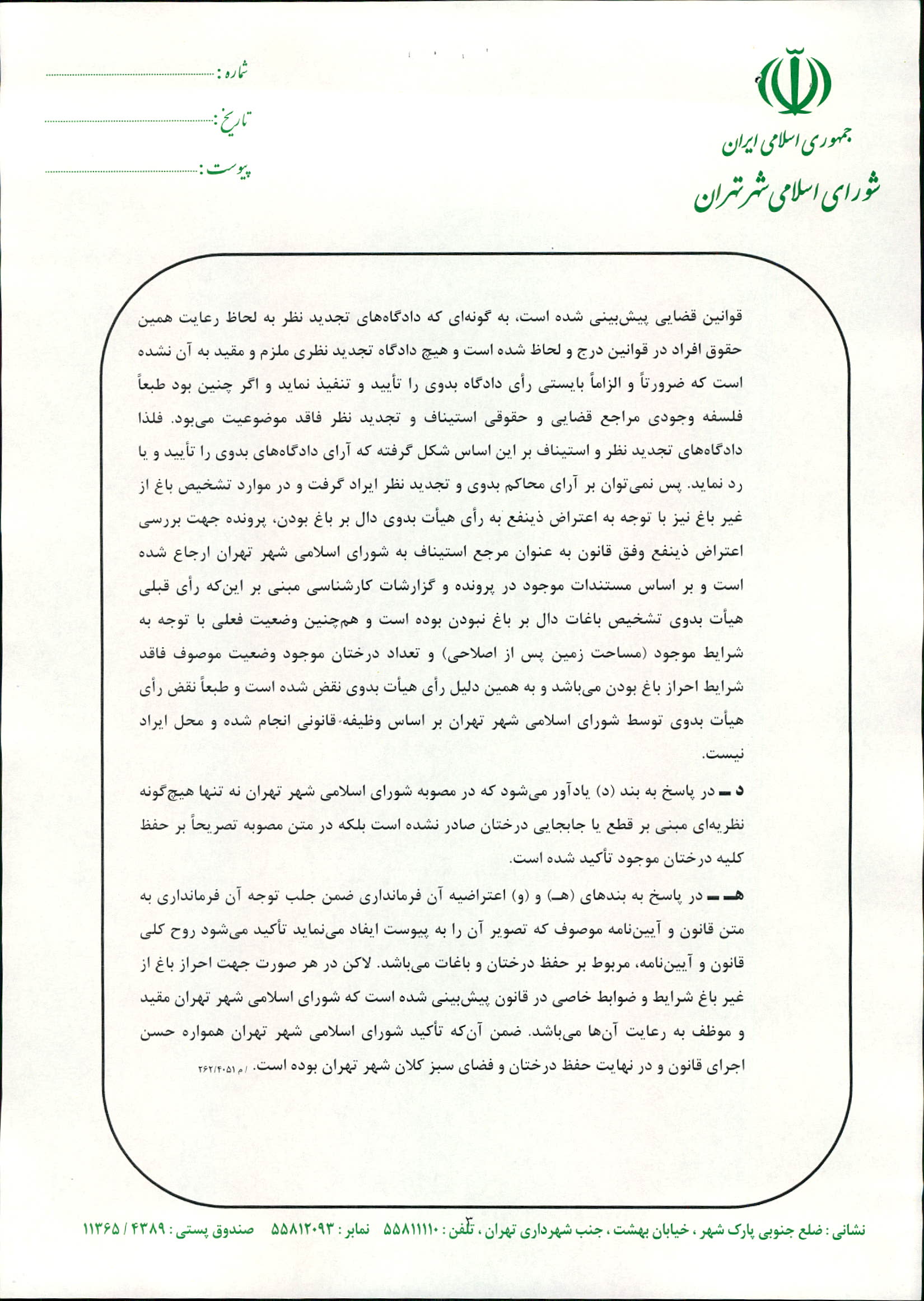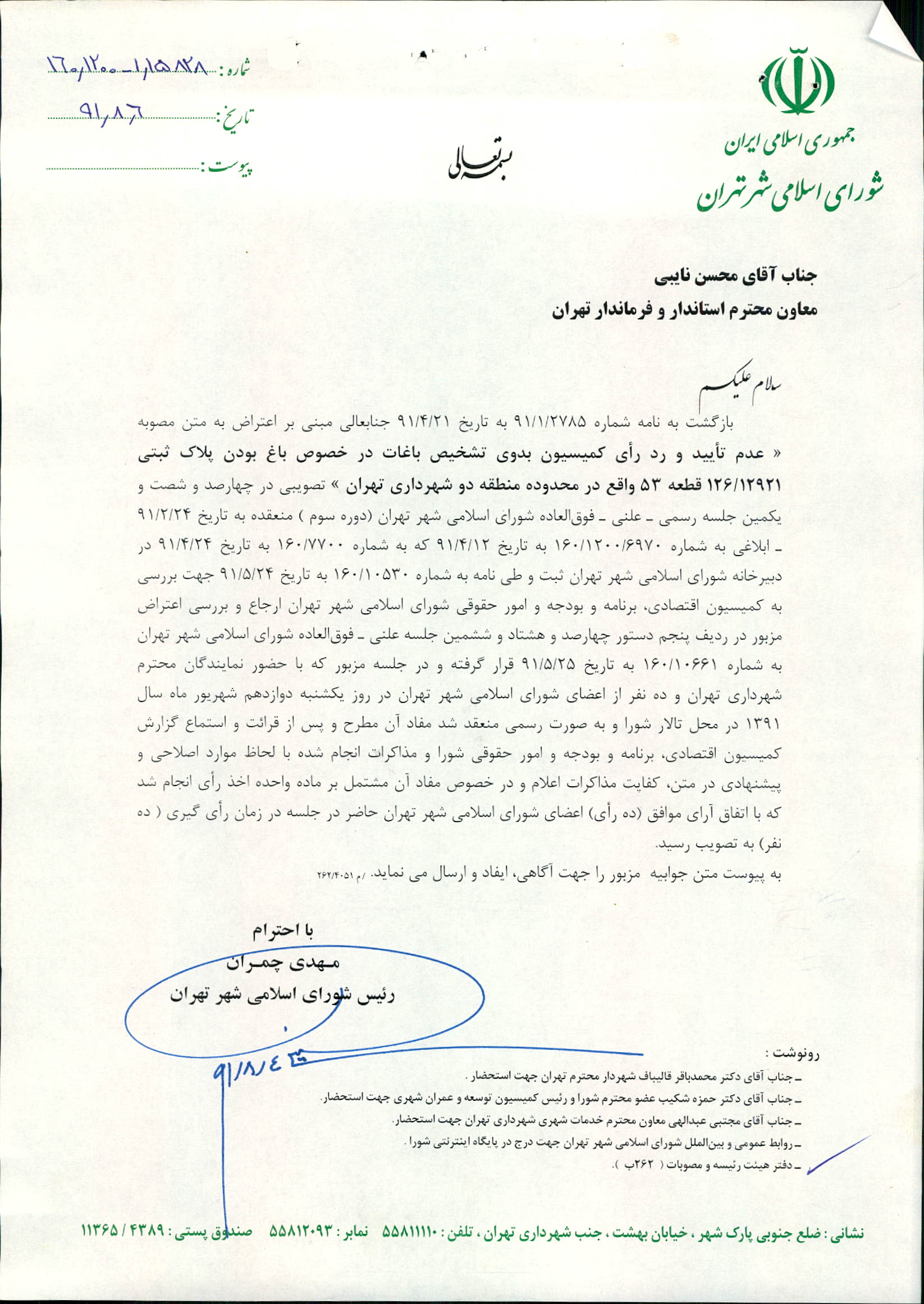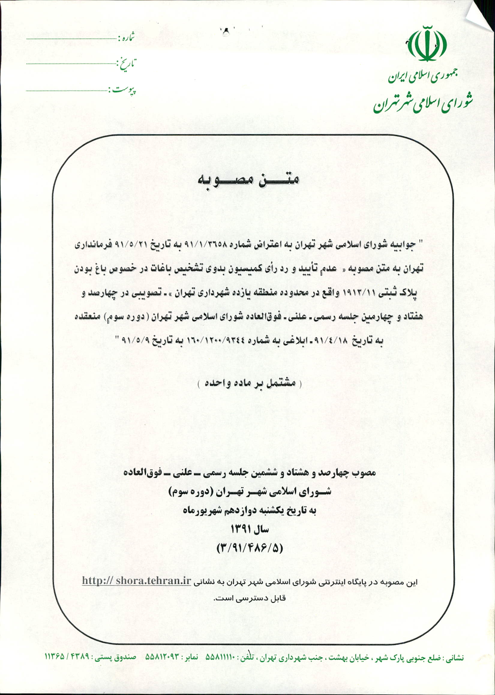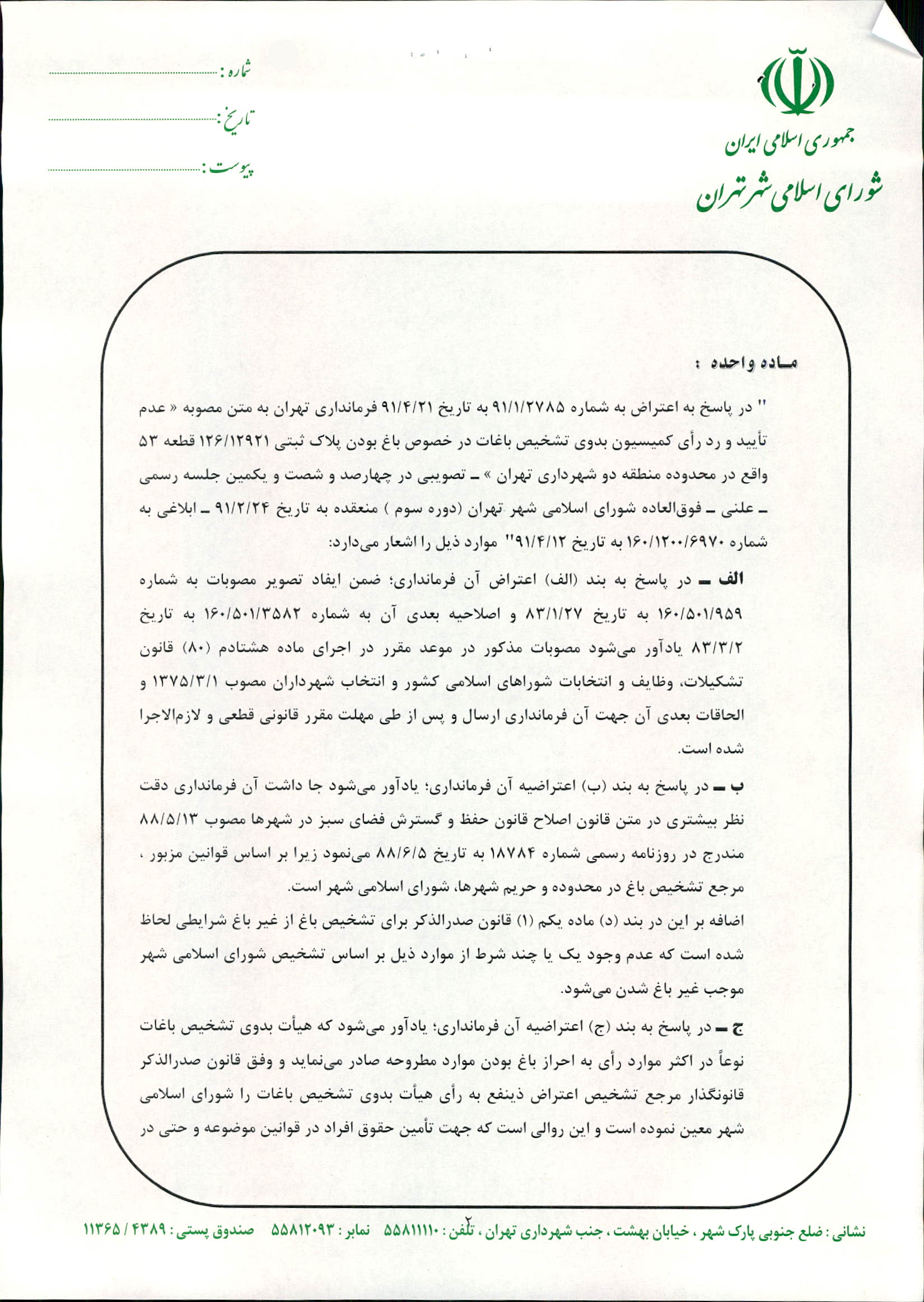 جوابيه شوراي اسلامي شهر تهران به اعتراض شماره 91/1/2785 به تاريخ 91/4/21 فرمانداري تهران به متن مصوبه «عدم تأييد و رد رأي كميسيون بدوي تشخيص باغات در خصوص باغ بودن پلاك ثبتي 126/12921 قطعه 53 واقع در محدوده منطقه دو شهرداري تهران» ـ تصويبي در چهارصد و شصت و يكمين جلسه رسمي ـ علني ـ فوقالعاده شوراي اسلامي شهر تهران (دوره سوم) منعقده به تاريخ 91/2/24- ابلاغي به شماره 160/1200/6970 به تاريخ 91/4/12