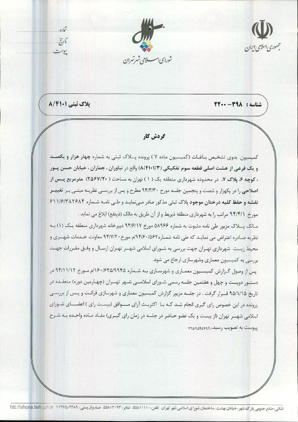 مصوبه شورای اسلامی شهر تهران در خصوص پلاك ثبتي به شماره چهار هزار و یکصد و یک فرعی از هشت اصلی قطعه سوم تفکیکی (8/4101/3) واقع در محدوده منطقه یک (1) شهرداري تهران