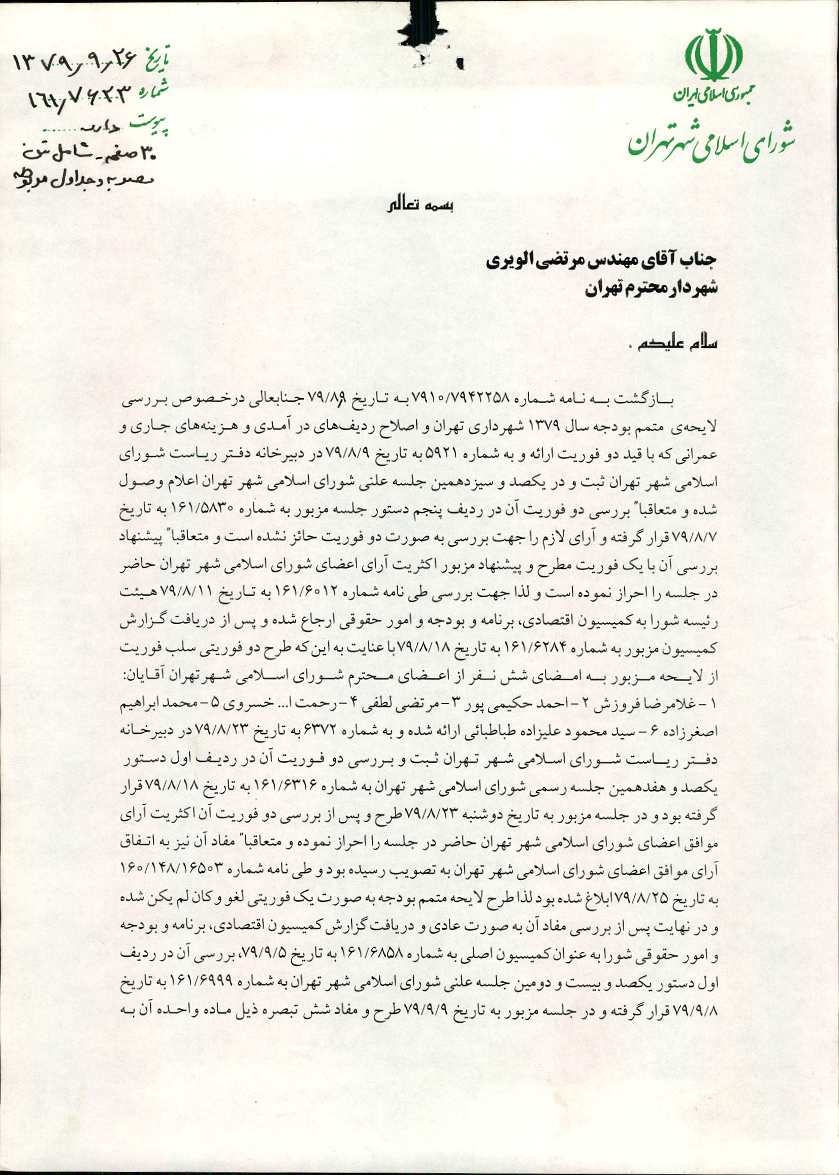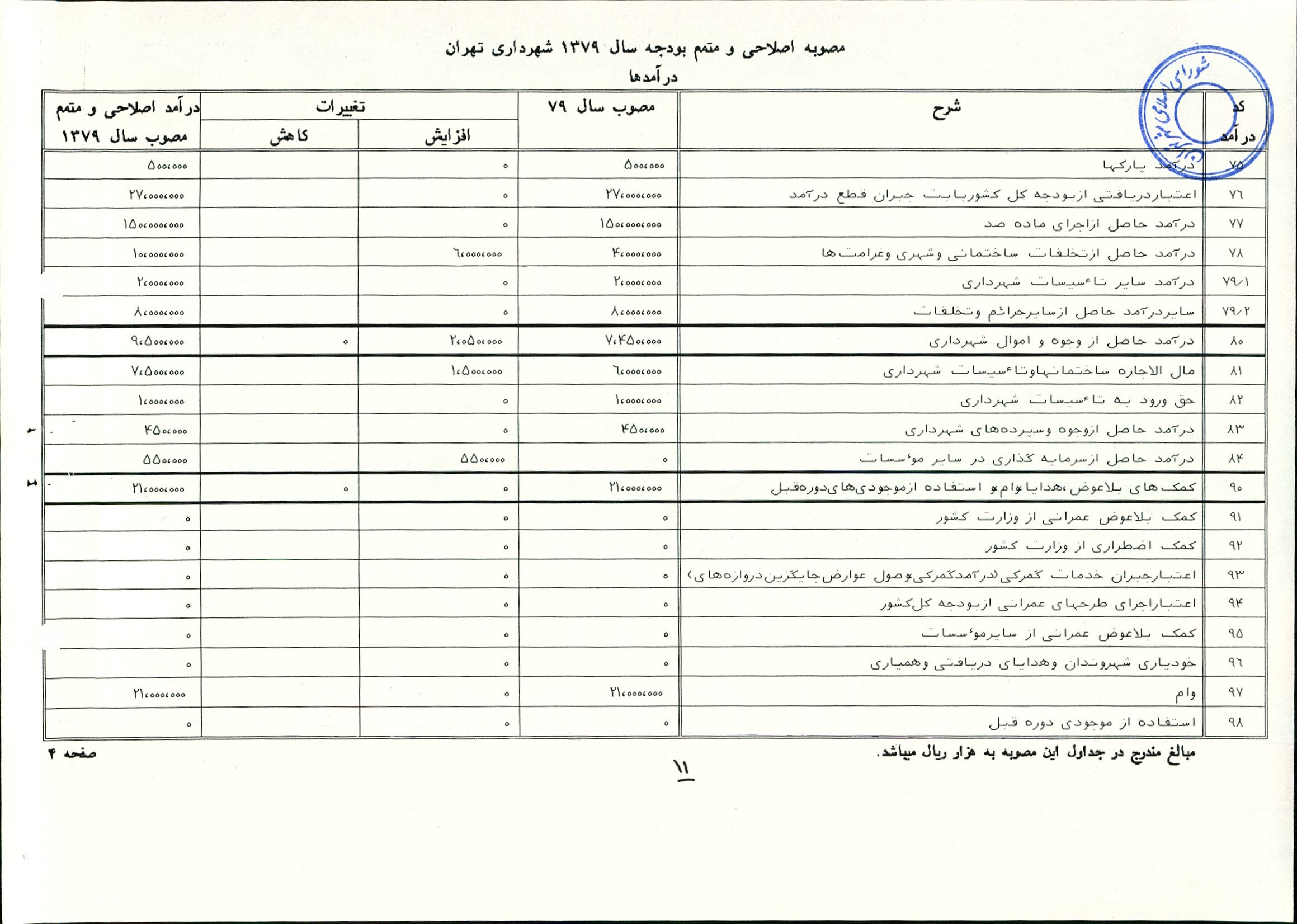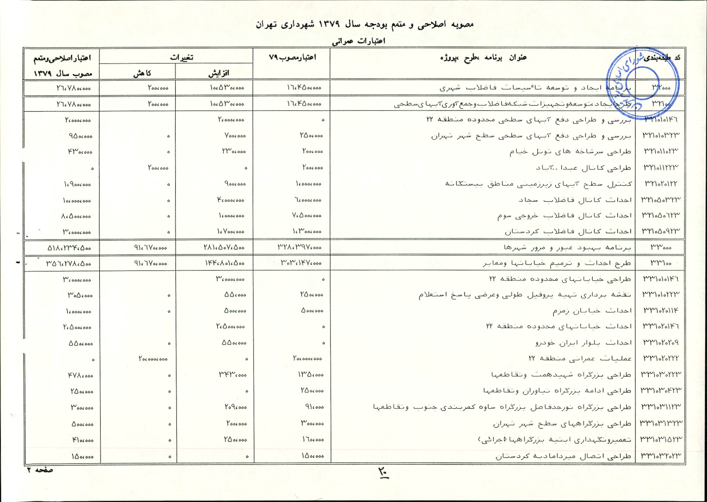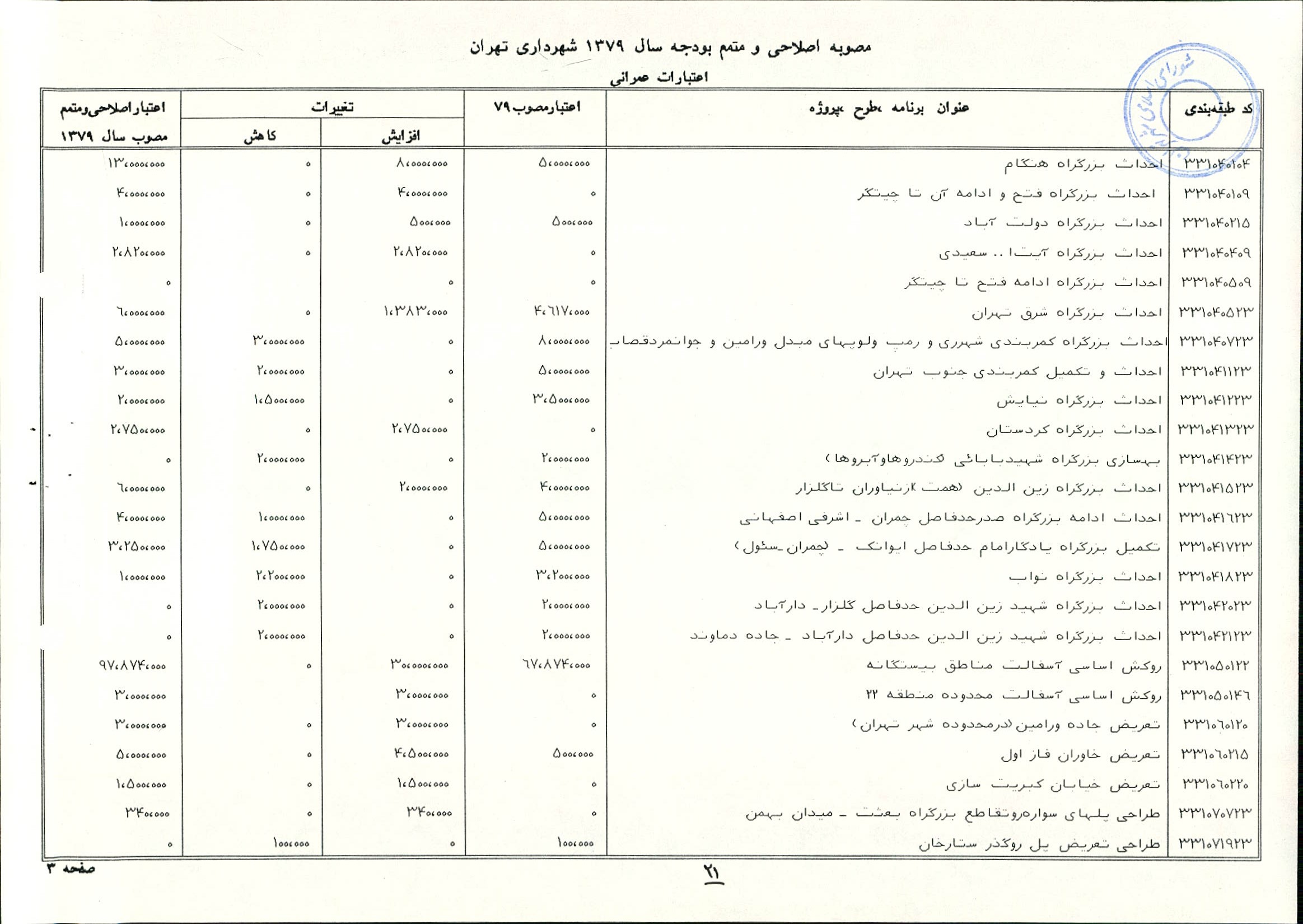 اصلاحيه و متمم بودجه سال 1379 شهرداري تهران و جداول اعتباري (اصلاحي) رديفهاي درآمدي و هزينههاي جاري و عمراني