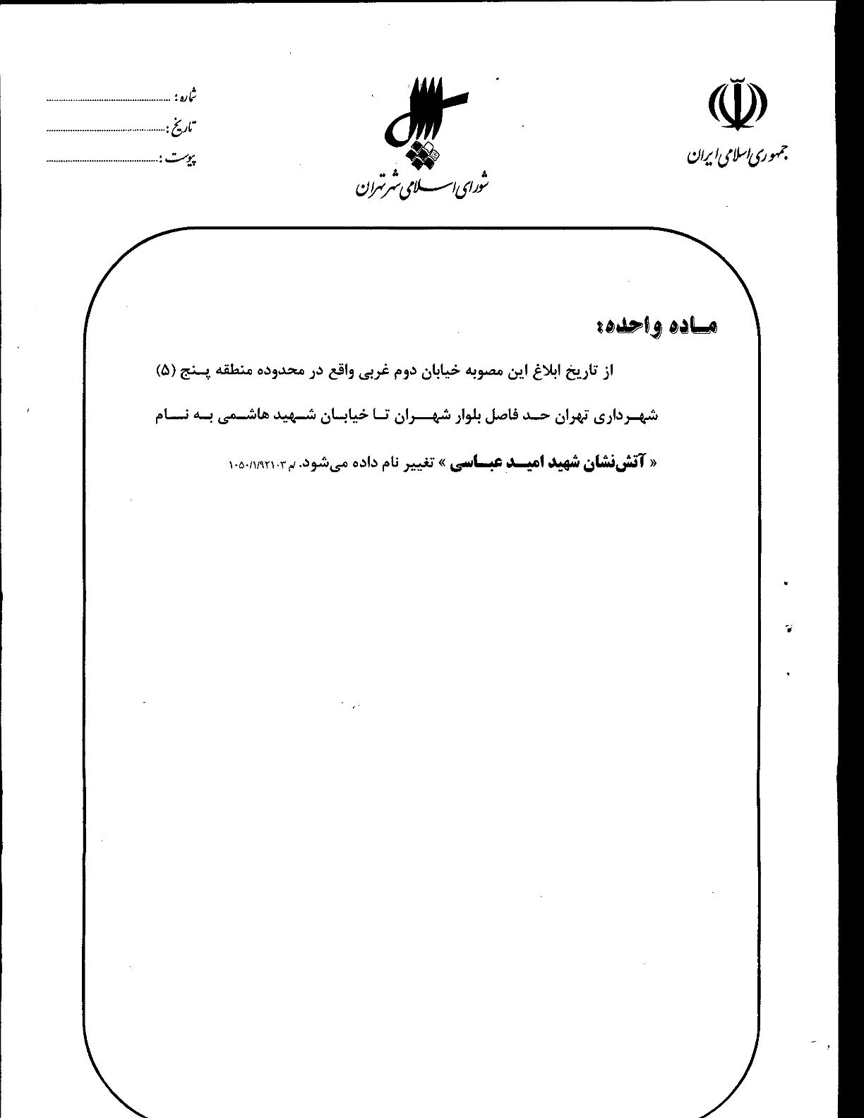 تغيير نام خيابان دوم غربي واقع در محدوده منطقه 5 شهرداري تهران به نام «آتشنشان شهيد اميد عباسي» در اجراي مصوبه «نامگذاري يكي از معابر يا يكي از ايستگاههاي آتشنشاني و خدمات ايمني شهرداري تهران به نام آتشنشان شهيد اميد عباسي»