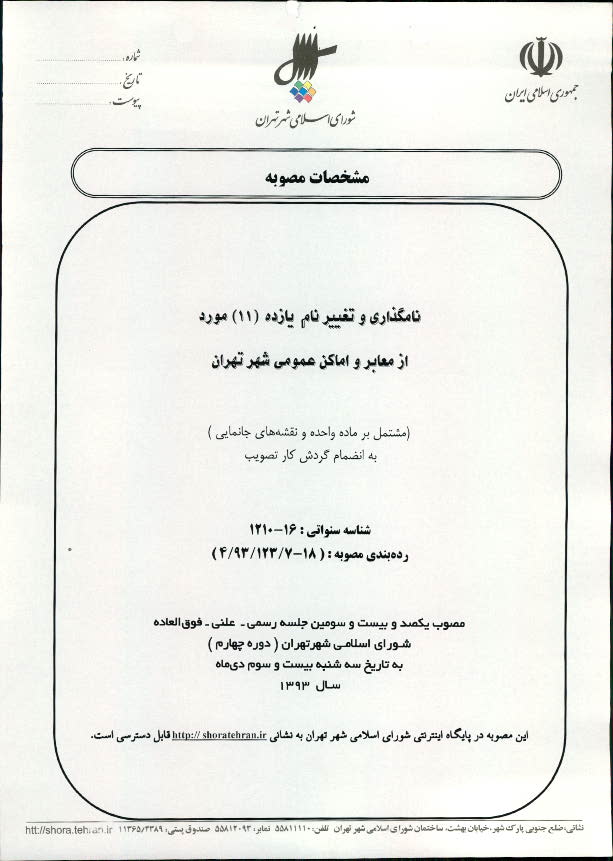 نامگذاري و تغيير نام یازده (11) مورد از معابر و اماكن عمومي شهر تهران