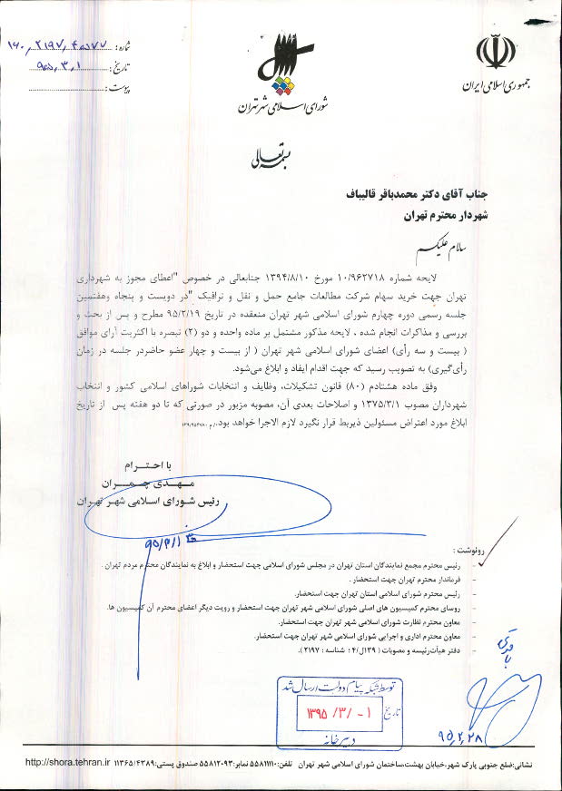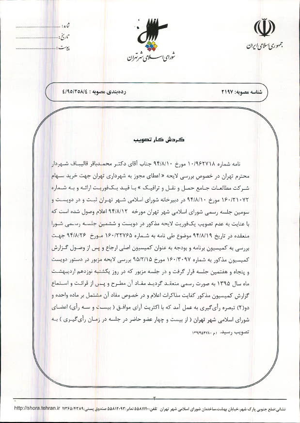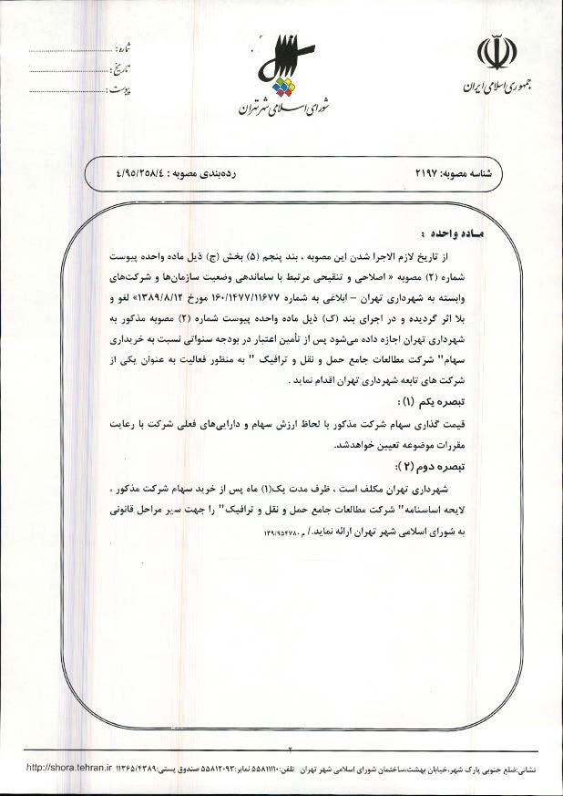 اعطای مجوز به شهرداری تهران جهت خرید سهام شرکت <span class='color-white background-darkblue'>مطالعات</span> جامع حمل و نقل و ترافیک