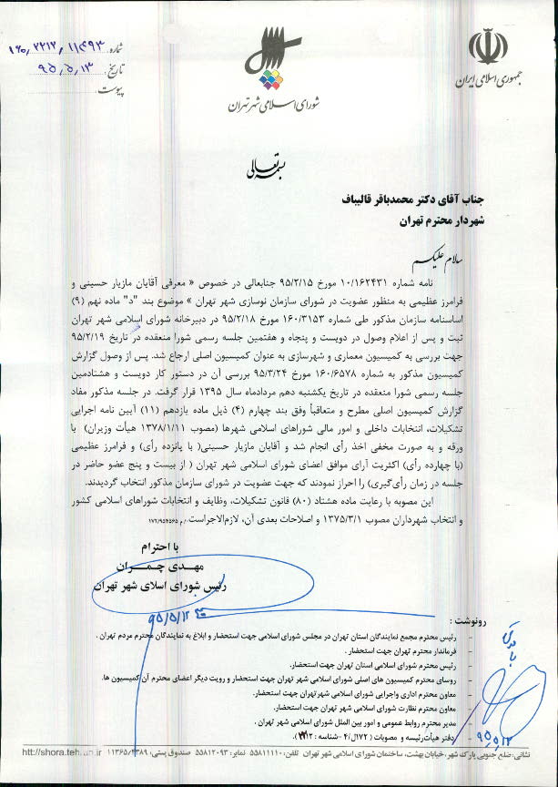 انتخاب آقايان مازيار حسيني و فرامرز عظيمي به منظور عضويت در شوراي سازمان نوسازي شهر تهران موضوع ماده نهم (9) اساسنامه سازمان مذكور