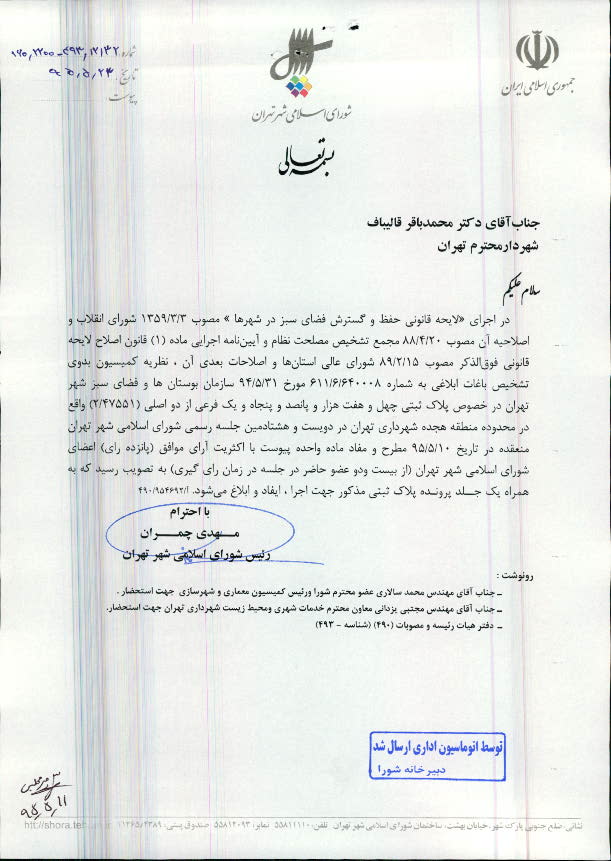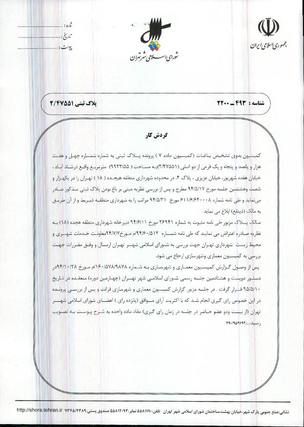 مصوبه شورای اسلامی شهر تهران در خصوص پلاك ثبتي به شماره چهل و هفت هزار و پانصد و پنجاه و یک فرعی از دو اصلی (2/47551) واقع در محدوده منطقه هیجده (18) شهرداري تهران