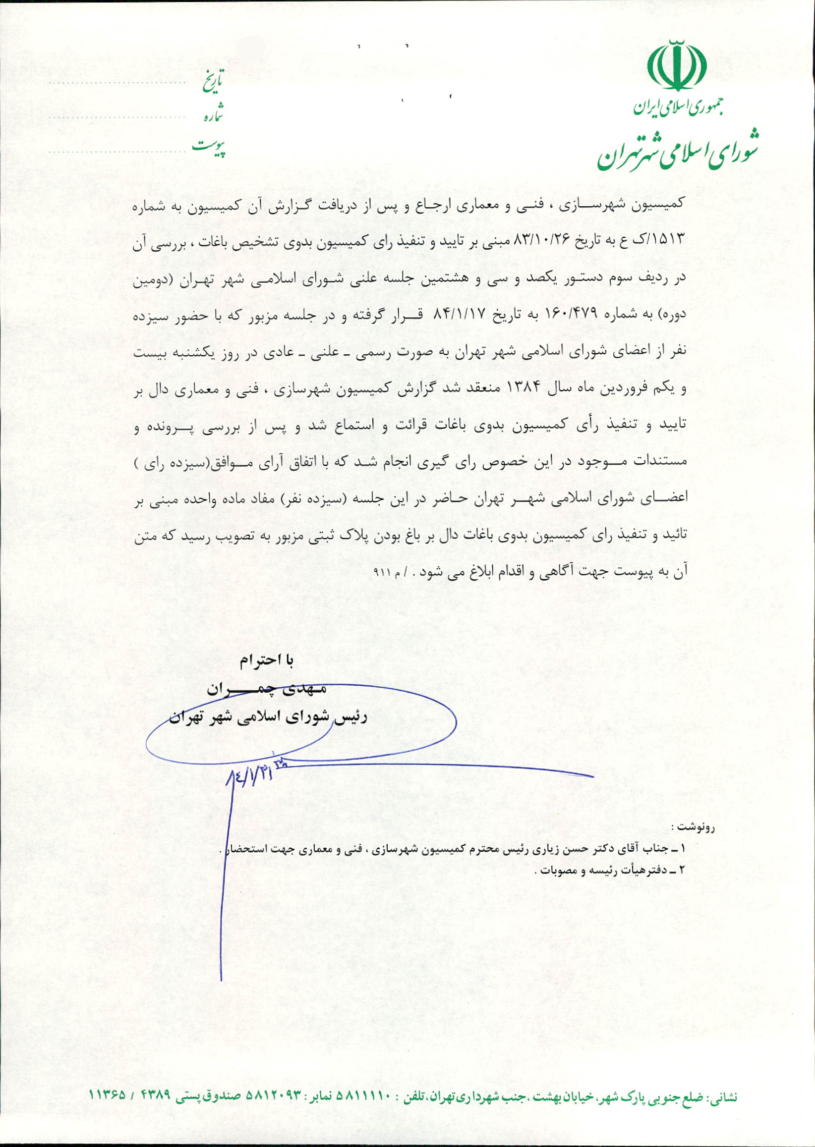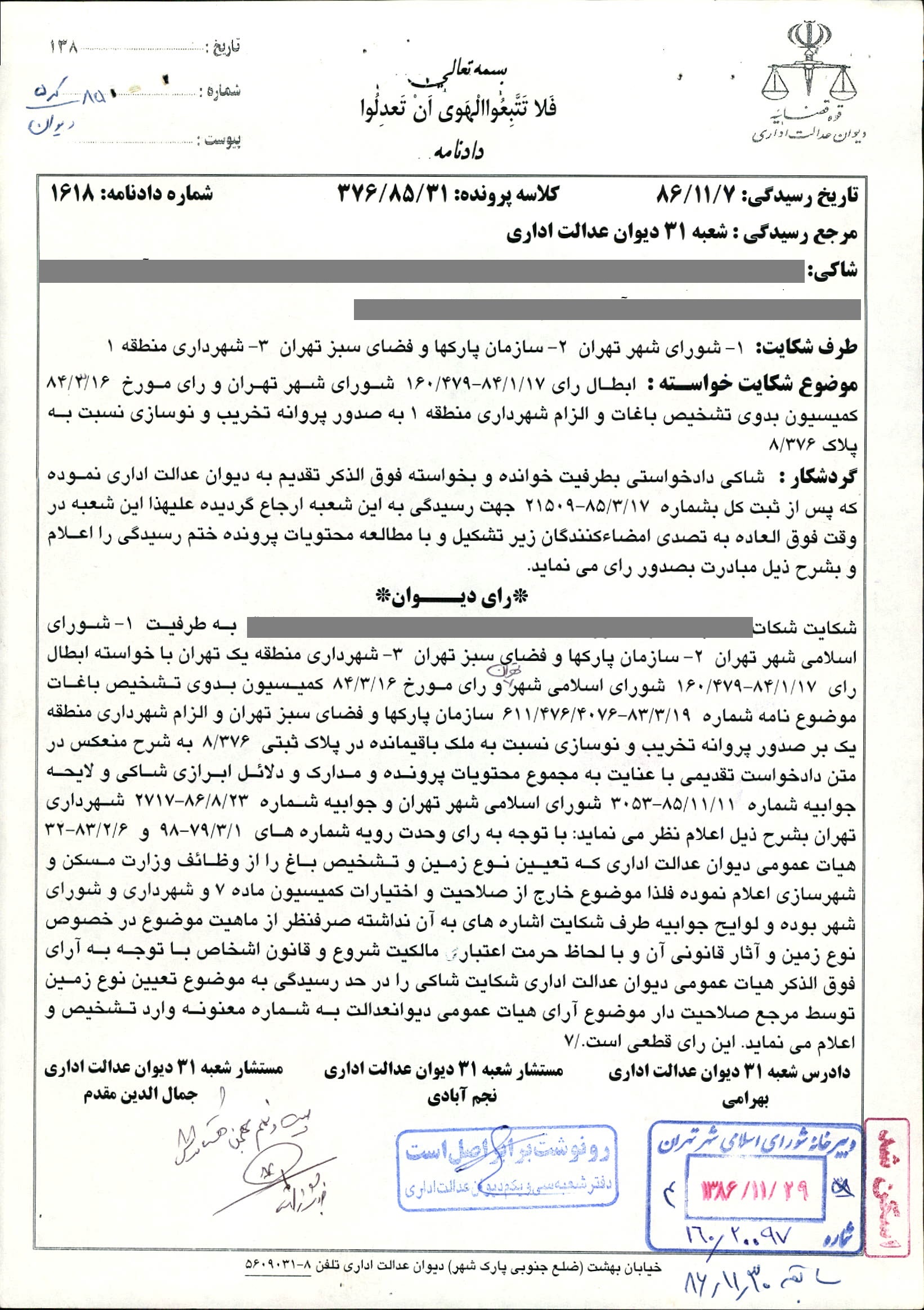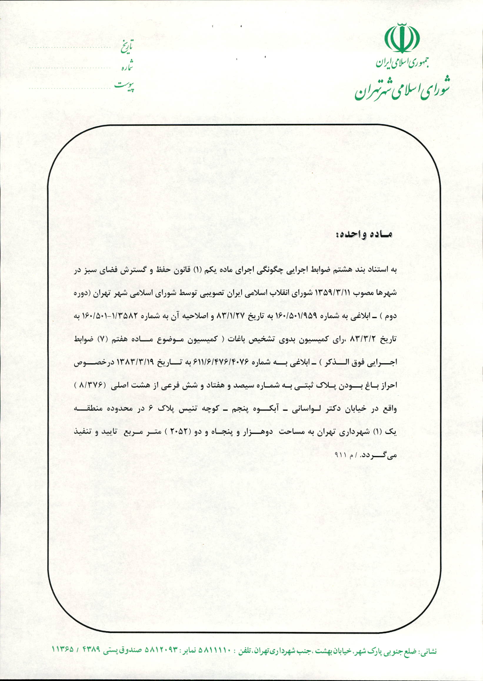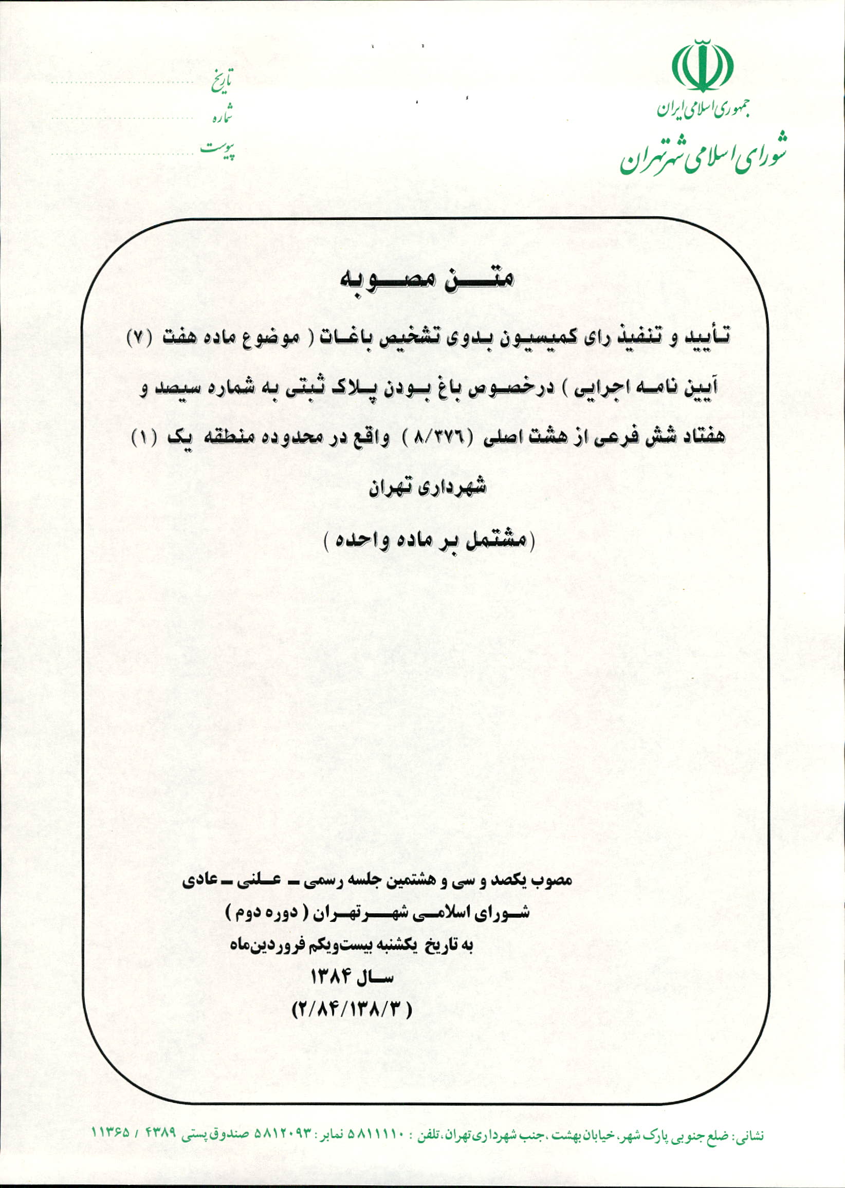 تأیید و تنفیذ رأی کمیسیون بدوی تشخیص باغات (موضوع ماده هفت (7) آییننامه اجرایی) در خصوص باغ بودن پلاک ثبتی به شماره سیصد و هفتاد و شش فرعی از هشت (8/376) واقع در محدوده منطقه یک (1) شهرداری تهران