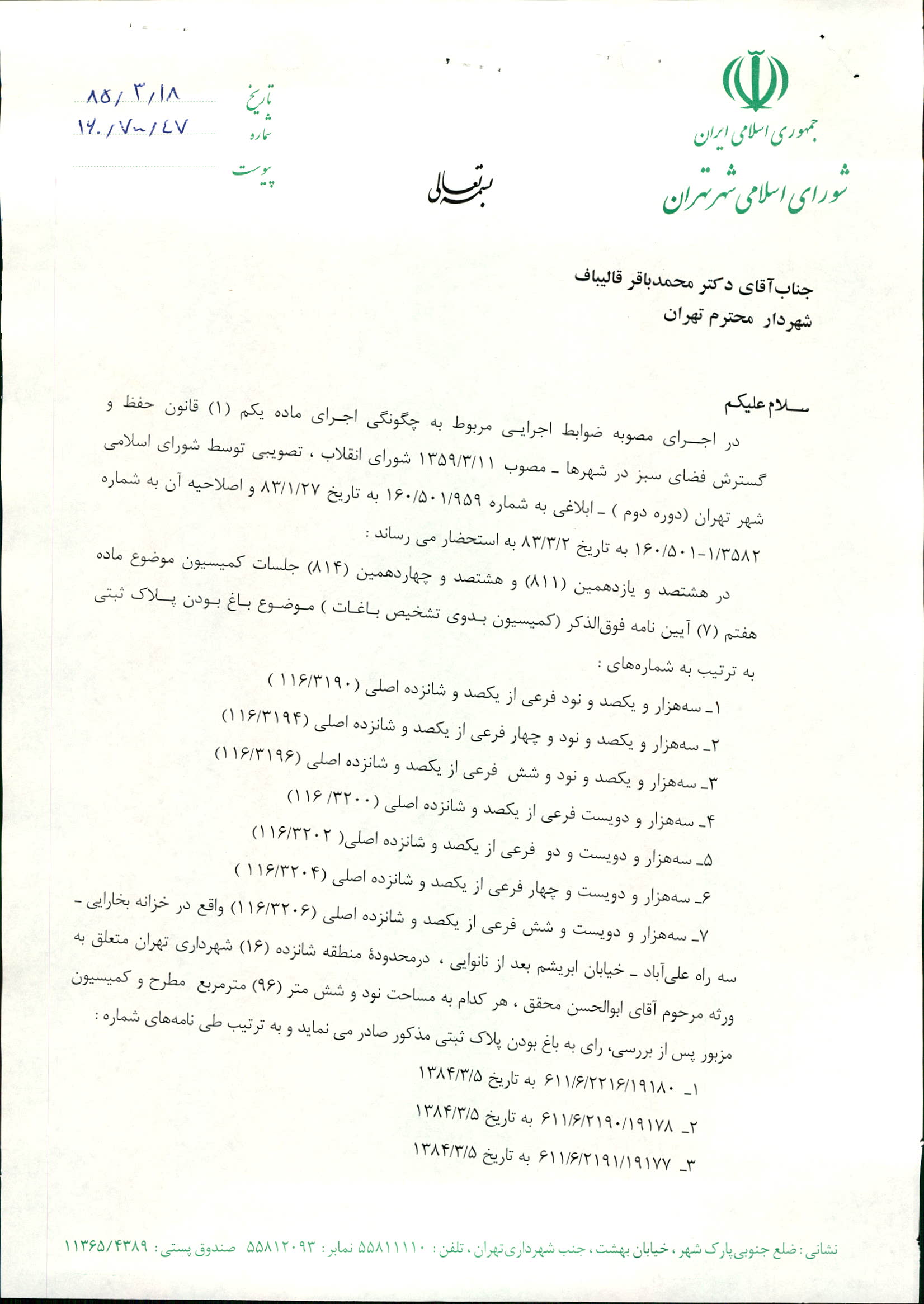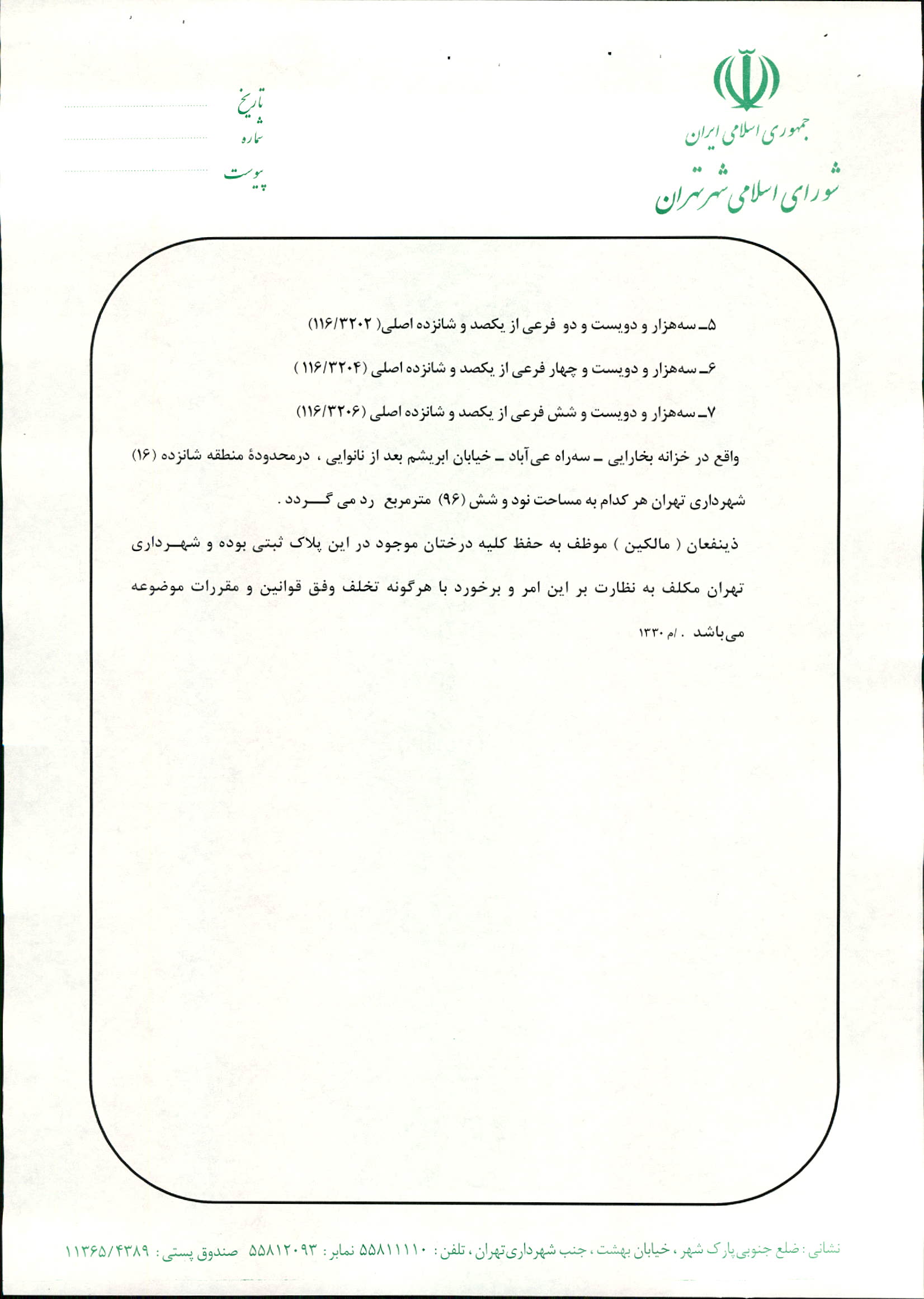 7 - سه هزار و دويست و شش فرعي از يكصد و شانزده اصلي (116/3206) در محدوده منطقه شانزده (16) شهرداري تهران