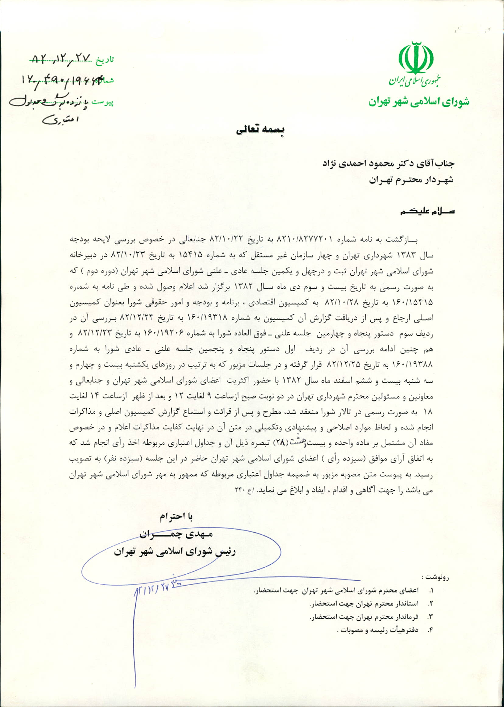 تاریخ صدور(ابلاغ) : 1382/12/27
