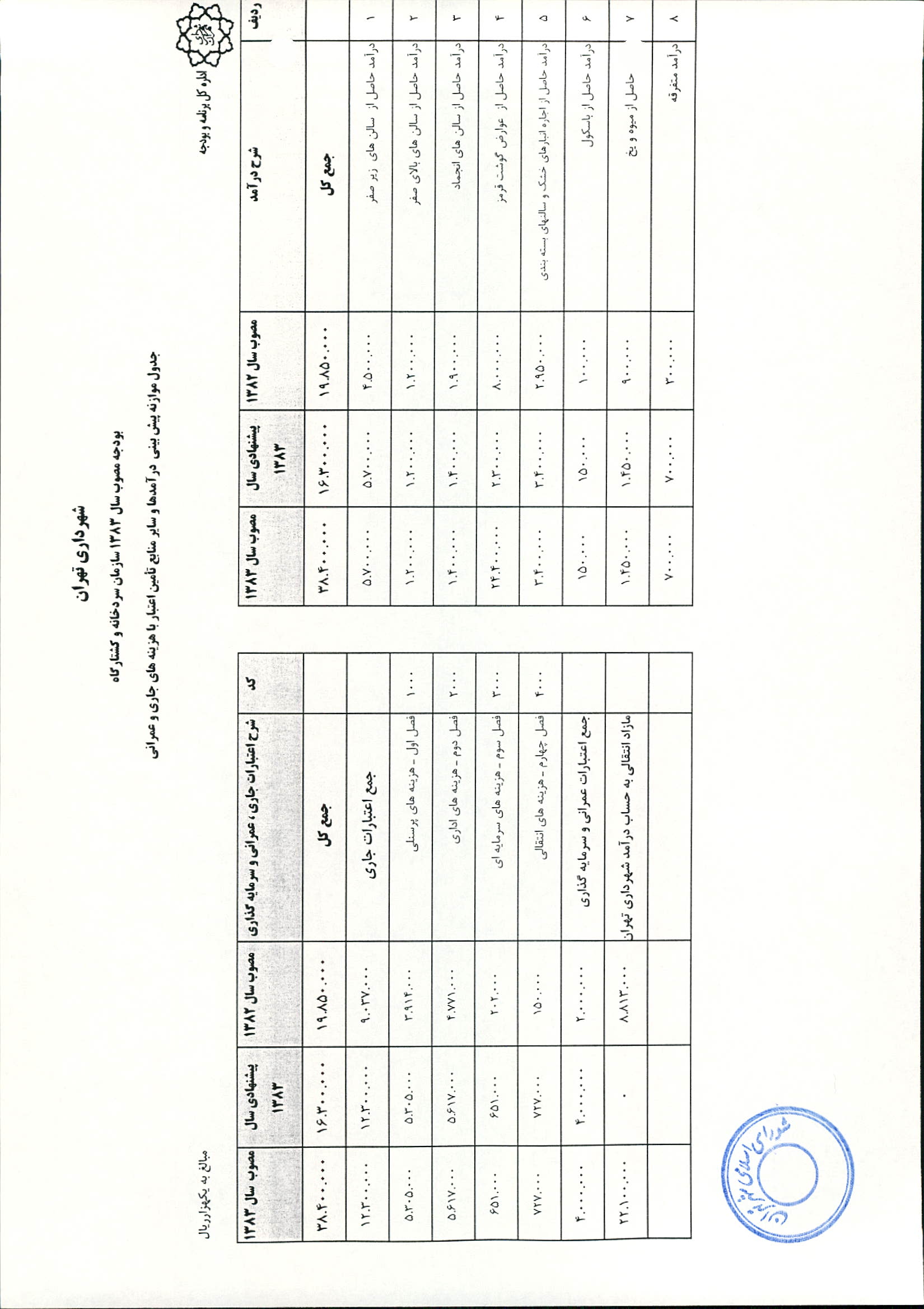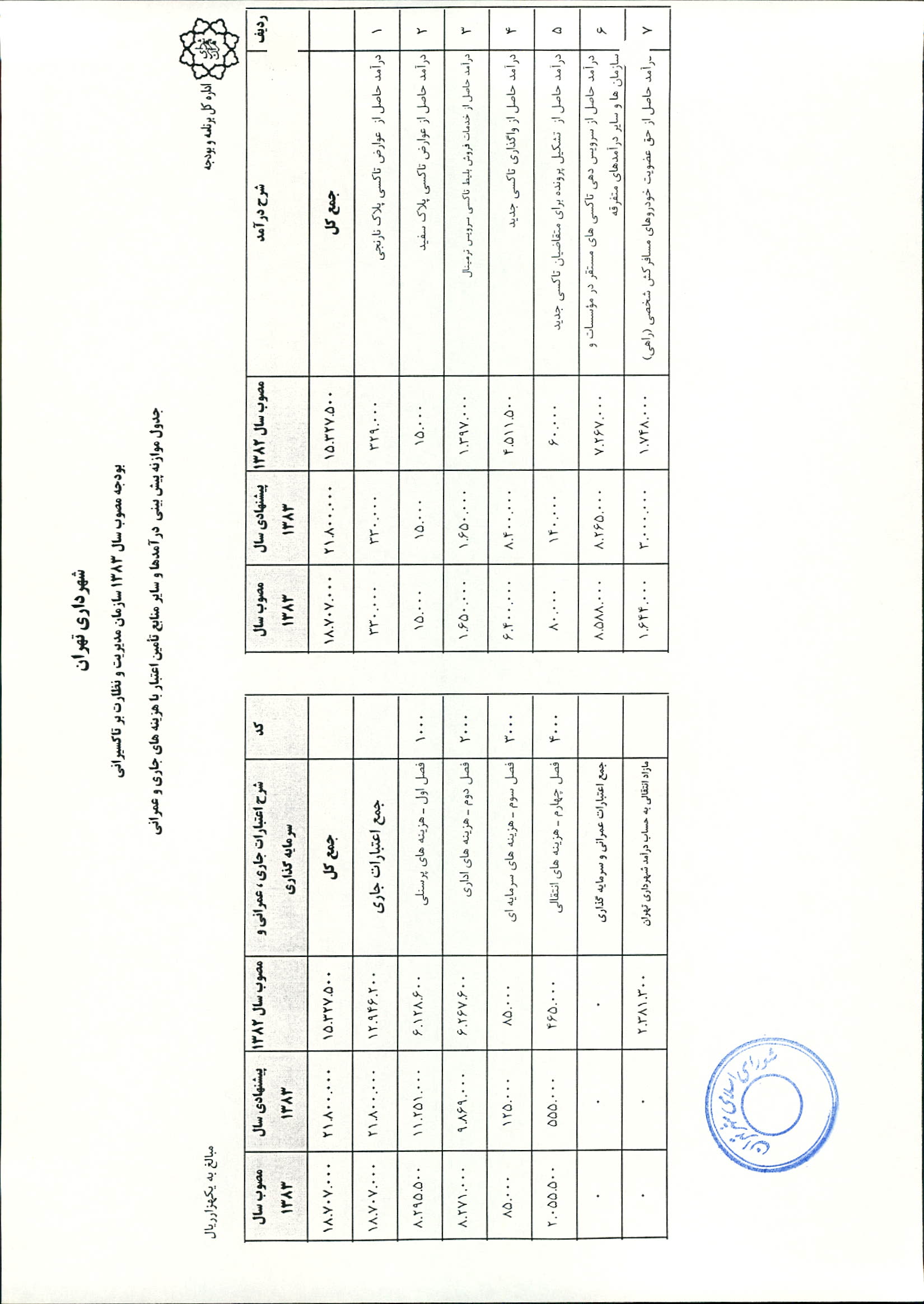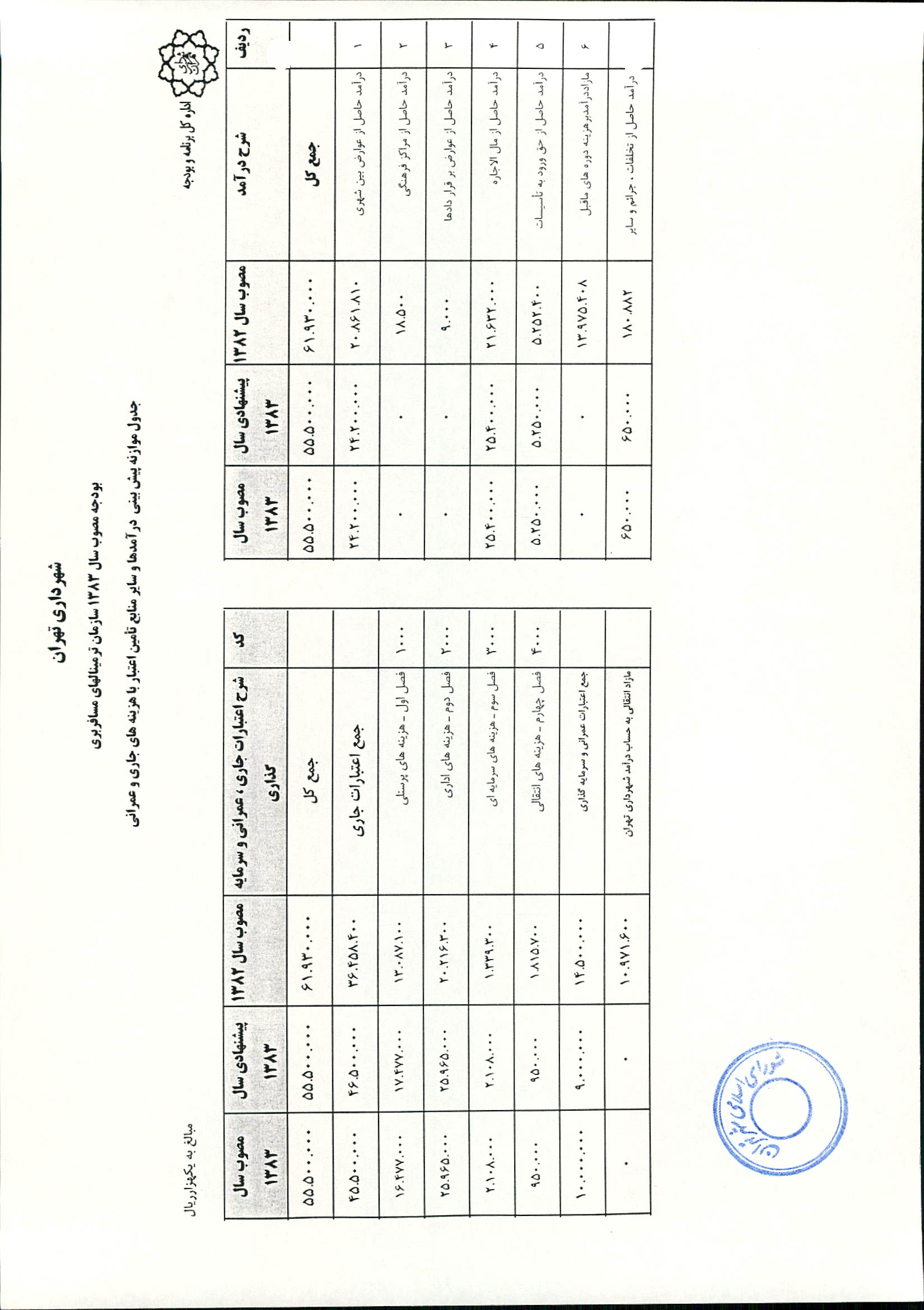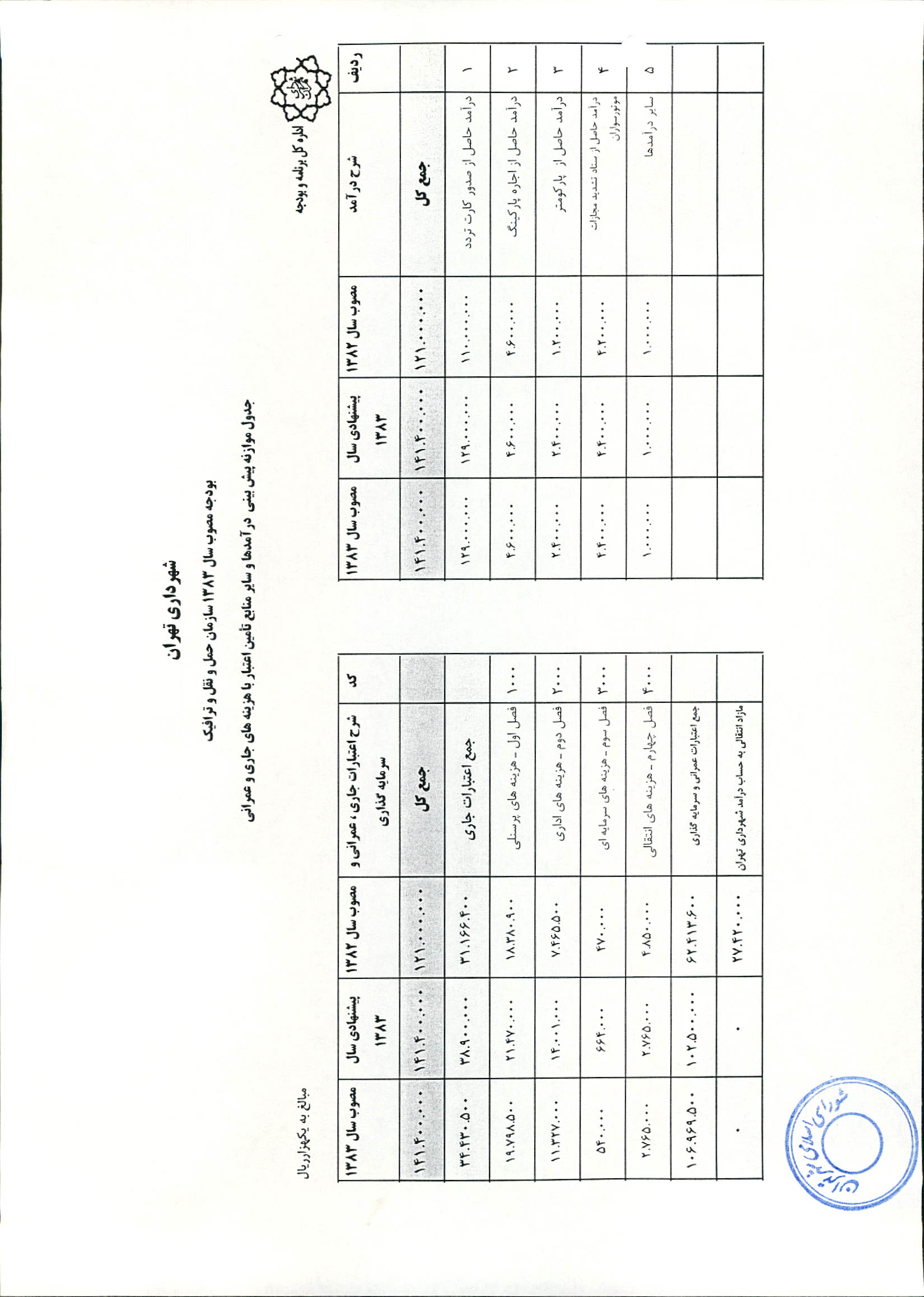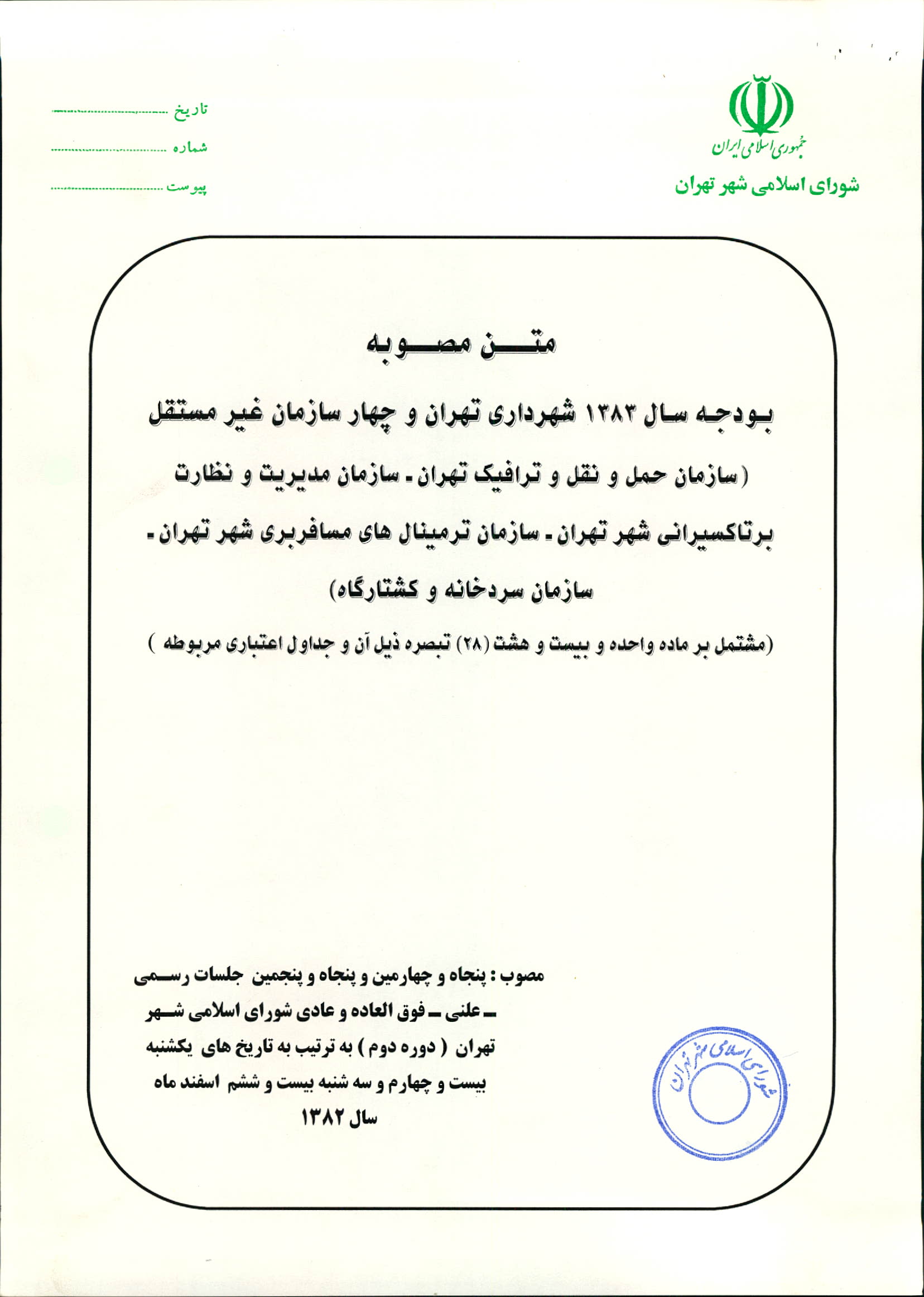 بودجه سال 1383 شهرداري تهران و چهار سازمان غيرمستقل (سازمان حمل و نقل و ترافيك تهران ـ سازمان مديريت و نظارت بر تاكسيراني شهر تهران ـ سازمان ترمينال‌هاي مسافربري شهر تهران ـ سازمان سردخانه و كشتارگاه)