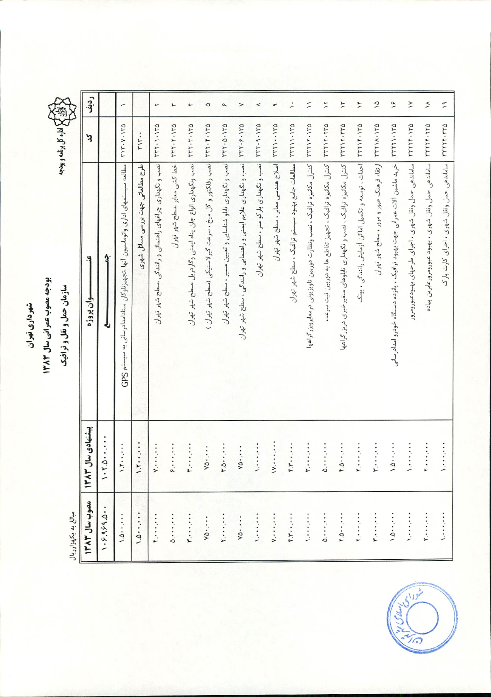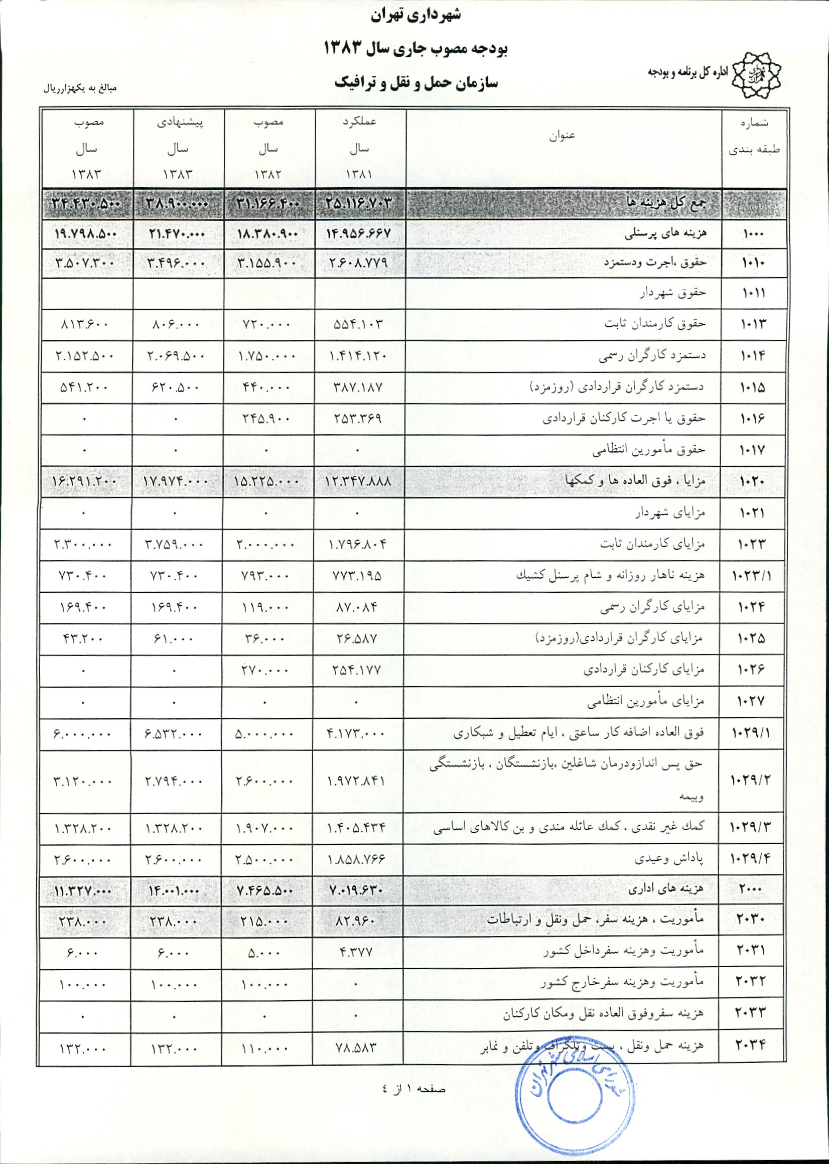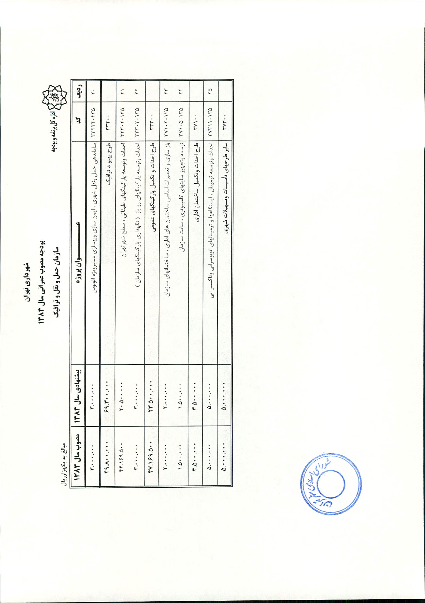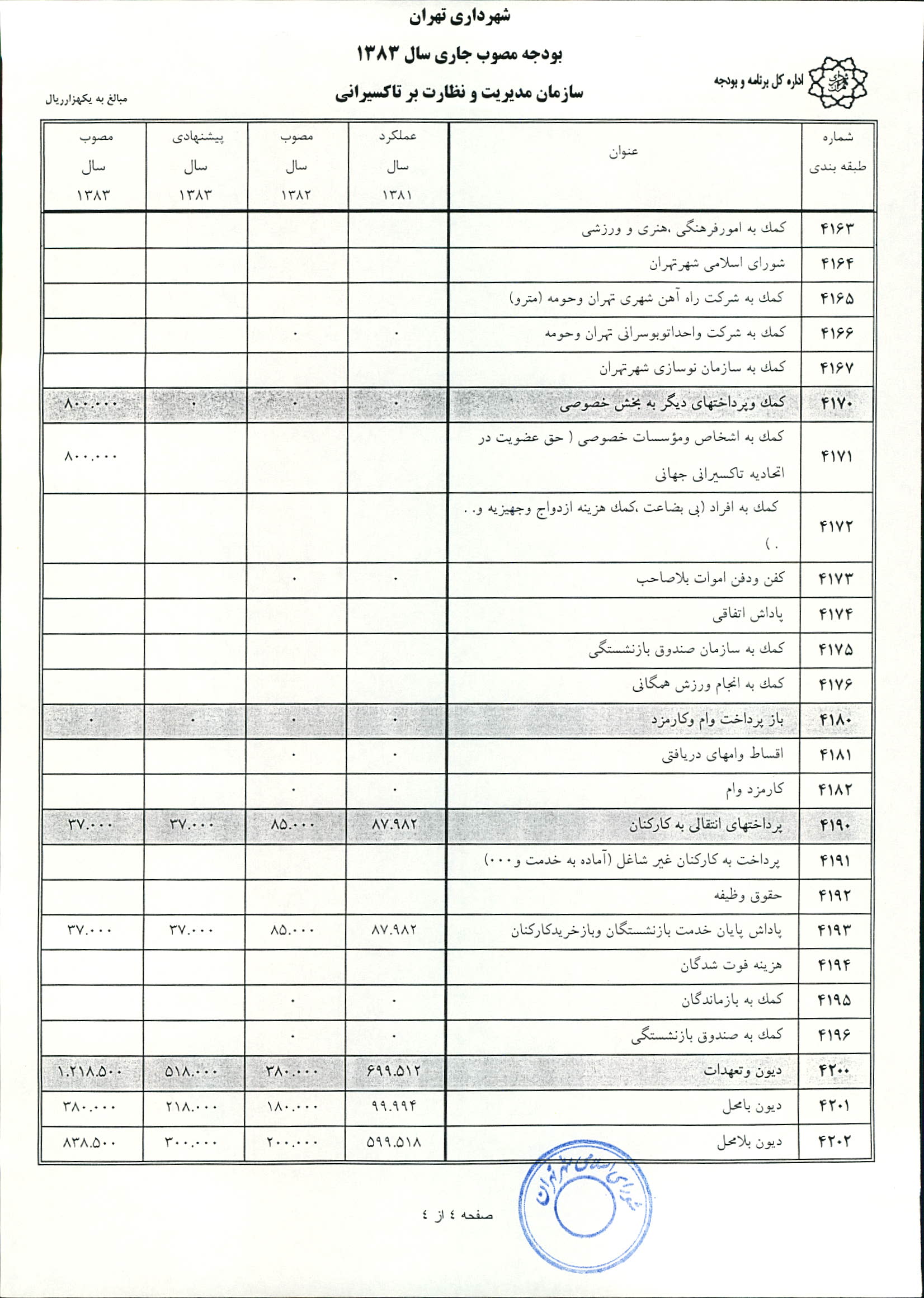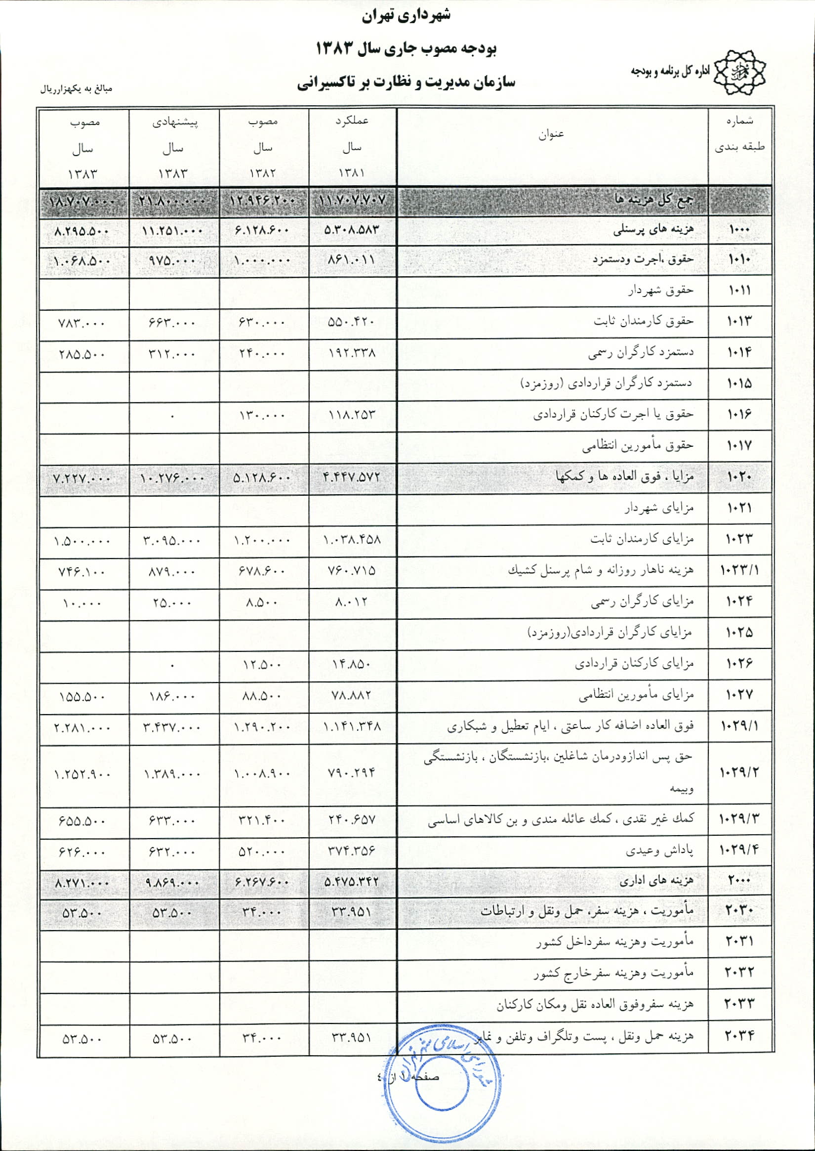 بودجه سال 1383 شهرداري تهران و چهار سازمان غيرمستقل (سازمان حمل و نقل و ترافيك تهران ـ سازمان مديريت و نظارت بر تاكسيراني شهر تهران ـ سازمان ترمينال‌هاي مسافربري شهر تهران ـ سازمان سردخانه و كشتارگاه)