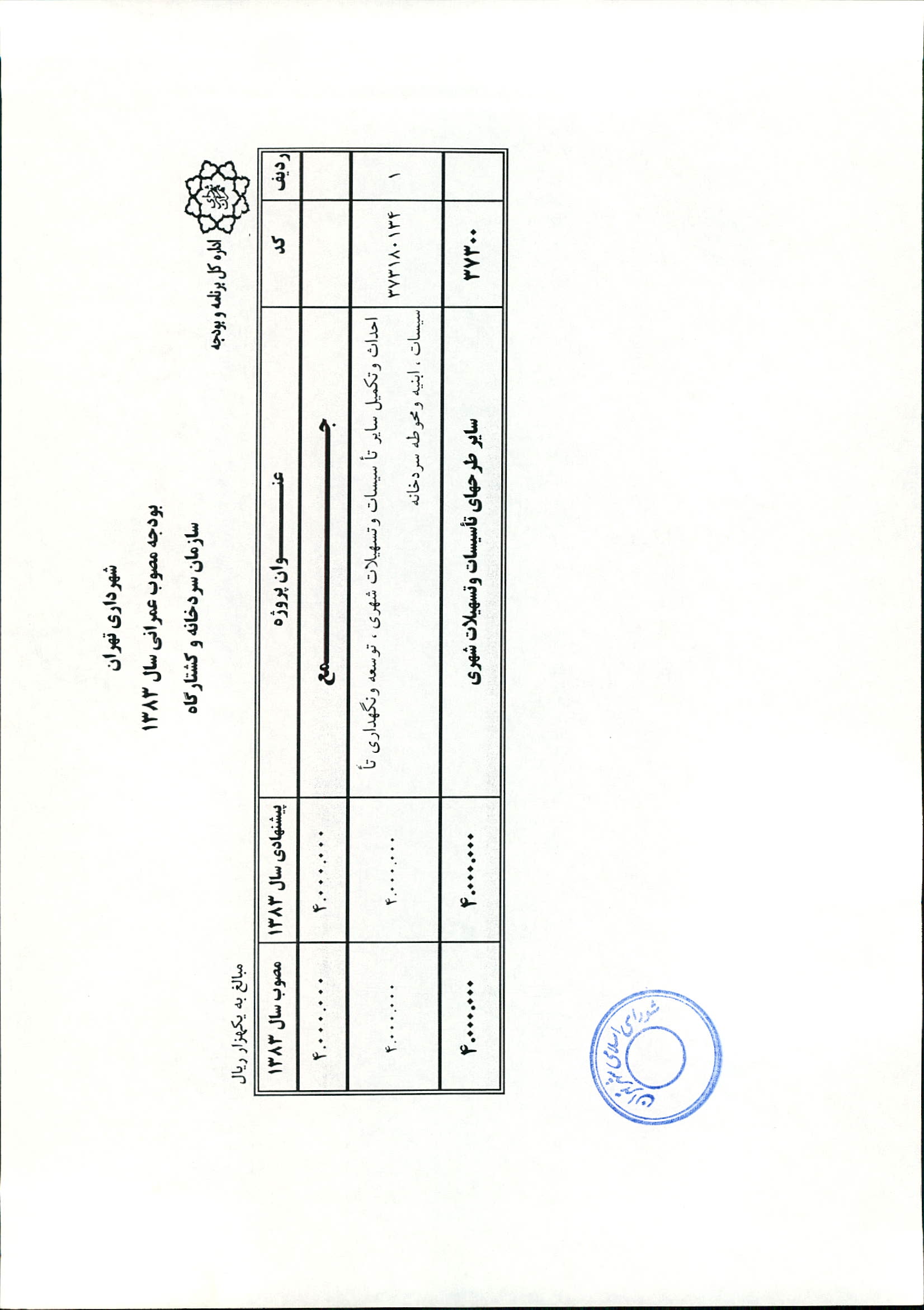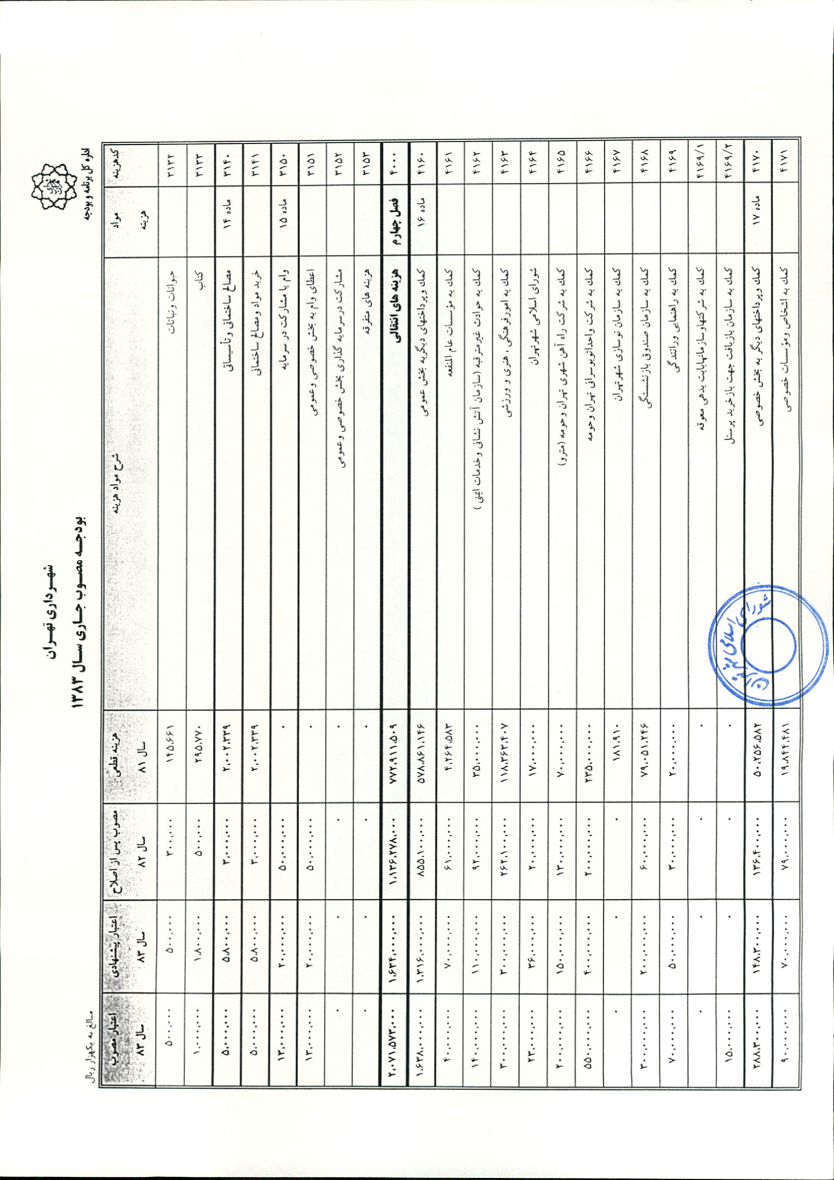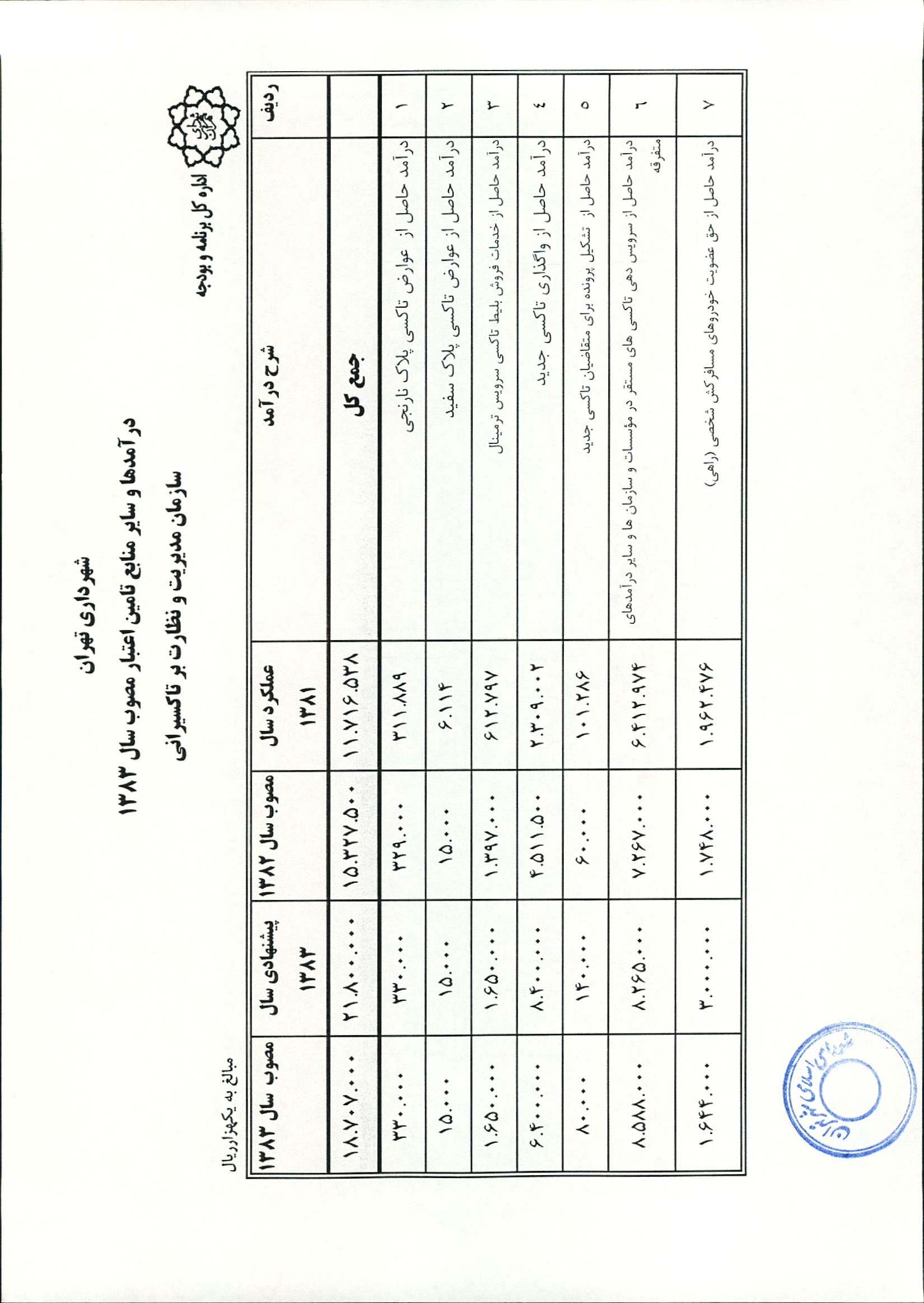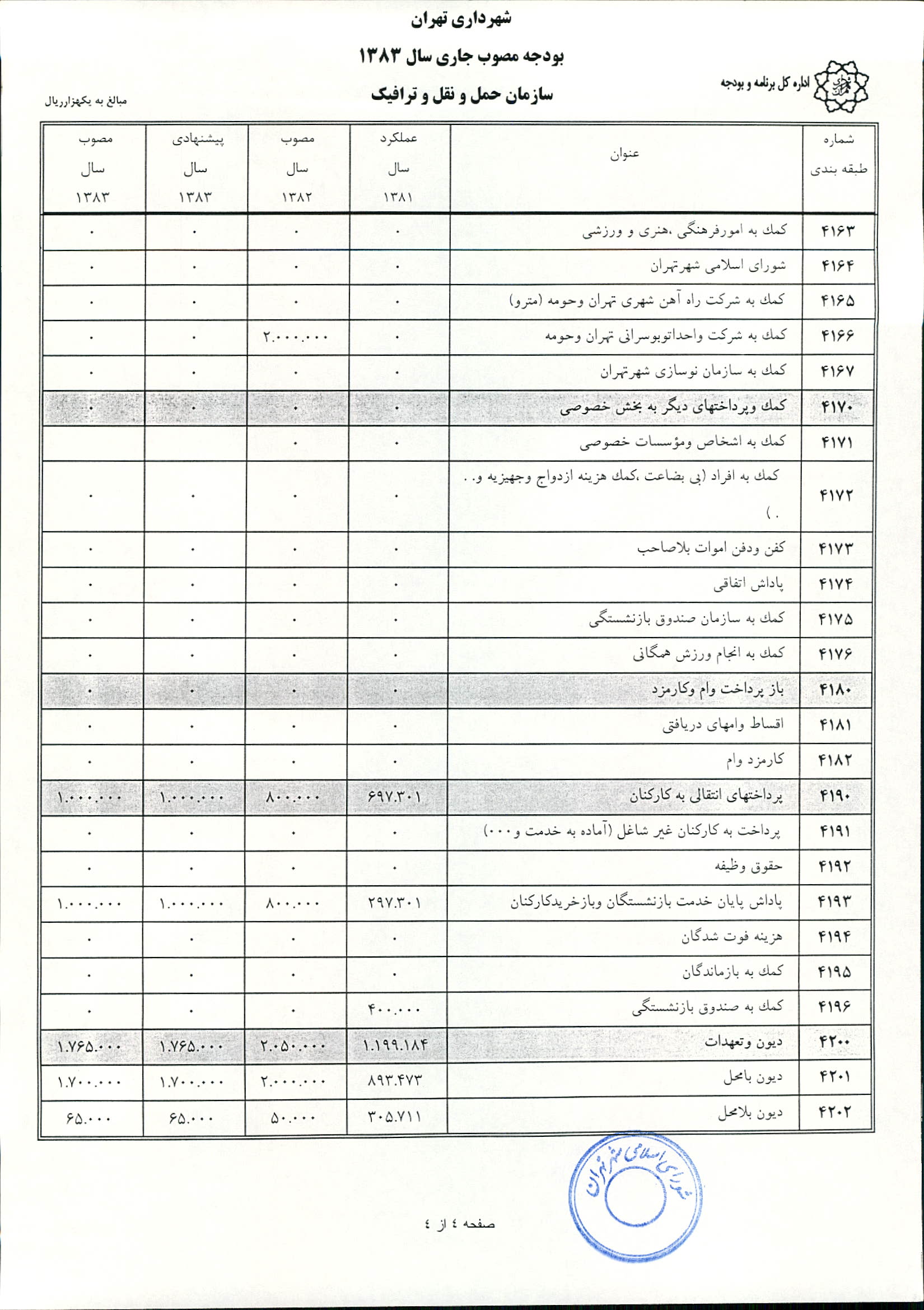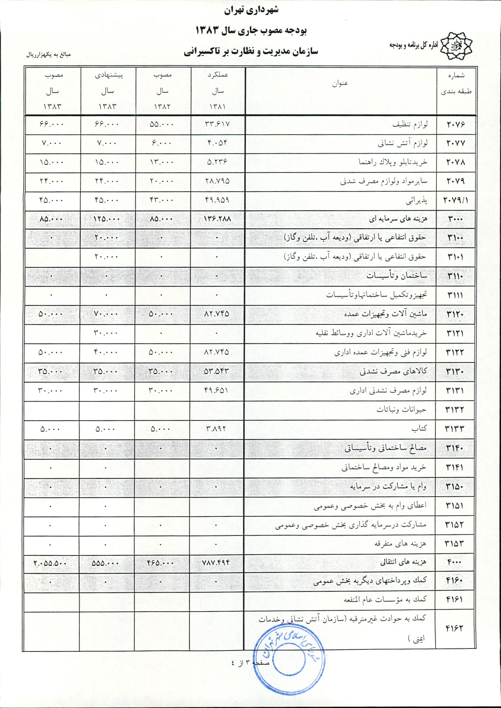 بودجه سال 1383 شهرداري تهران و چهار سازمان غيرمستقل (سازمان حمل و نقل و ترافيك تهران ـ سازمان مديريت و نظارت بر تاكسيراني شهر تهران ـ سازمان ترمينال‌هاي مسافربري شهر تهران ـ سازمان سردخانه و كشتارگاه)