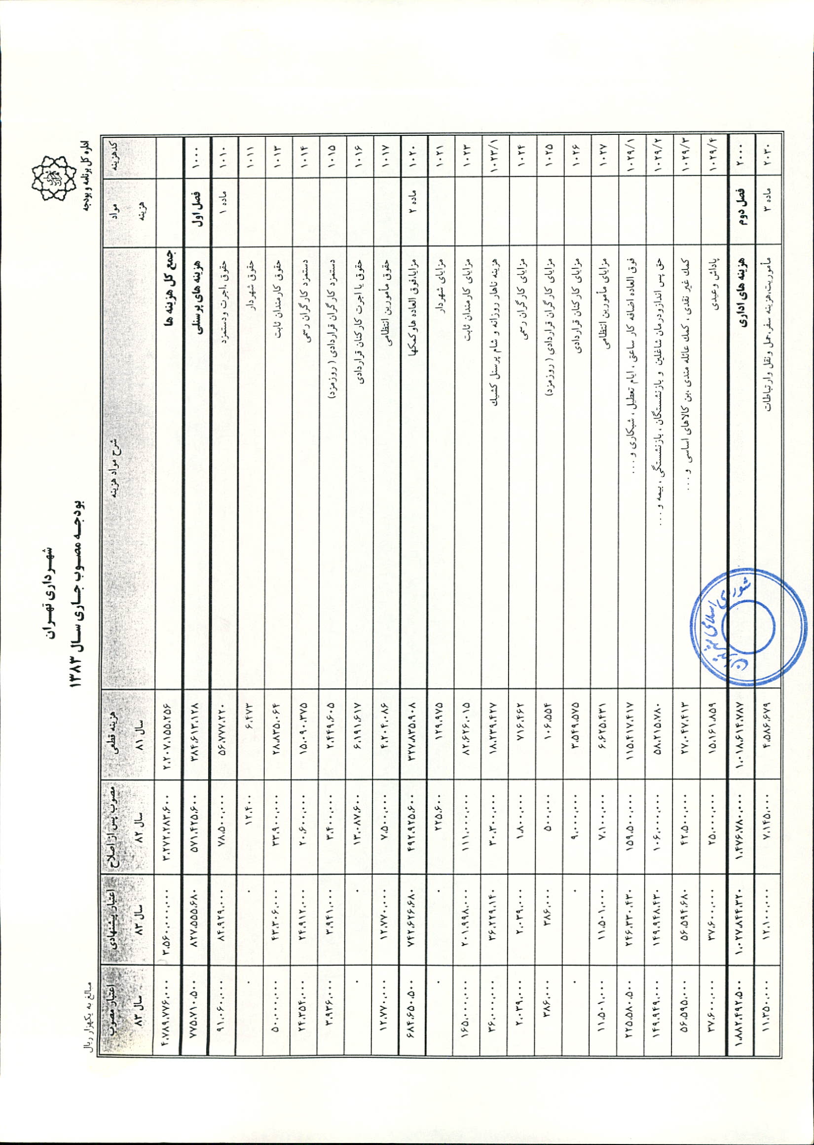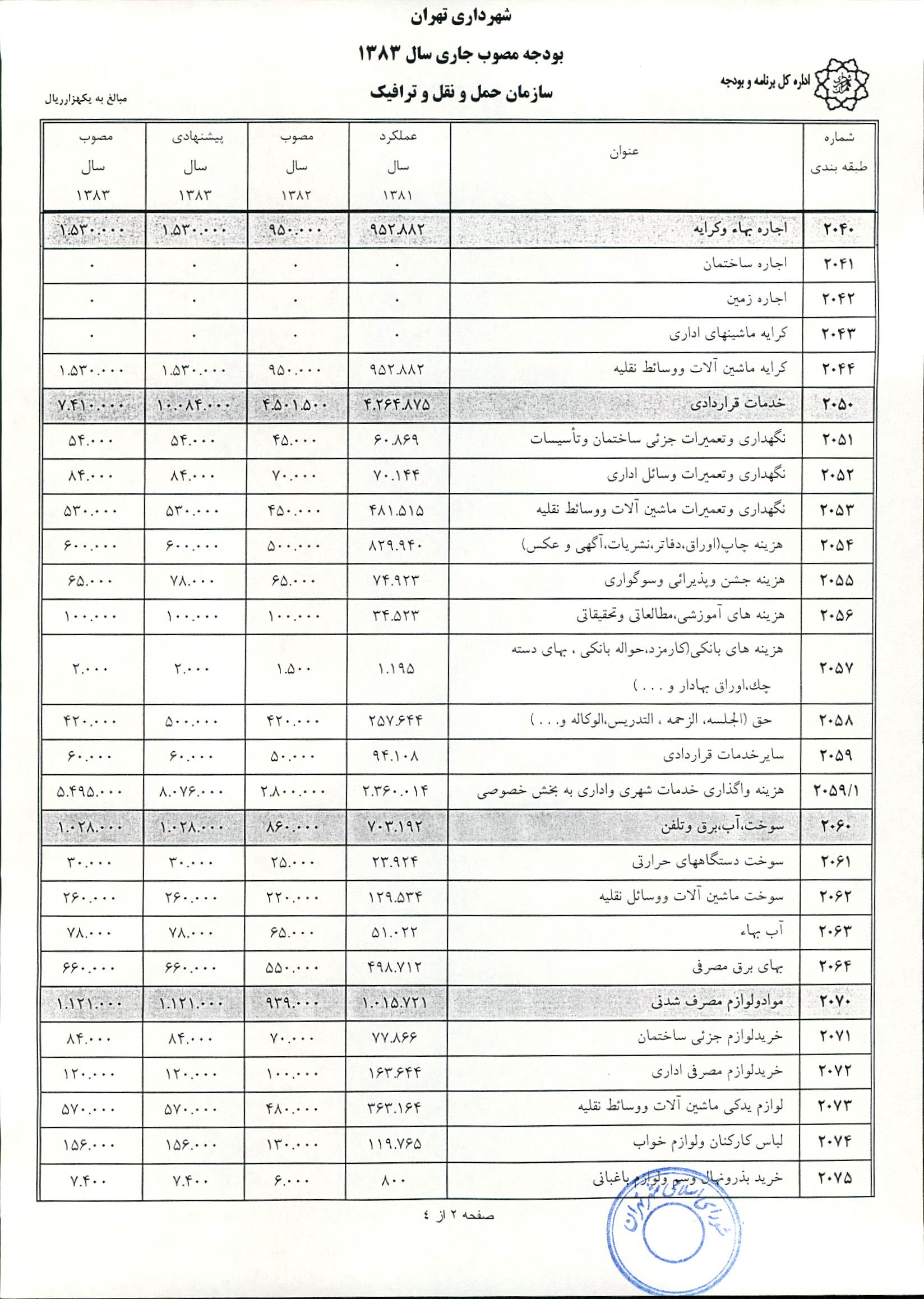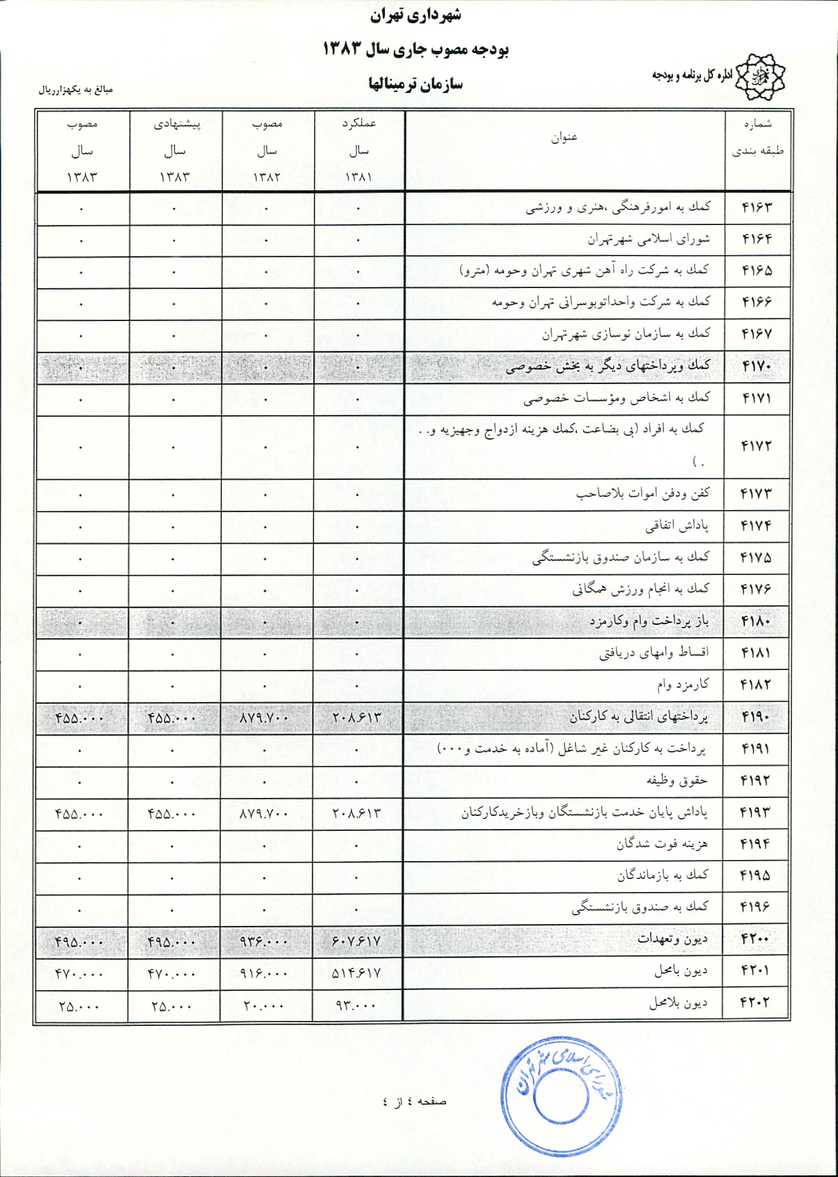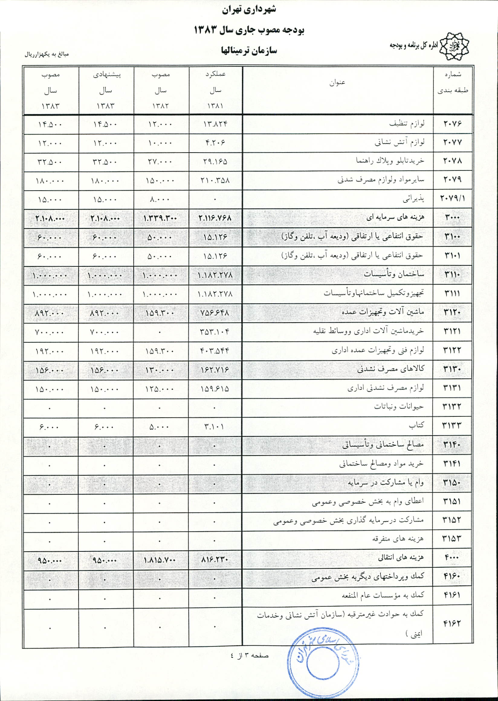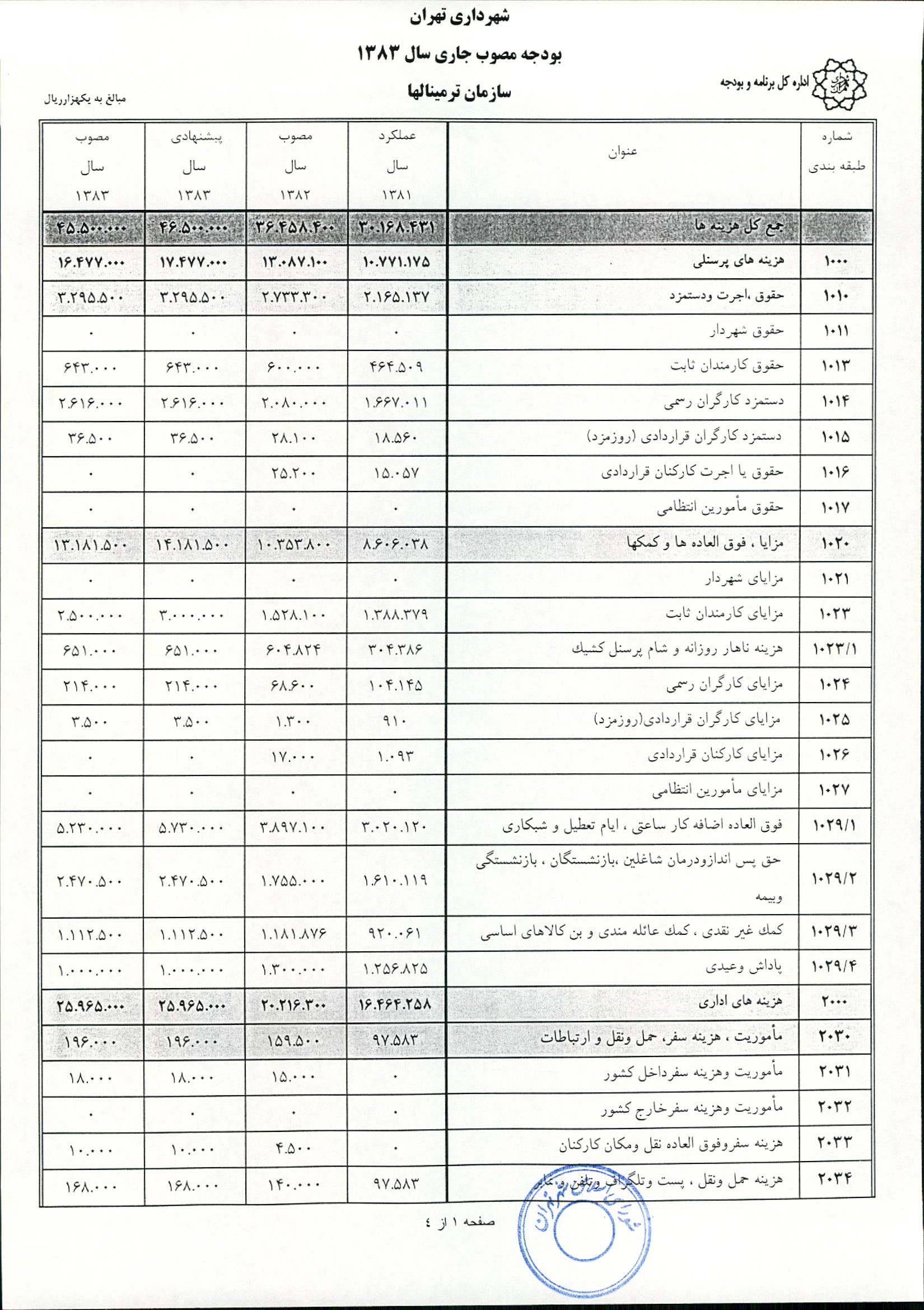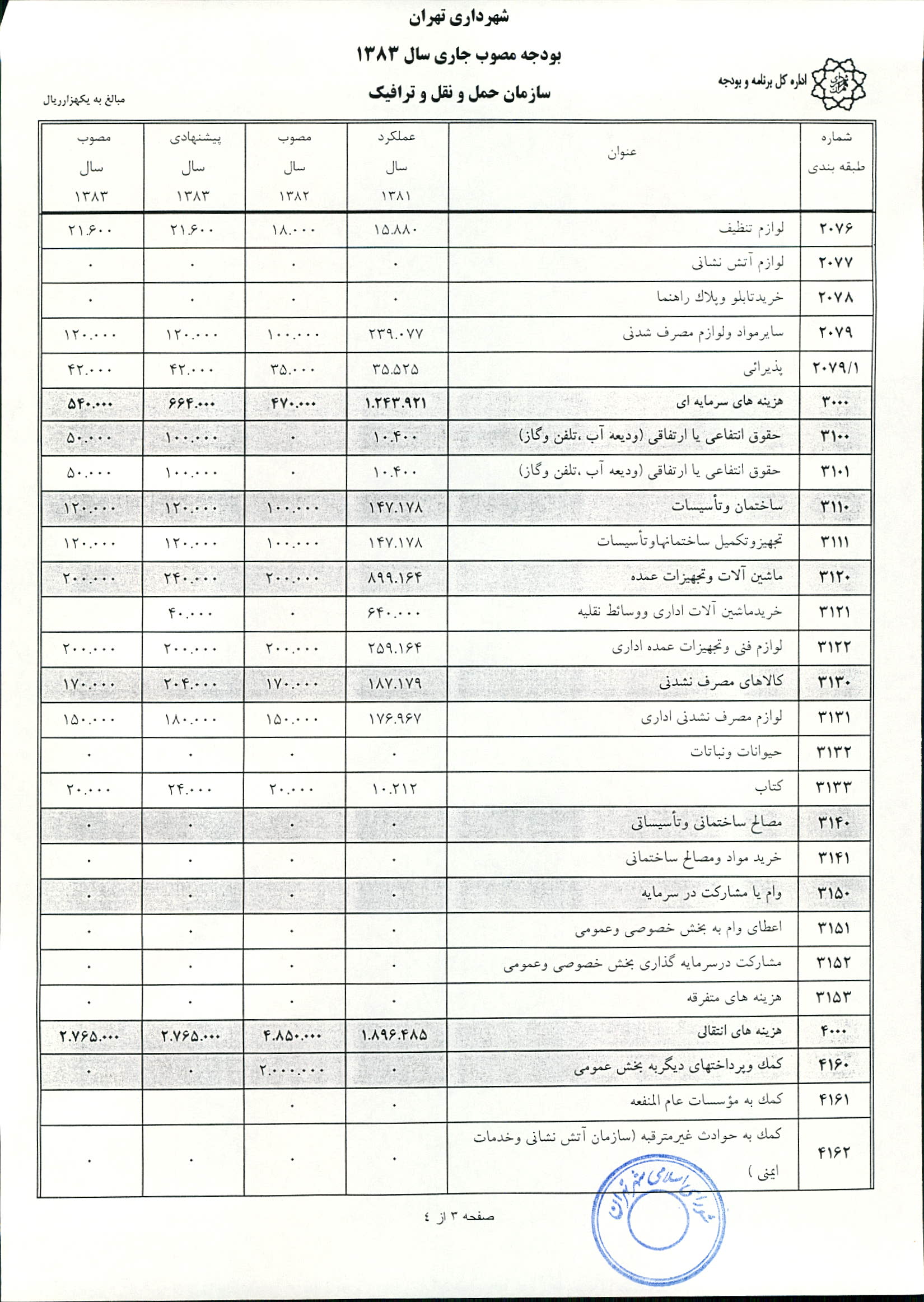بودجه سال 1383 شهرداري تهران و چهار سازمان غيرمستقل (سازمان حمل و نقل و ترافيك تهران ـ سازمان مديريت و نظارت بر تاكسيراني شهر تهران ـ سازمان ترمينال‌هاي مسافربري شهر تهران ـ سازمان سردخانه و كشتارگاه)
