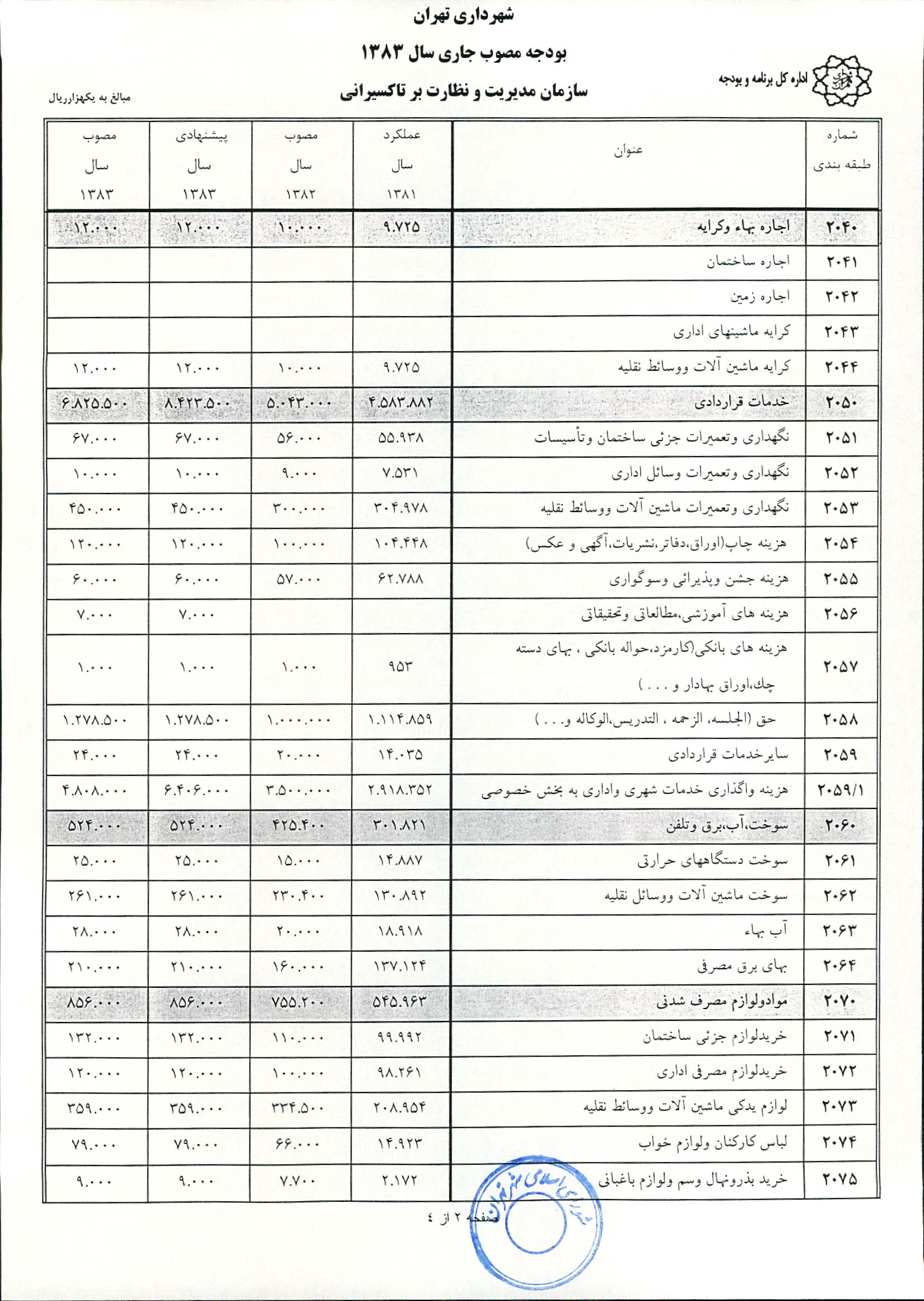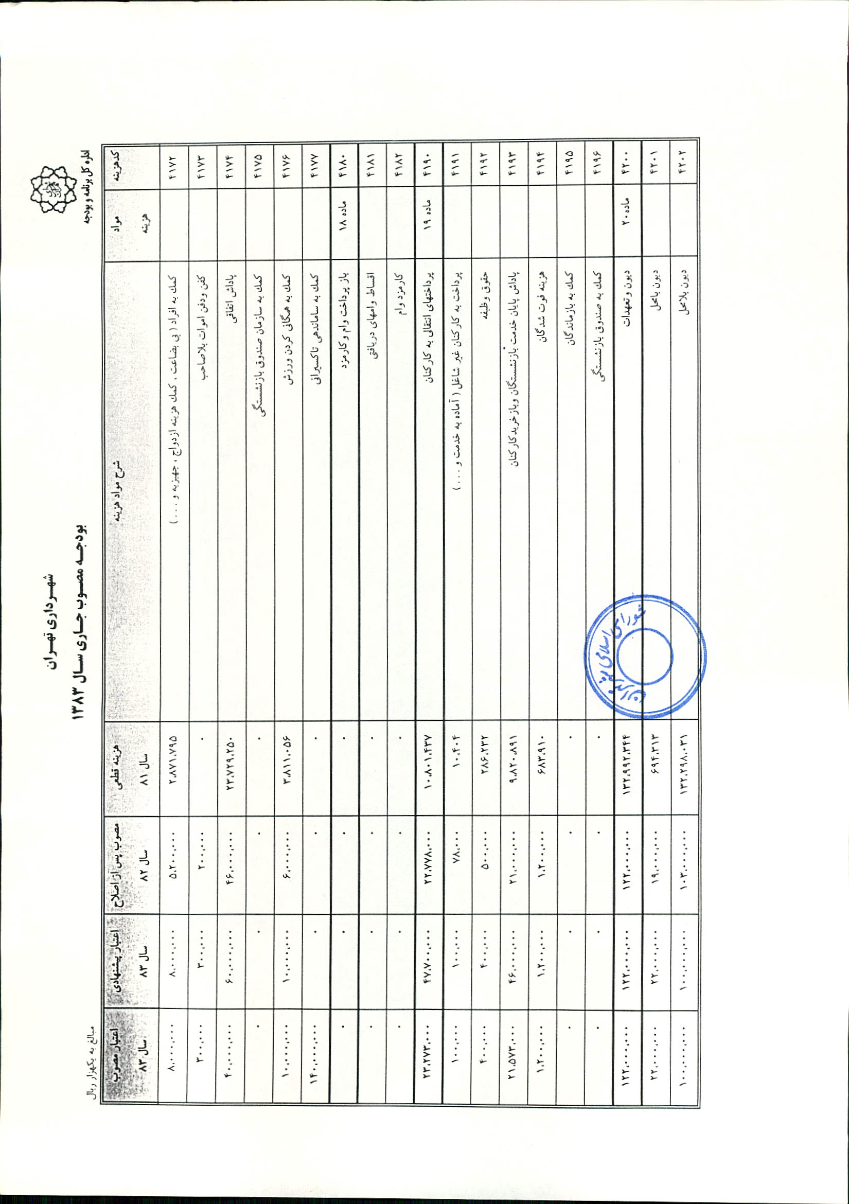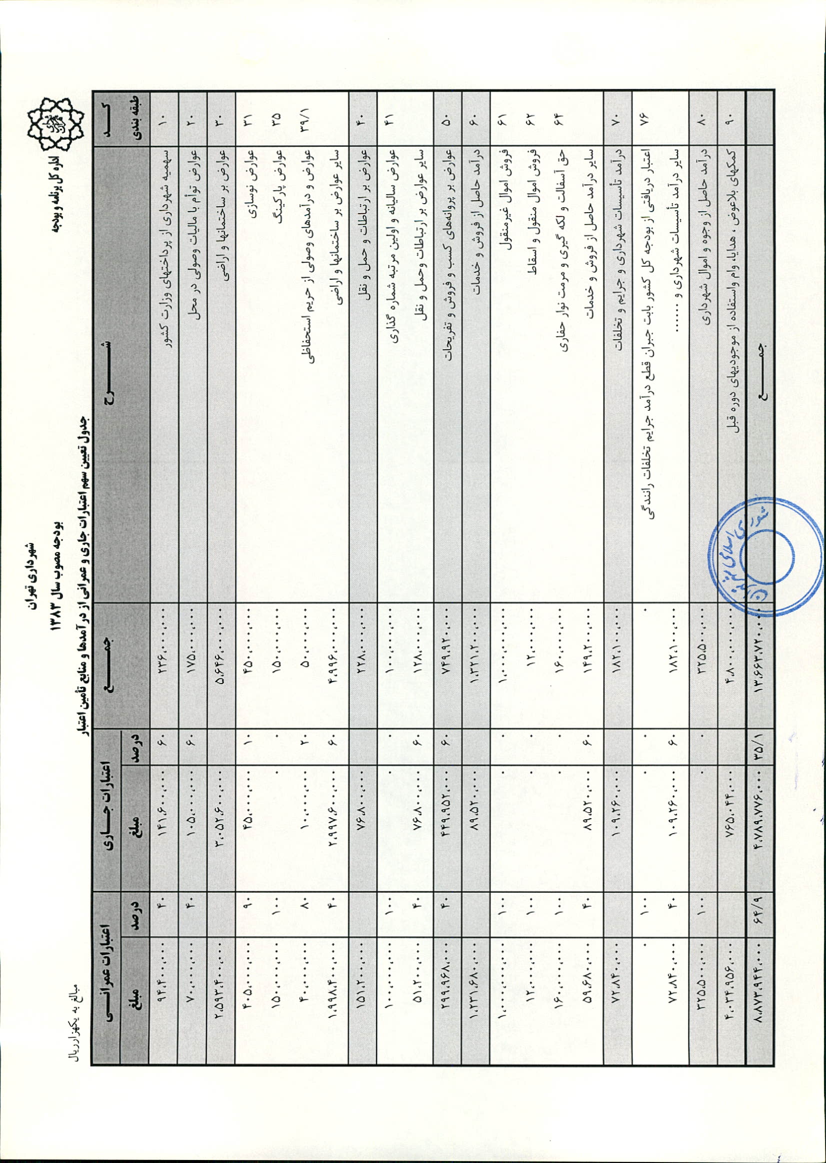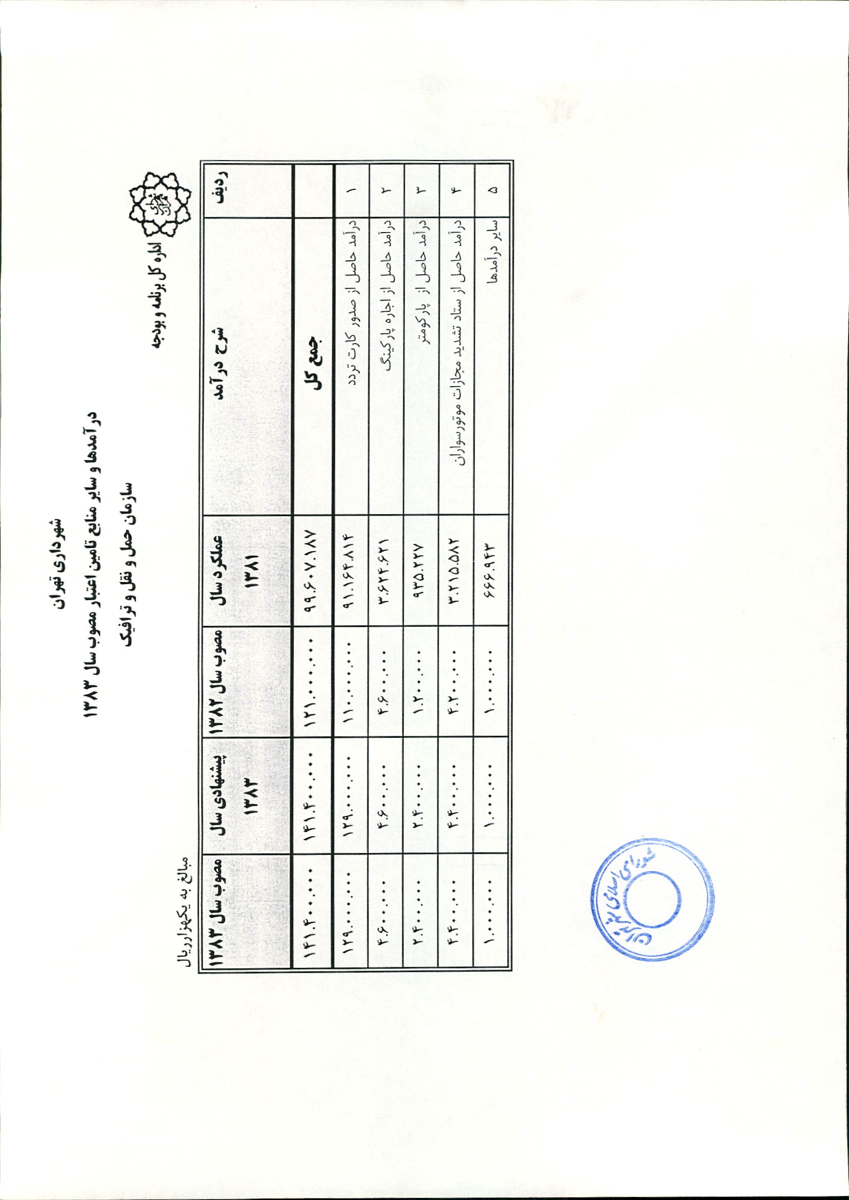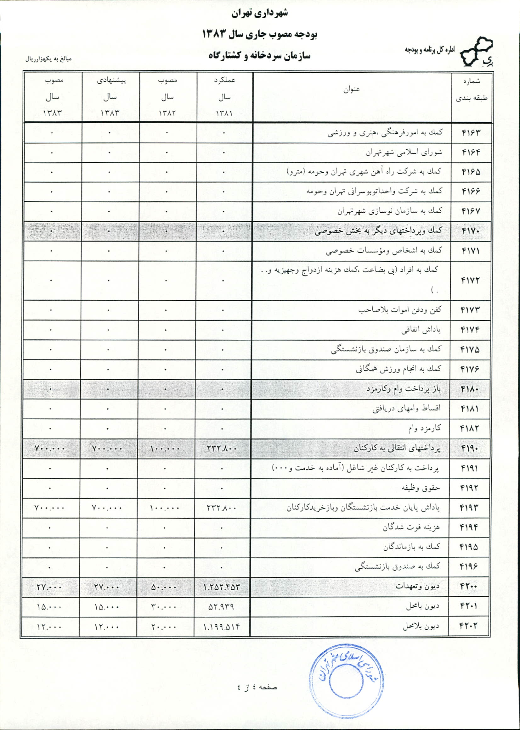 بودجه سال 1383 شهرداري تهران و چهار سازمان غيرمستقل (سازمان حمل و نقل و ترافيك تهران ـ سازمان مديريت و نظارت بر تاكسيراني شهر تهران ـ سازمان ترمينال‌هاي مسافربري شهر تهران ـ سازمان سردخانه و كشتارگاه)