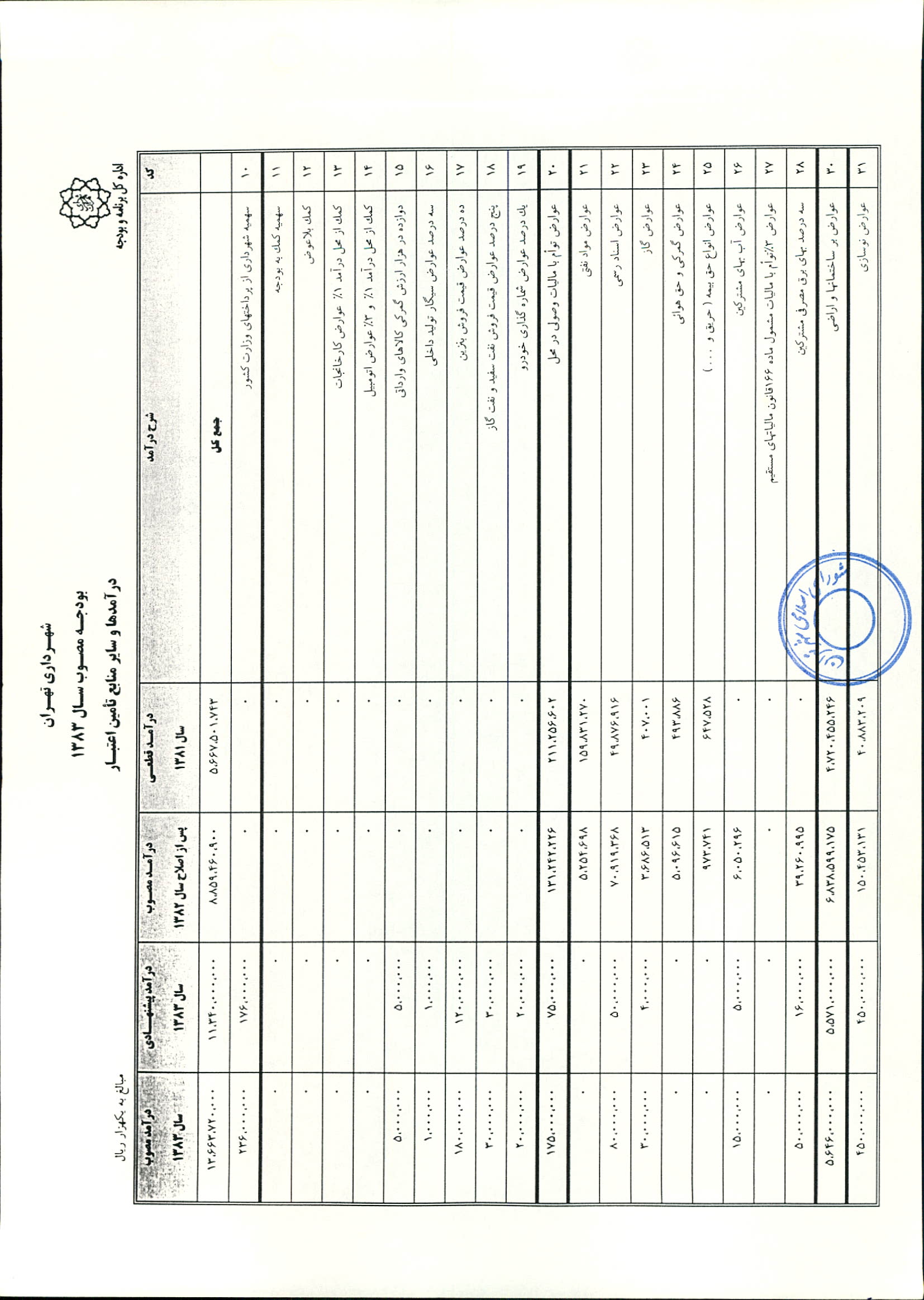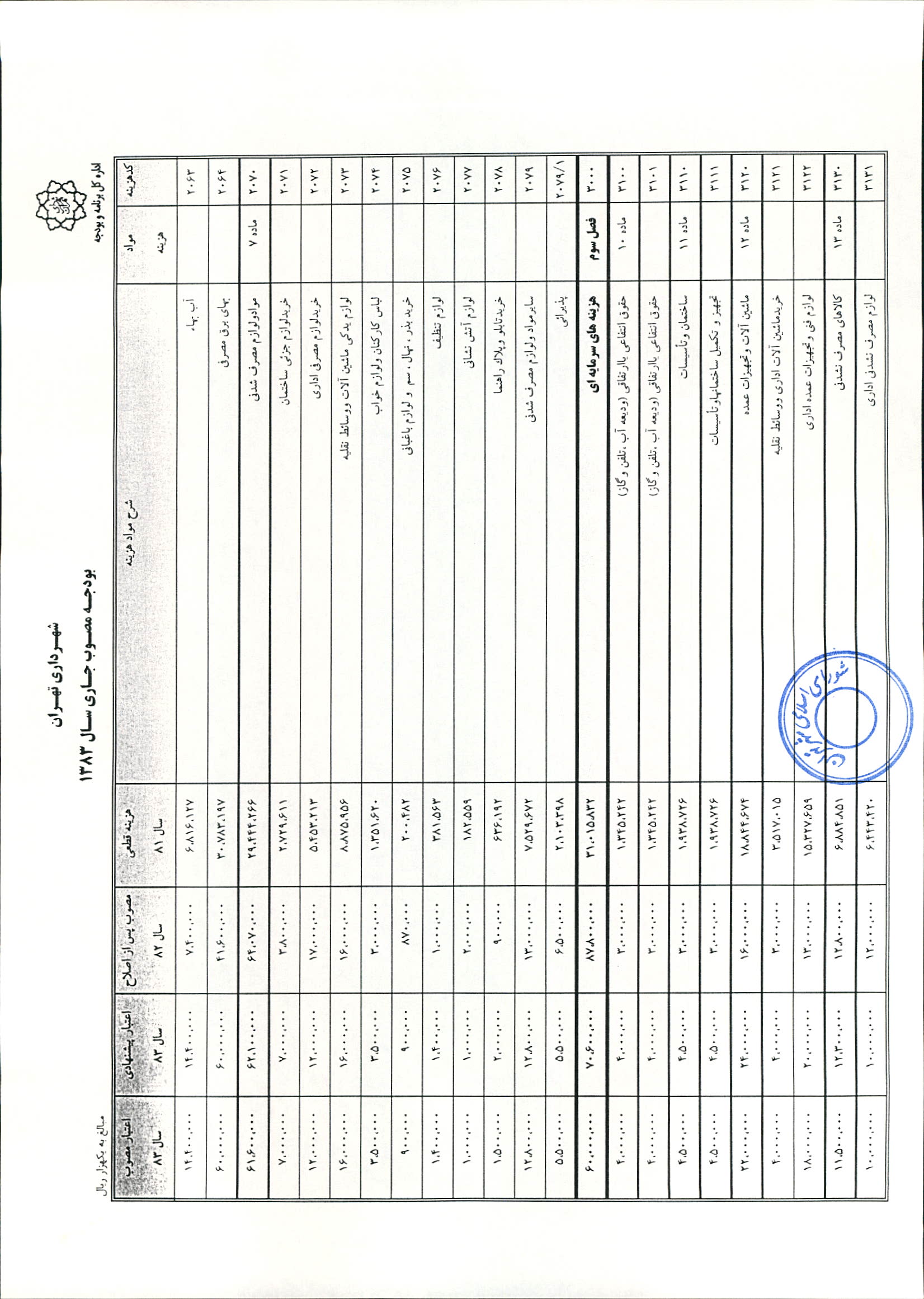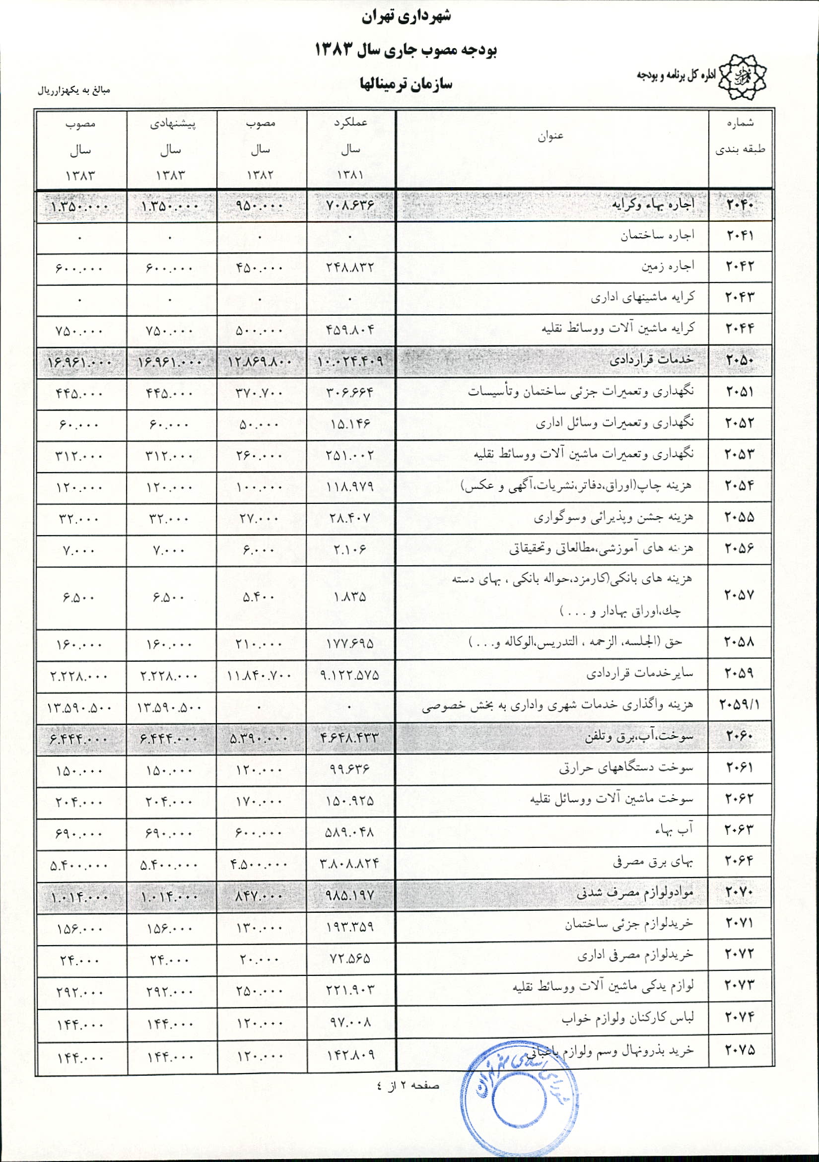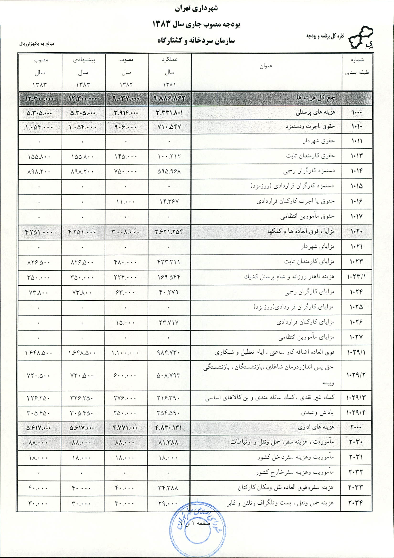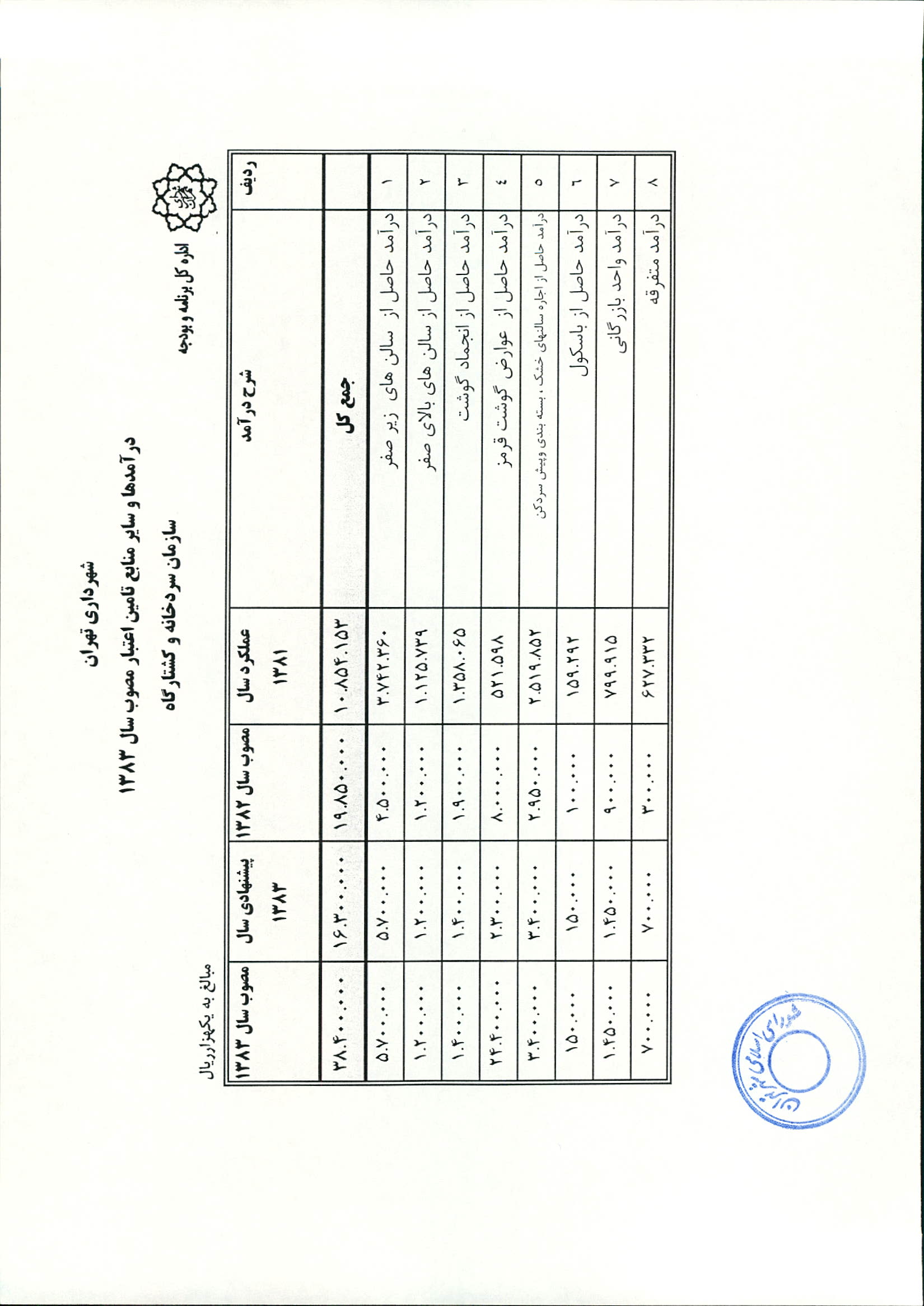 بودجه سال 1383 شهرداري تهران و چهار سازمان غيرمستقل (سازمان حمل و نقل و ترافيك تهران ـ سازمان مديريت و نظارت بر تاكسيراني شهر تهران ـ سازمان ترمينال‌هاي مسافربري شهر تهران ـ سازمان سردخانه و كشتارگاه)