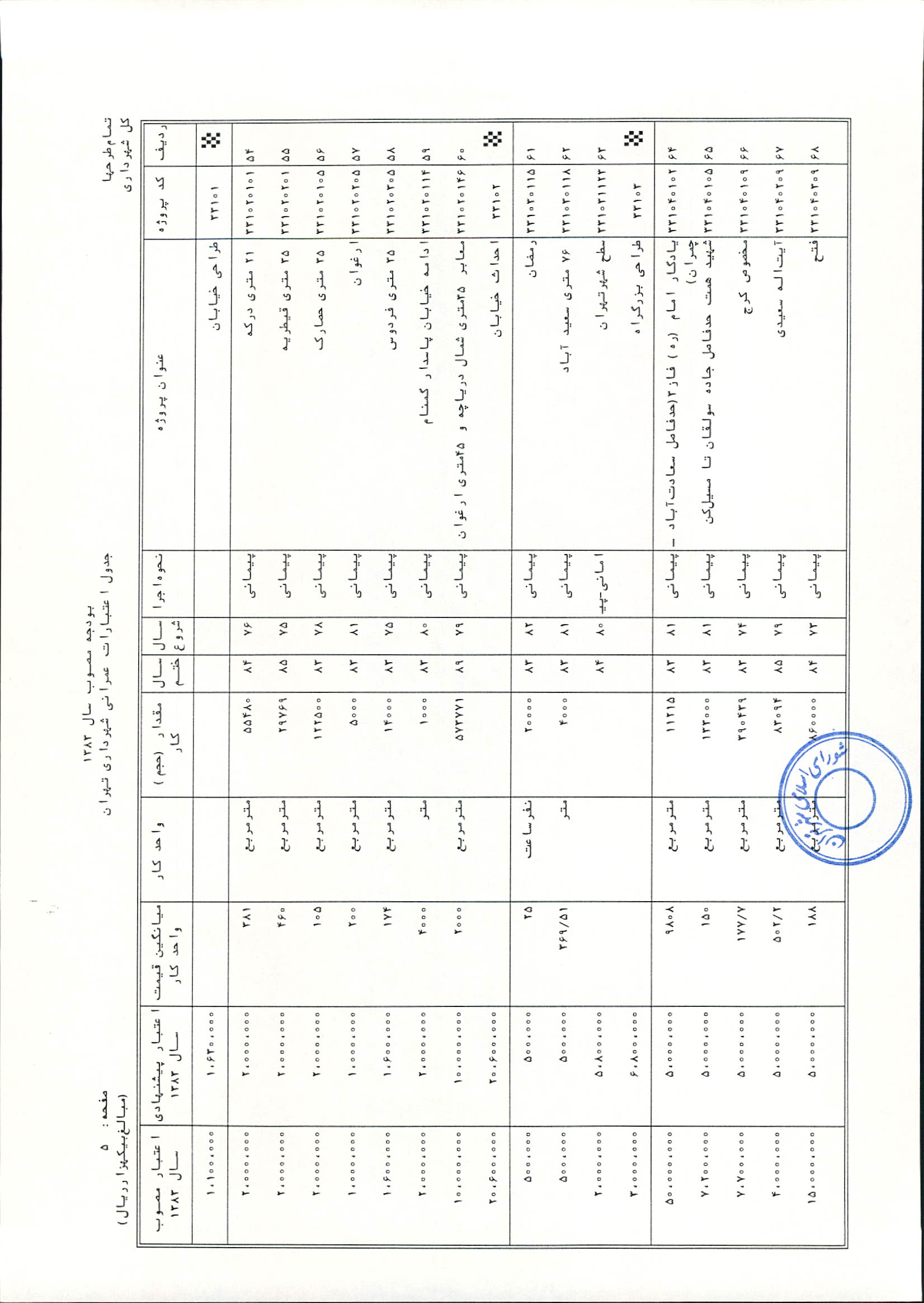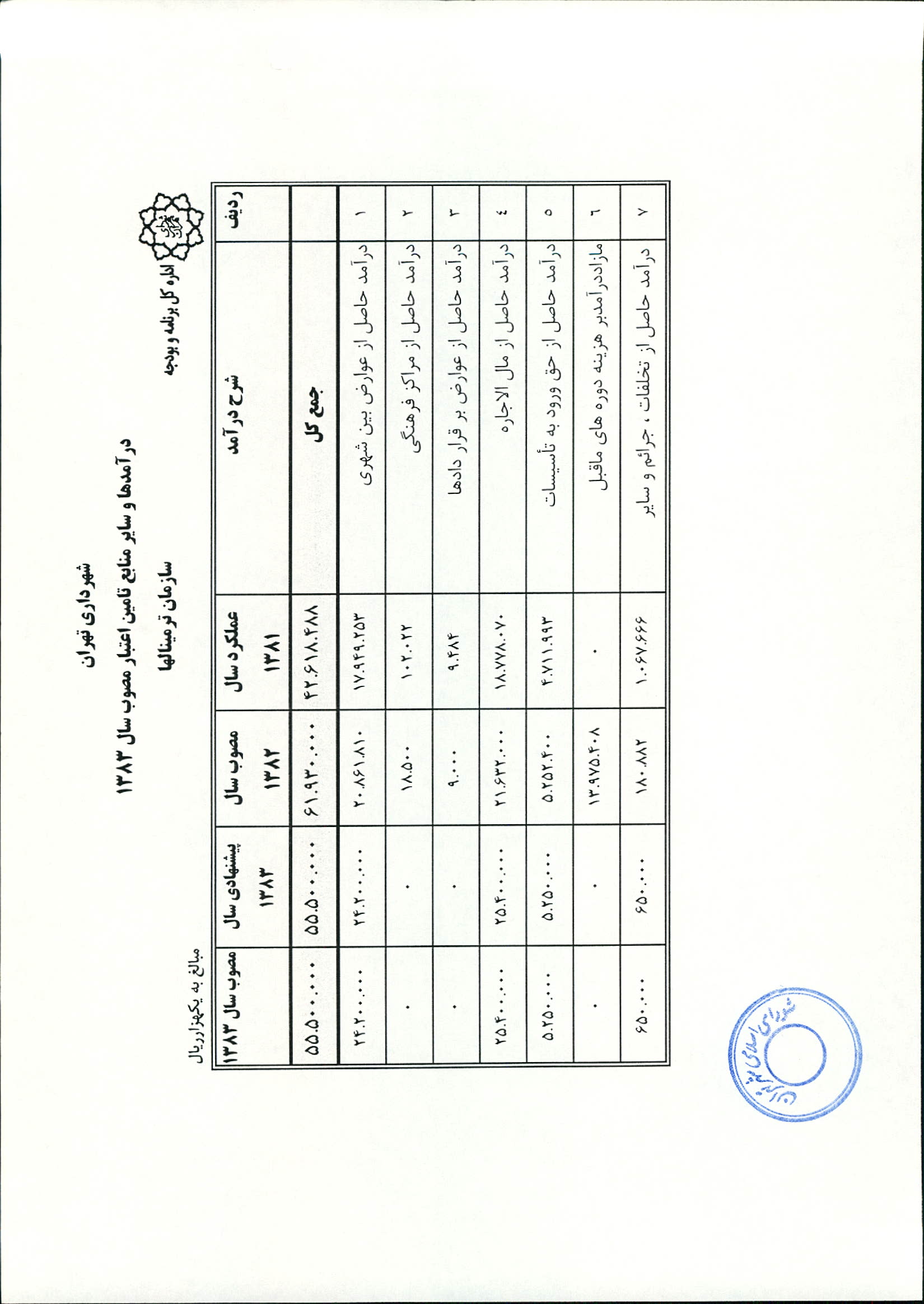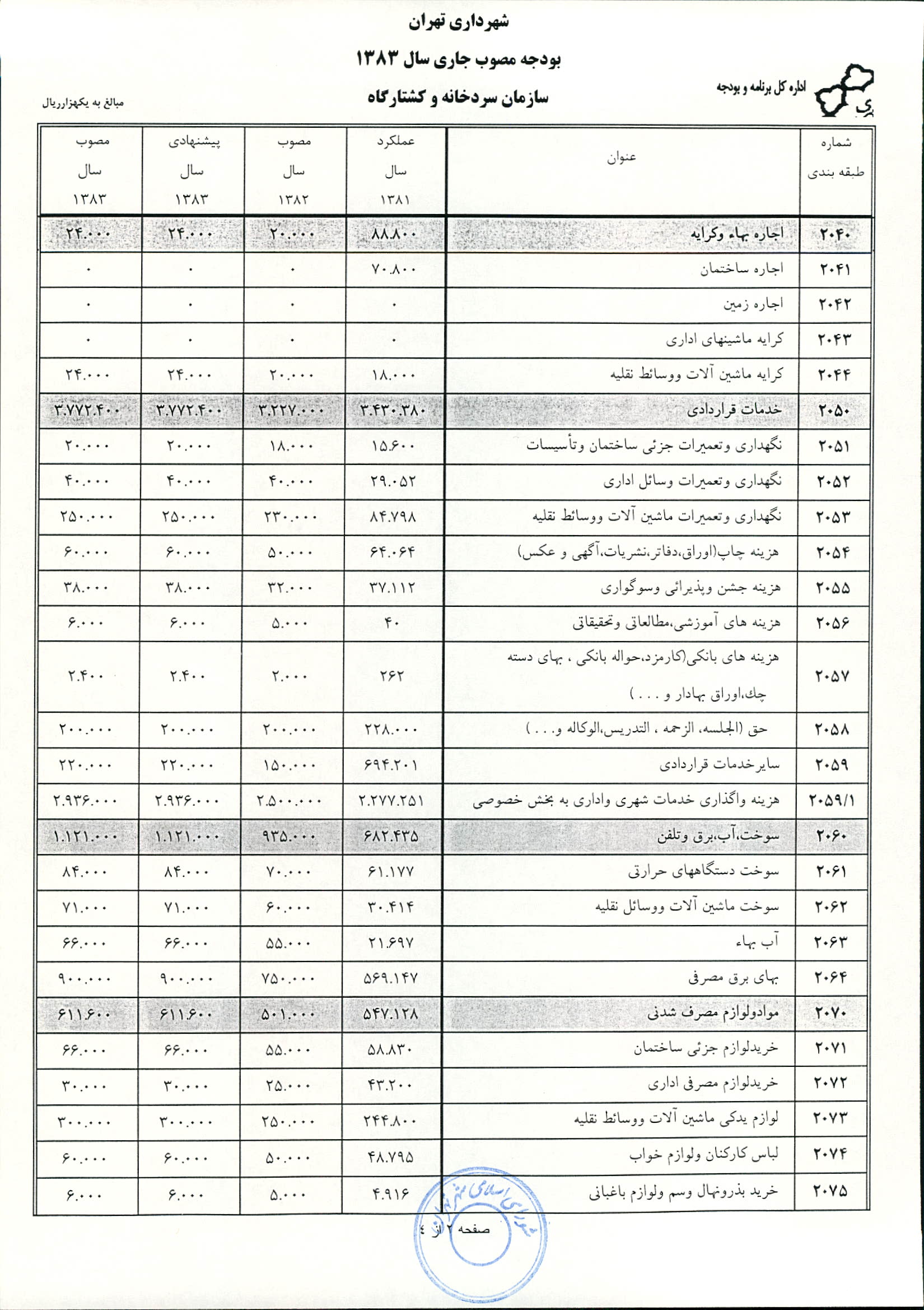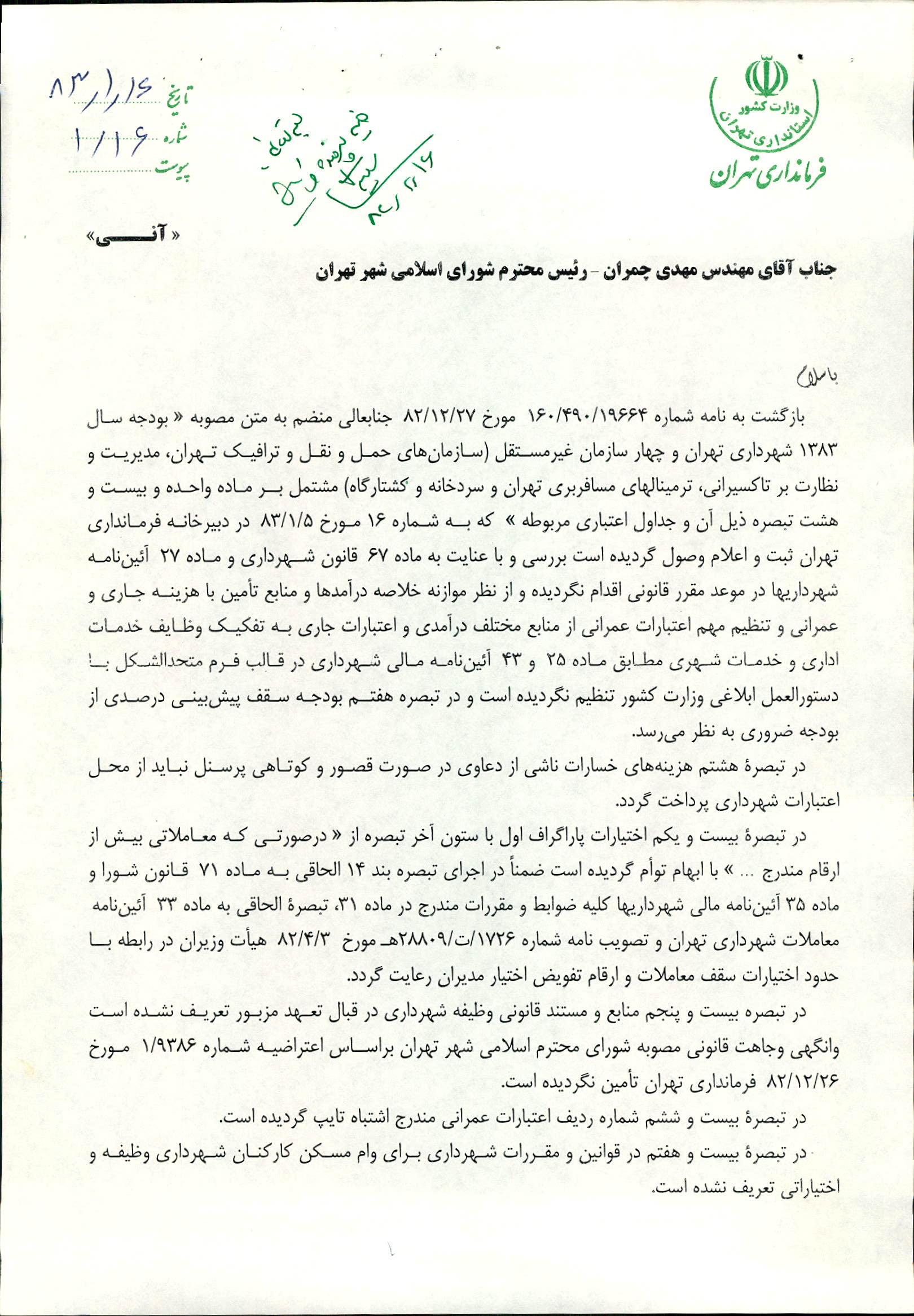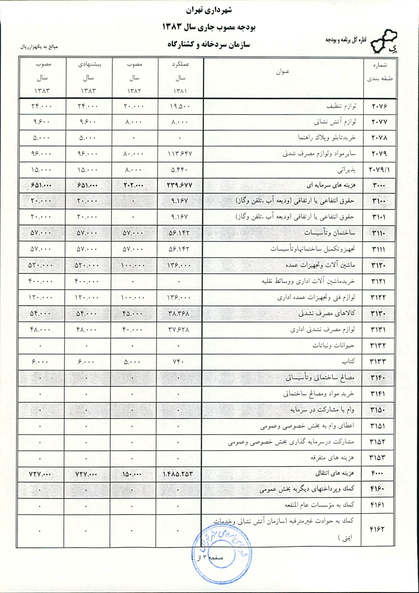 بودجه سال 1383 شهرداري تهران و چهار سازمان غيرمستقل (سازمان حمل و نقل و ترافيك تهران ـ سازمان مديريت و نظارت بر تاكسيراني شهر تهران ـ سازمان ترمينال‌هاي مسافربري شهر تهران ـ سازمان سردخانه و كشتارگاه)