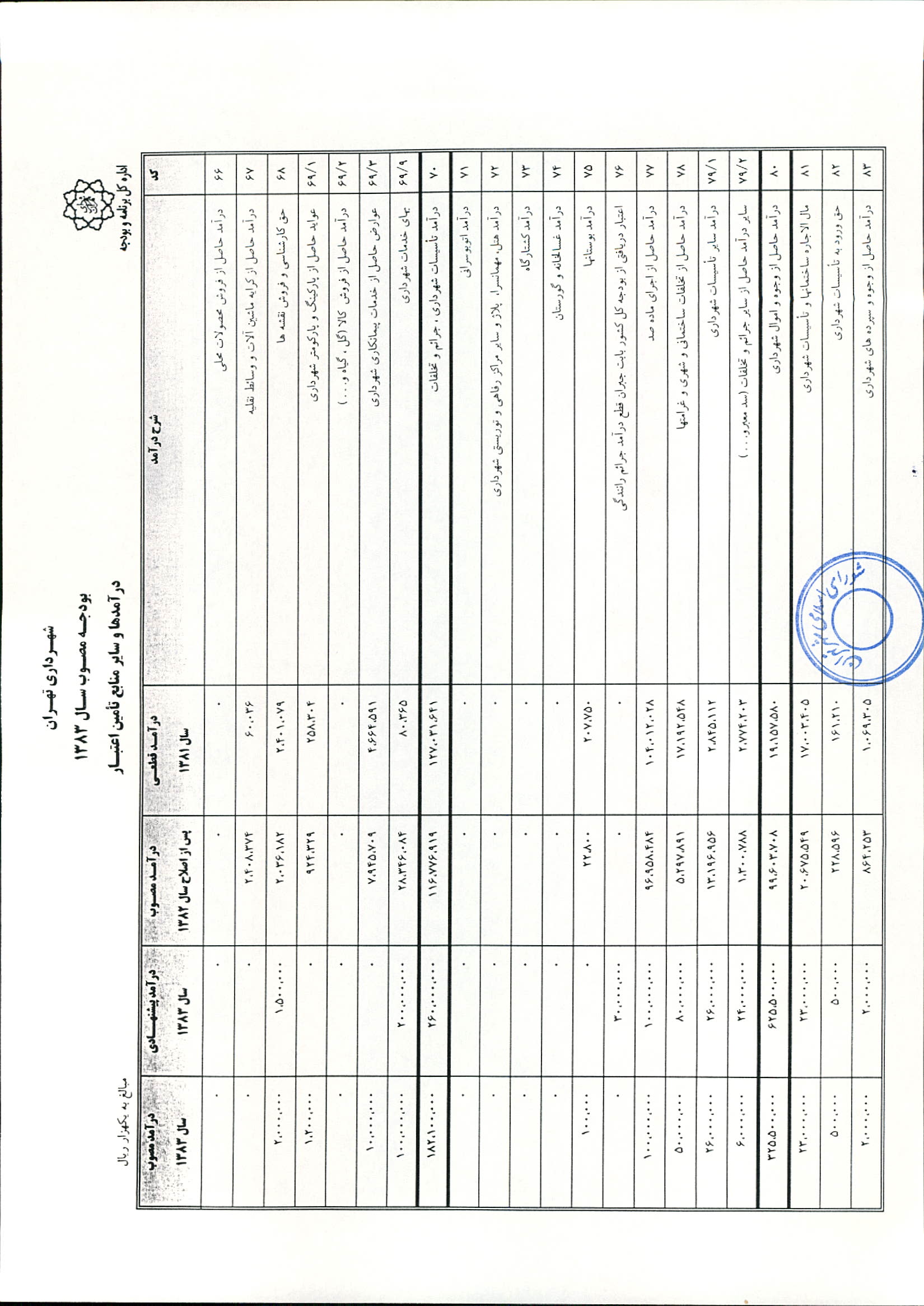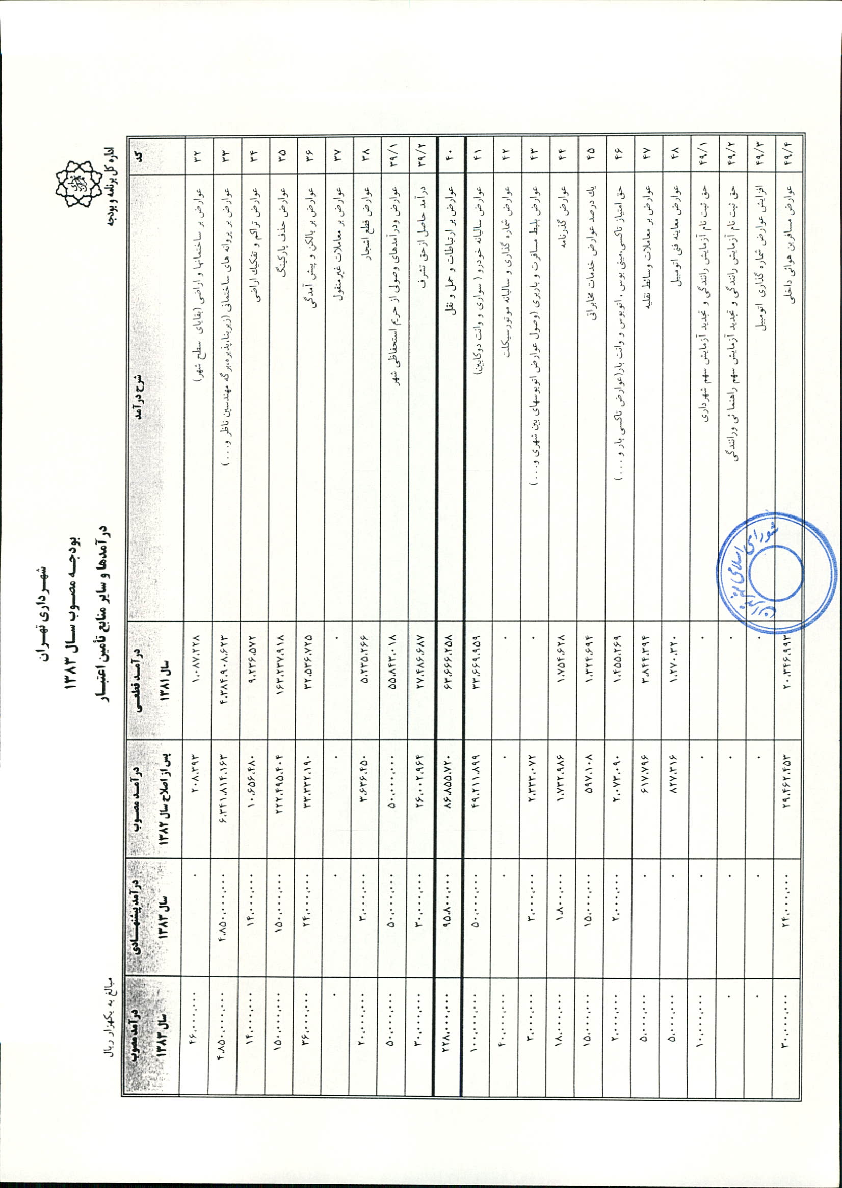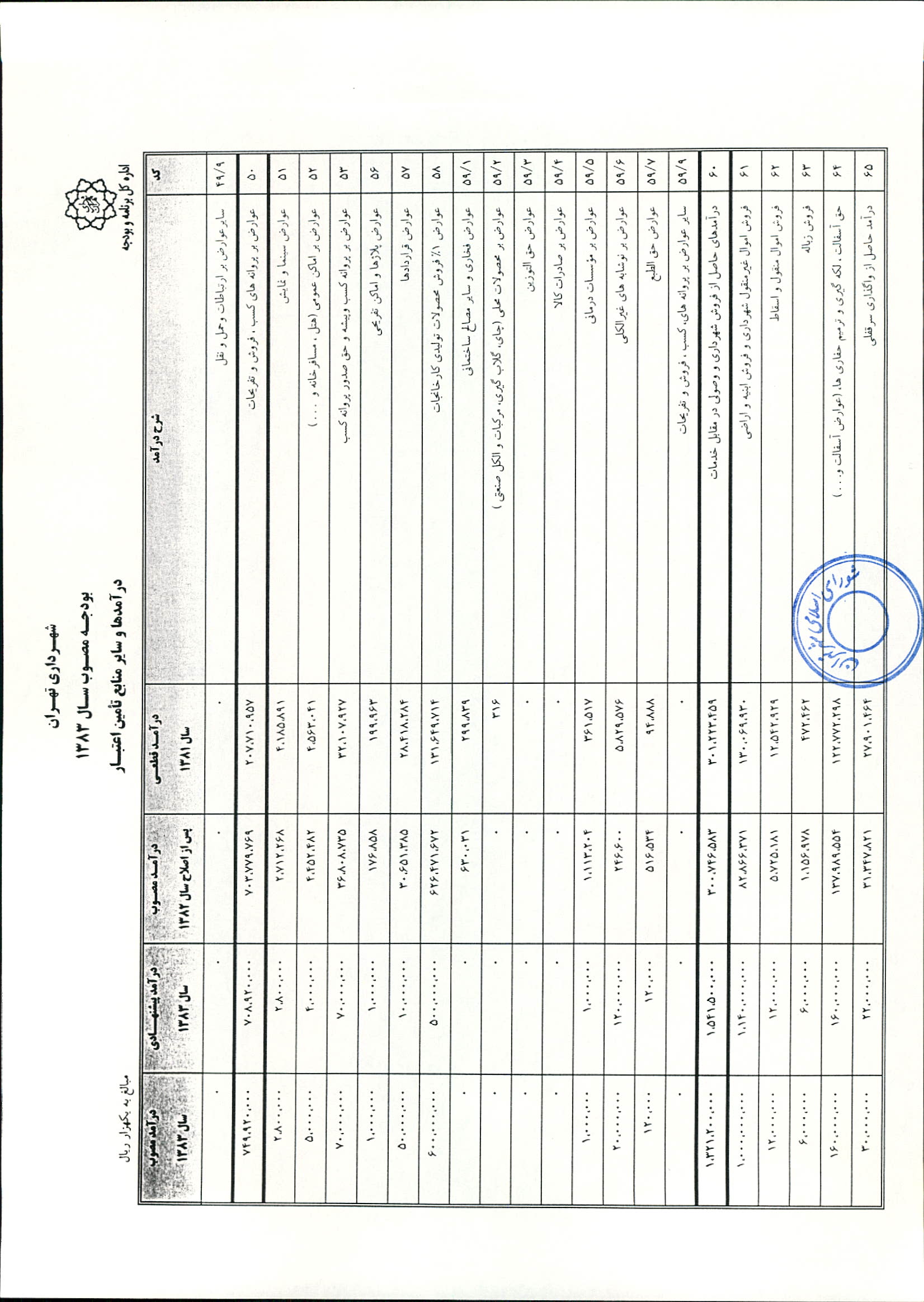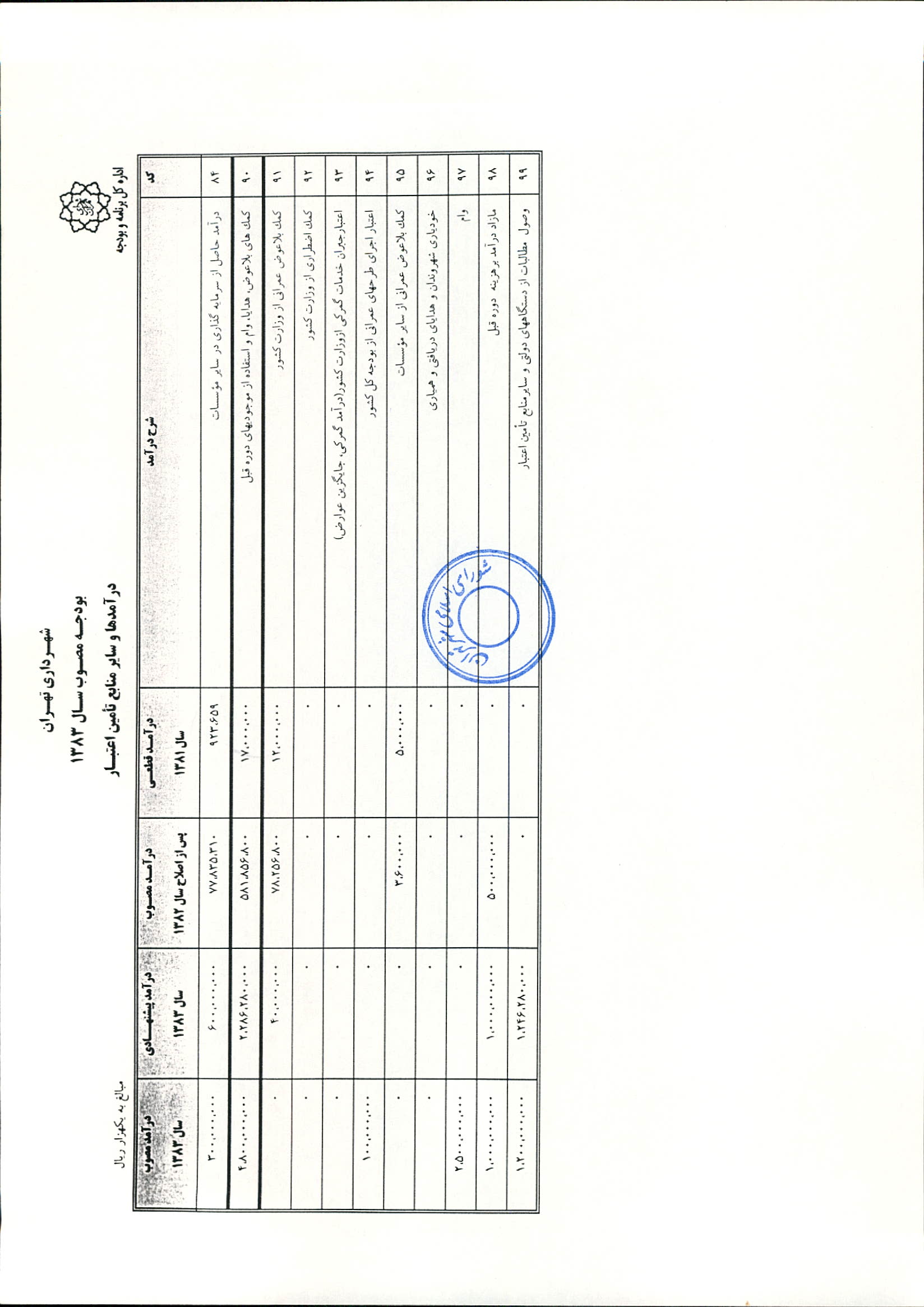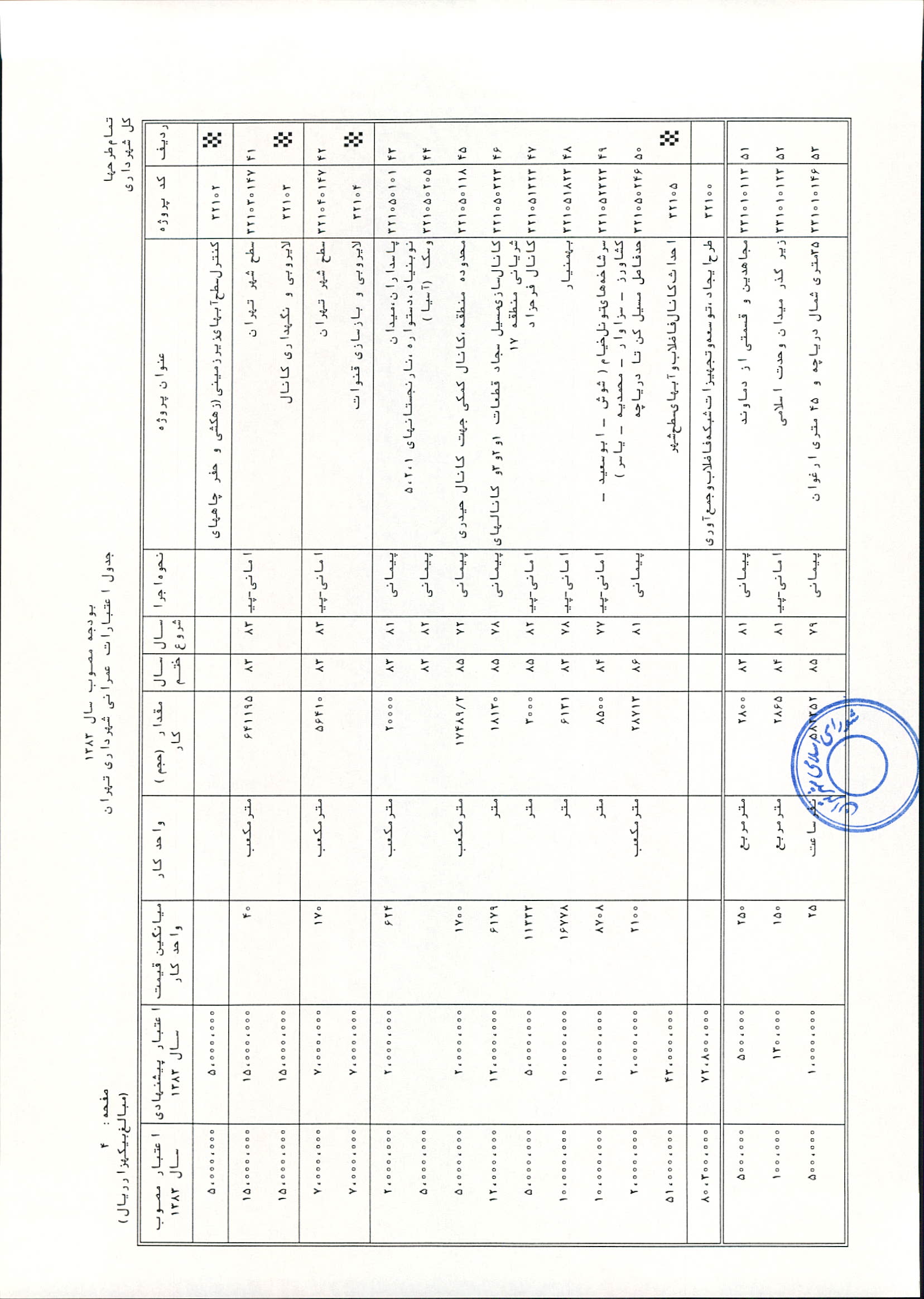 بودجه سال 1383 شهرداري تهران و چهار سازمان غيرمستقل (سازمان حمل و نقل و ترافيك تهران ـ سازمان مديريت و نظارت بر تاكسيراني شهر تهران ـ سازمان ترمينال‌هاي مسافربري شهر تهران ـ سازمان سردخانه و كشتارگاه)