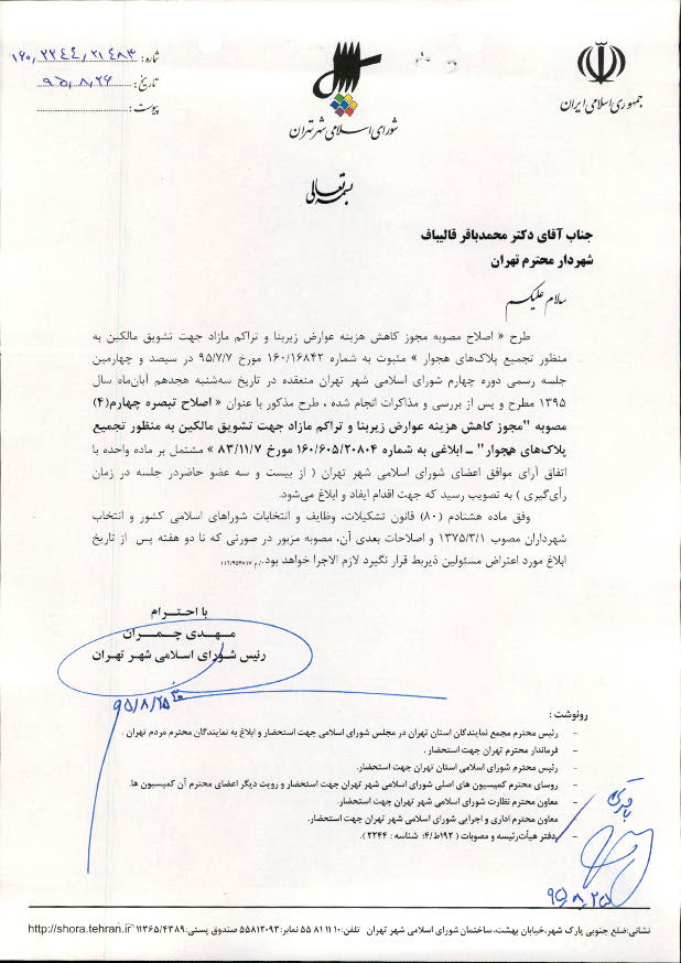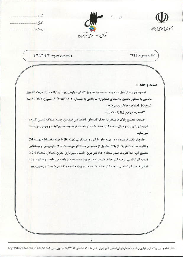 اصلاح تبصره چهارم (4) مصوبه "مجوز کاهش هزینه عوارض زیربنا و تراکم مازاد جهت تشویق مالکین به منظور تجمیع پلاکهای همجوار" ابلاغی به شماره 160/605/20804 مورخ 83/11/7