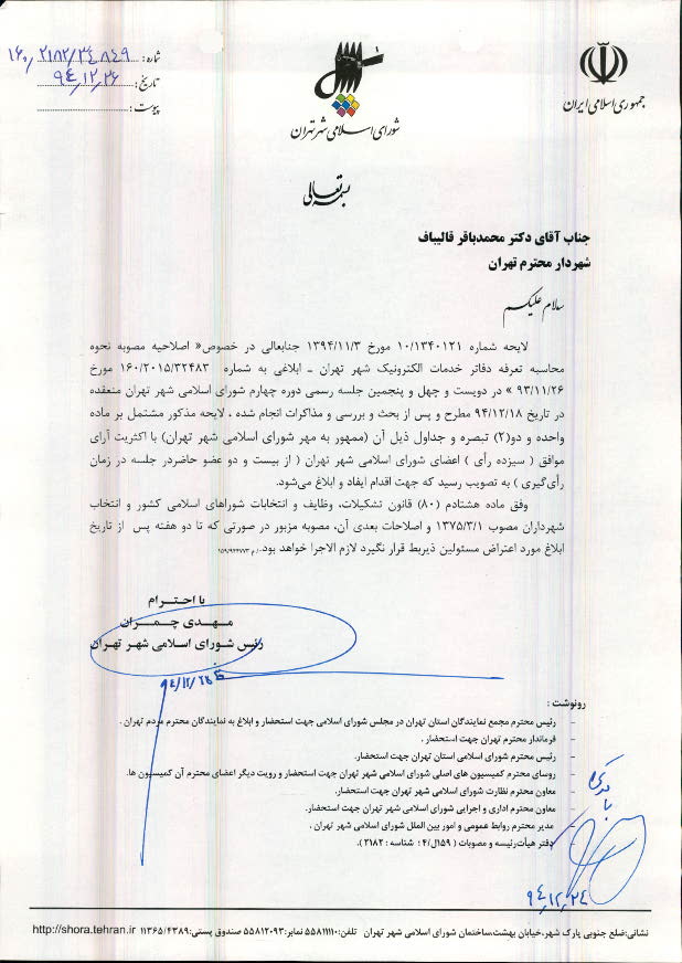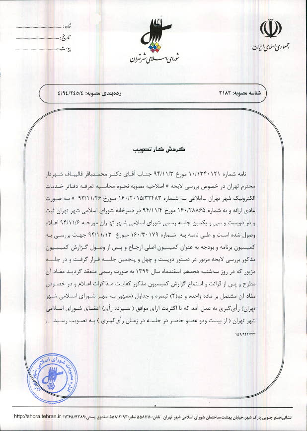 اصلاحیه مصوبه نحوه محاسبه تعرفه دفاتر خدمات الکترونیک شهر تهران ابلاغی به شماره 160/2015/32483 مورخ 93/11/26