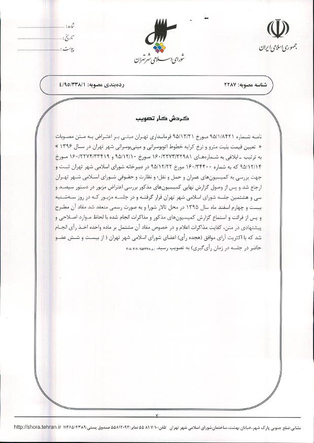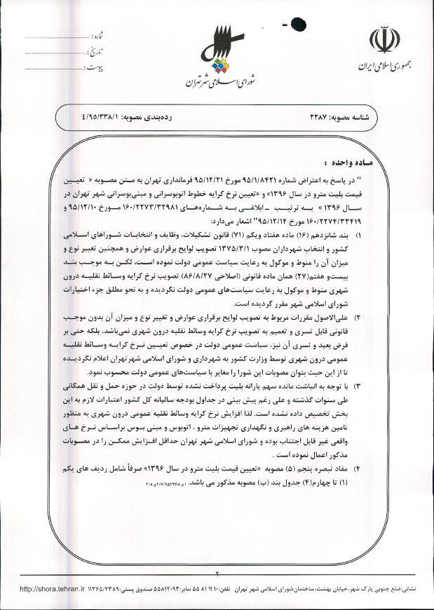 جوابيه شوراي اسلامي شهر تهران به اعتراض شماره 95/1/8421 مورخ 95/12/21 فرمانداري تهران به متن مصوبات «تعیین قیمت بلیت مترو در سال 1396» و «تعیین نرخ کرایه خطوط اتوبوسرانی و مینیبوسرانی شهر تهران در سال 1396» به ترتیب ابلاغی به شمارههای 160/2273/32981 مورخ 95/12/10 و 160/2274/33419 مورخ 95/12/14
