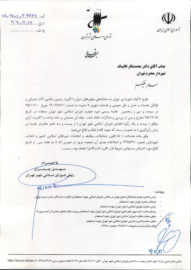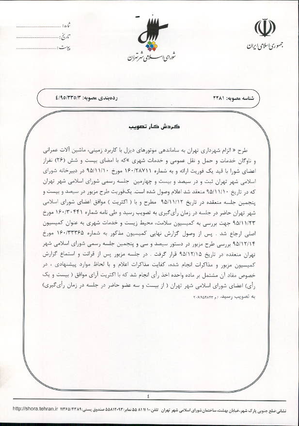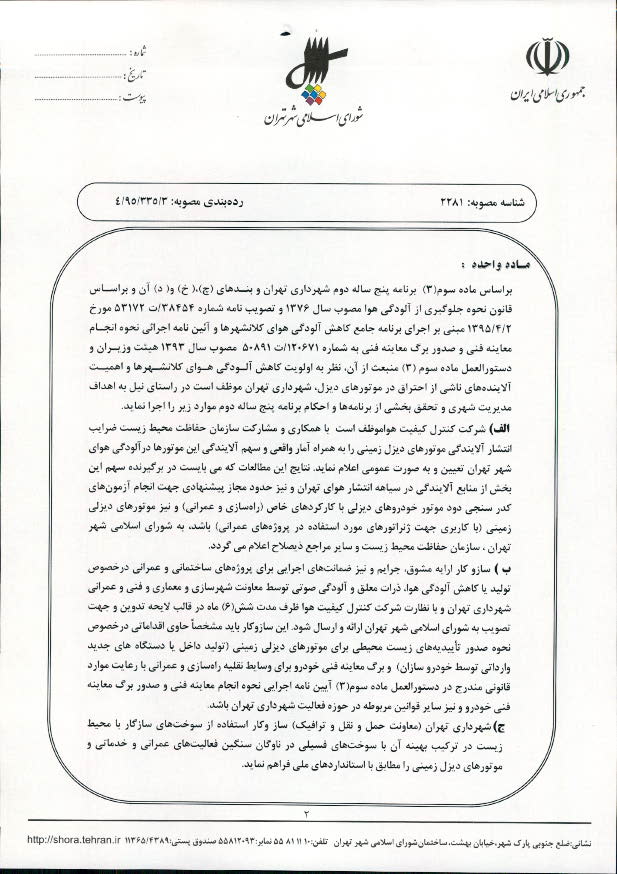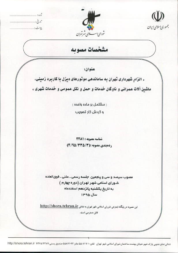 الزام شهرداری تهران به ساماندهی موتورهای دیزل با کاربرد زمینی، ماشینآلات عمرانی و ناوگان خدمات و حمل و نقل عمومی و خدمات شهری