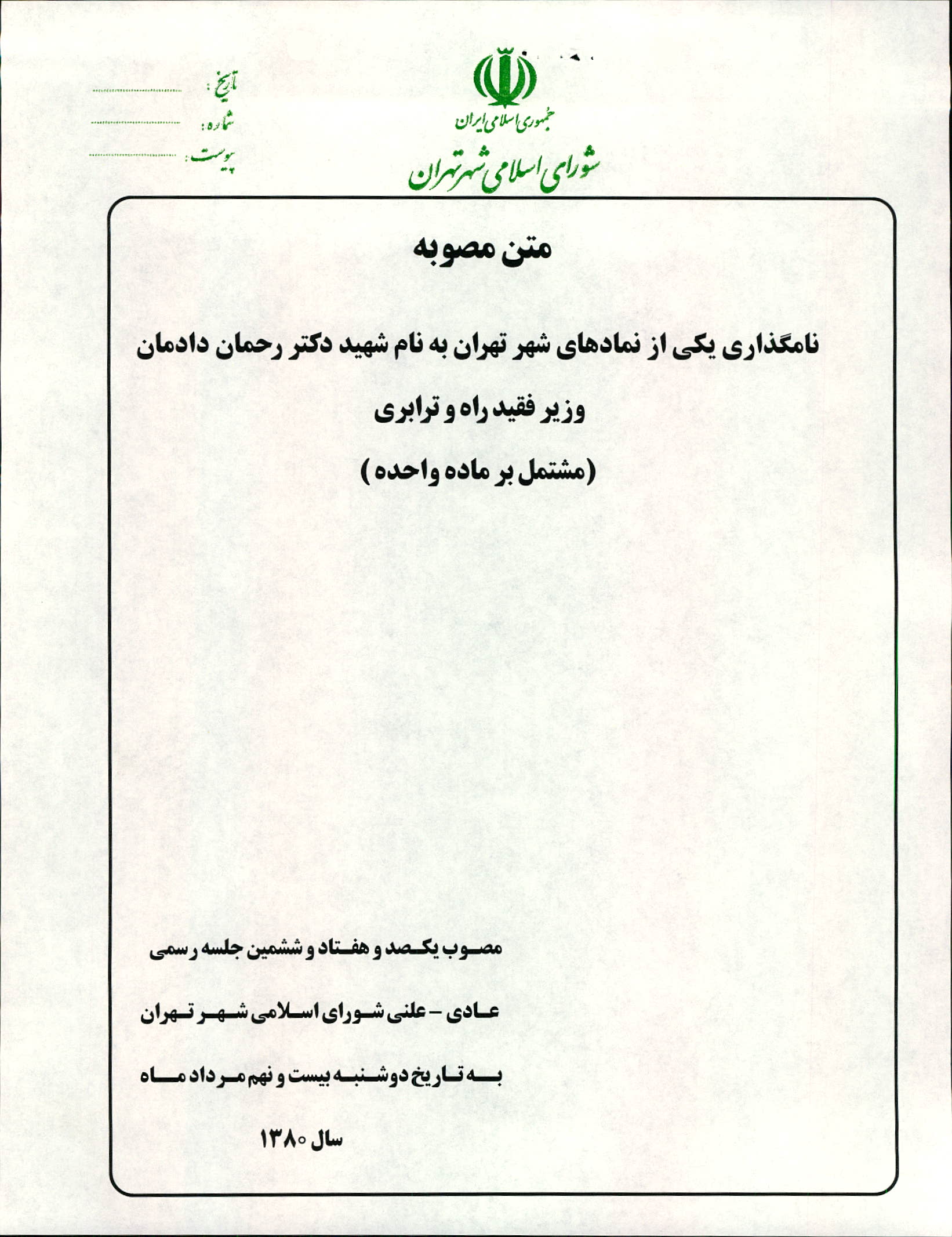 نامگذاری يكي از نمادهاي شهر تهران به نام شهيد دكتر رحمان دادمان وزير فقيد راه و ترابري