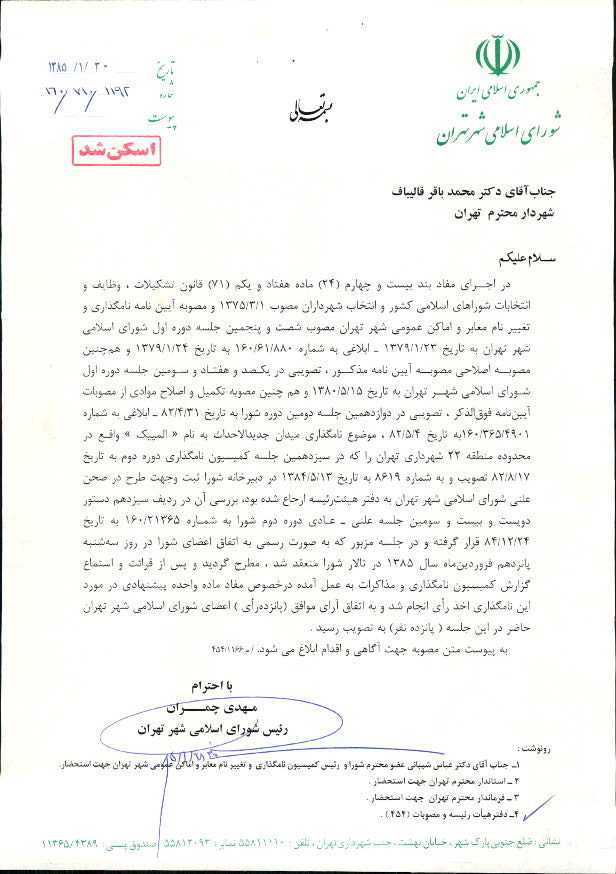 نامگذاری میدان جدیدالاحداث در محدوده منطقه 22 شهرداری تهران به نام «المپیک»