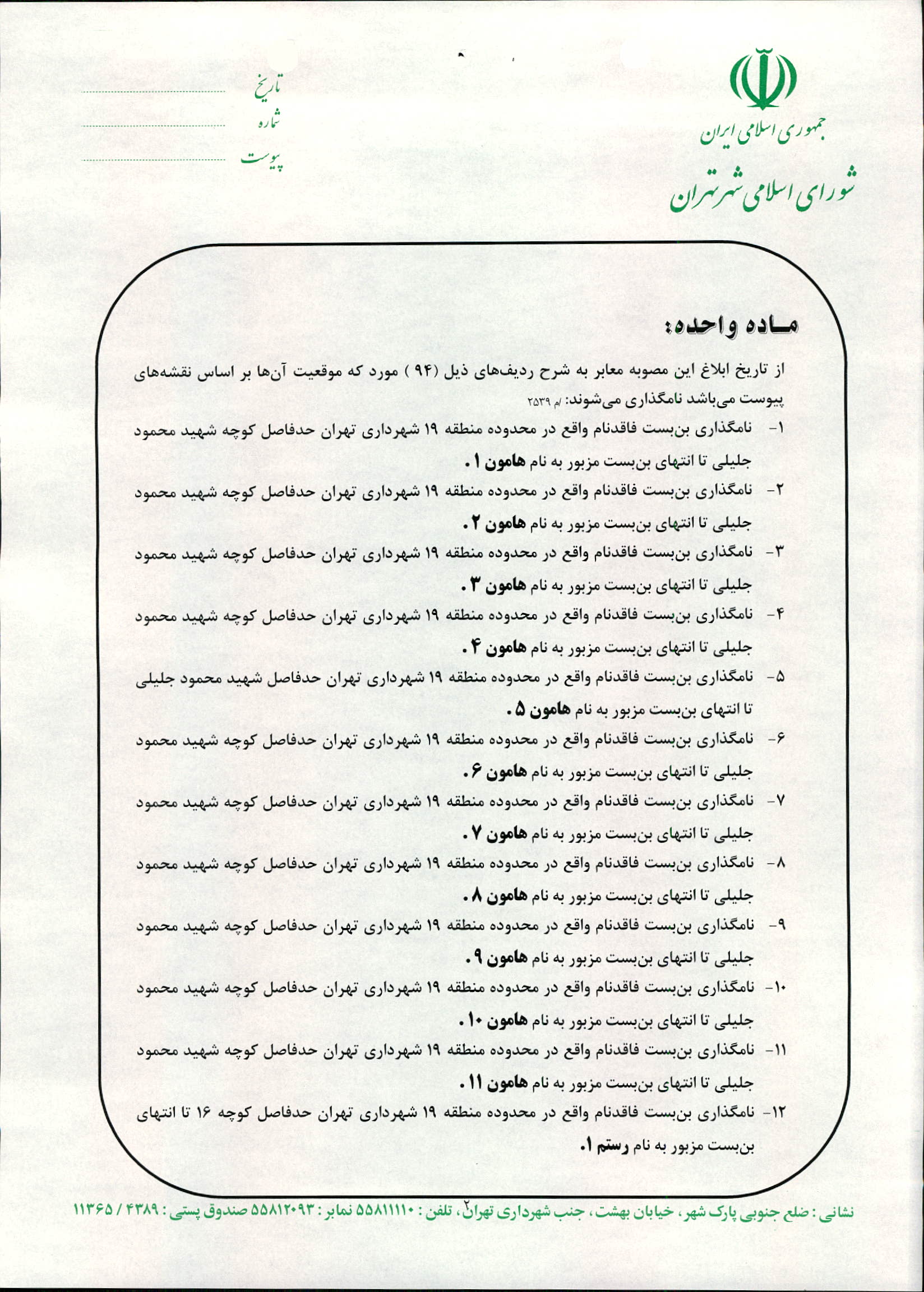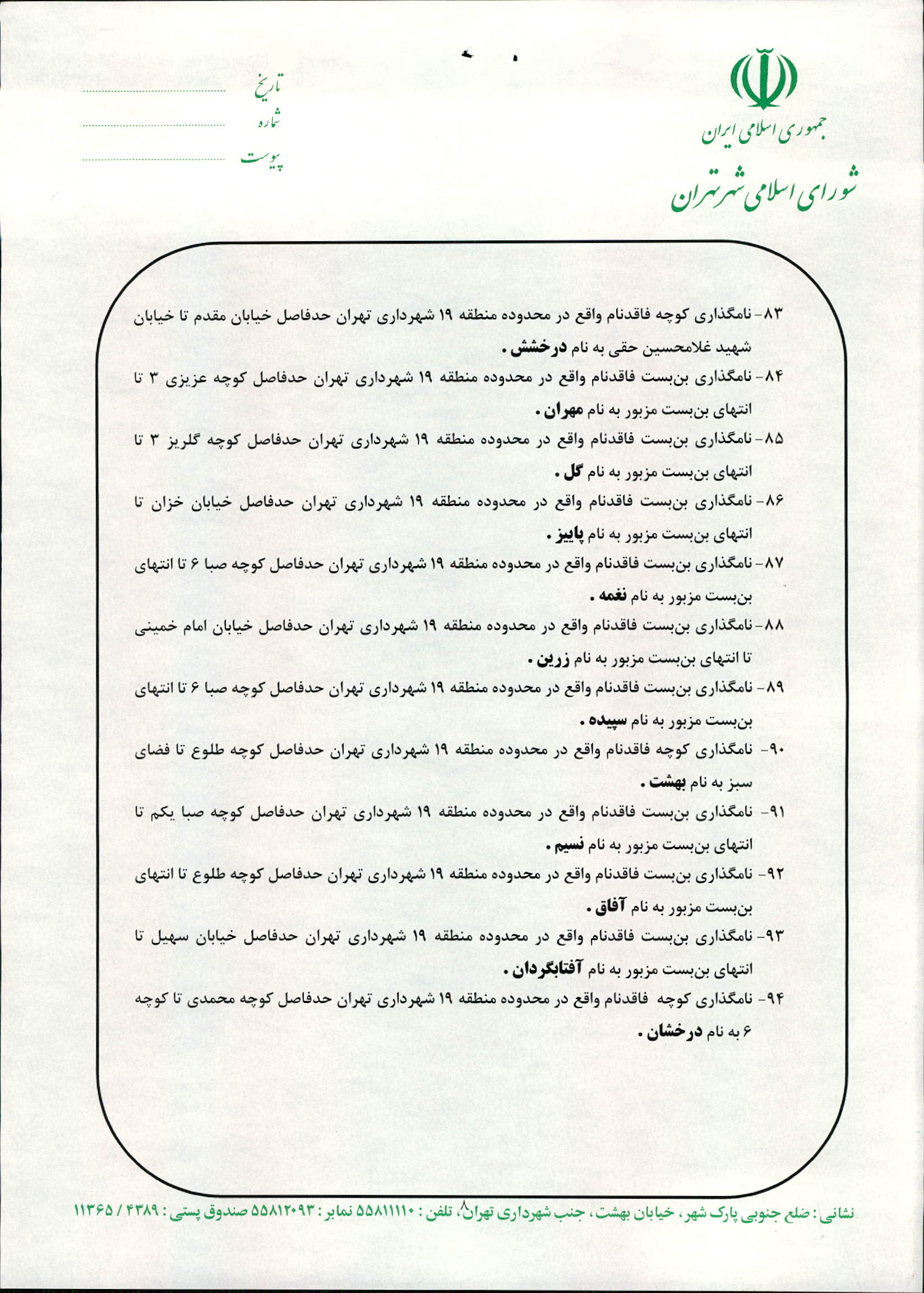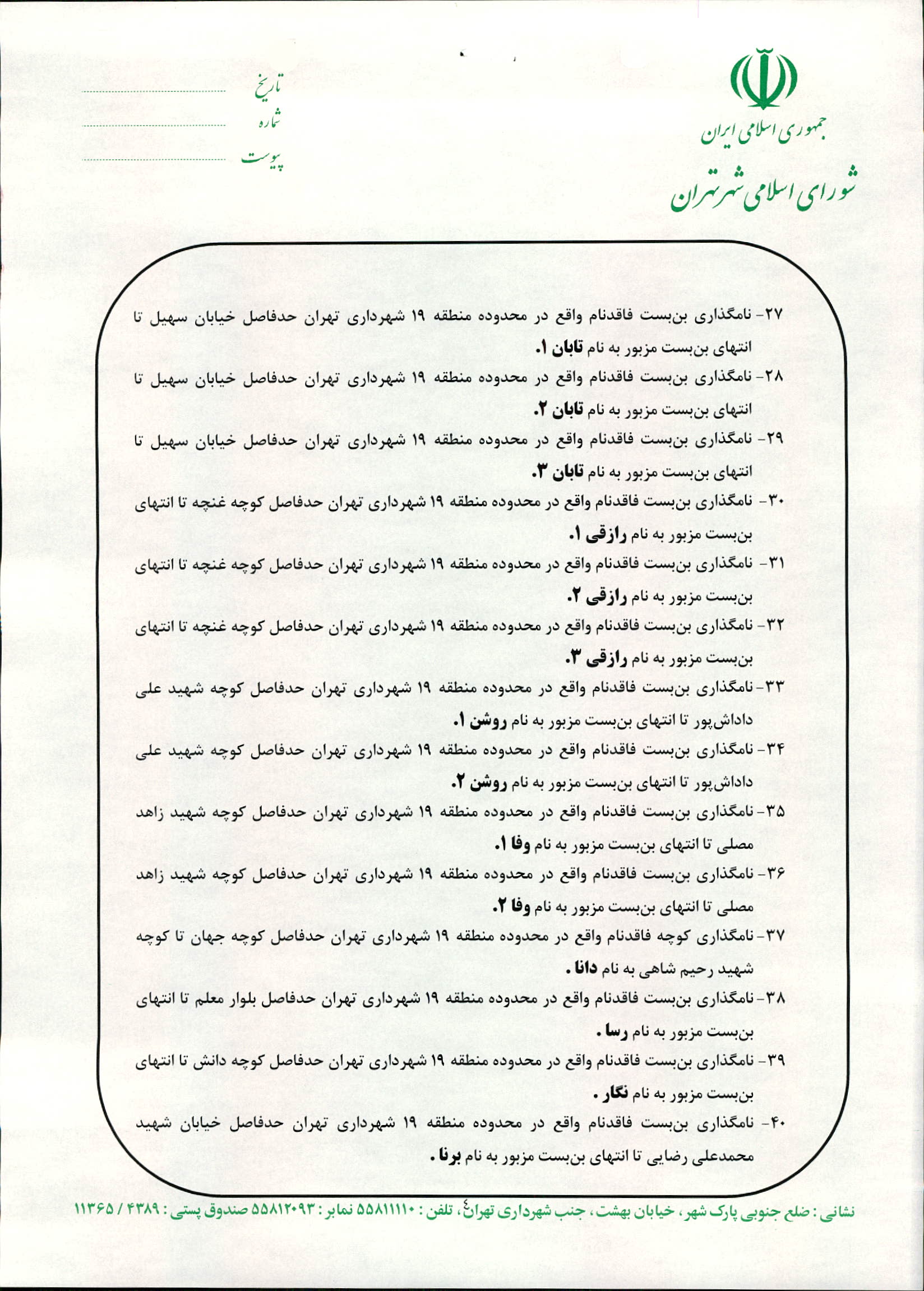 نامگذاری و تغییر نام 94 مورد از معابر شهر تهران