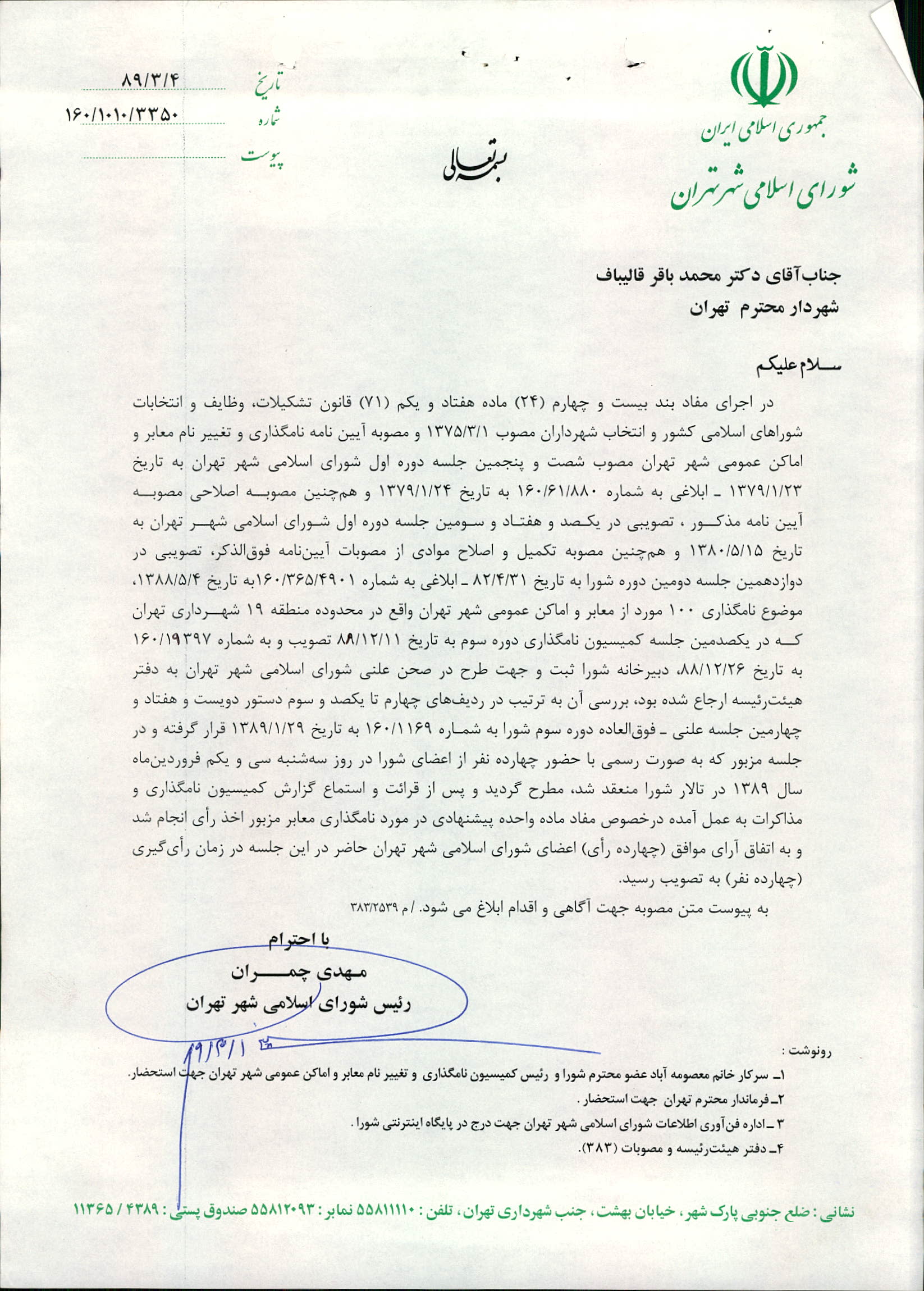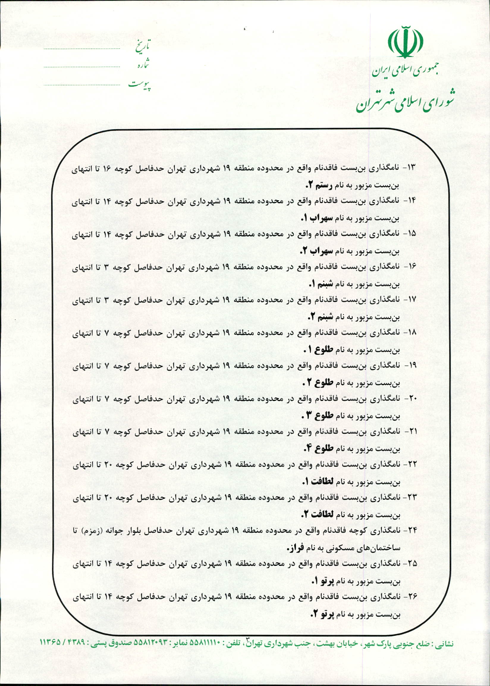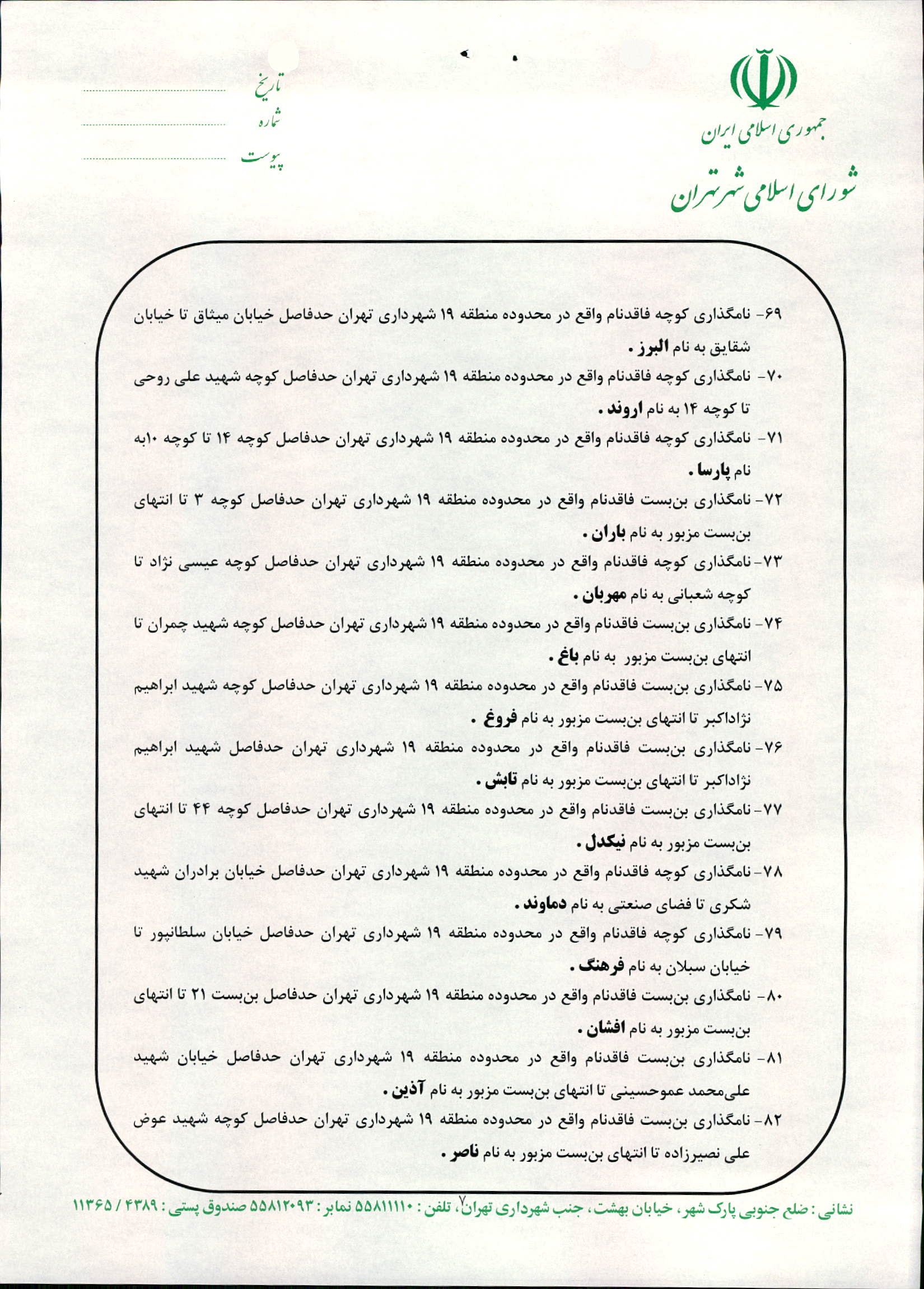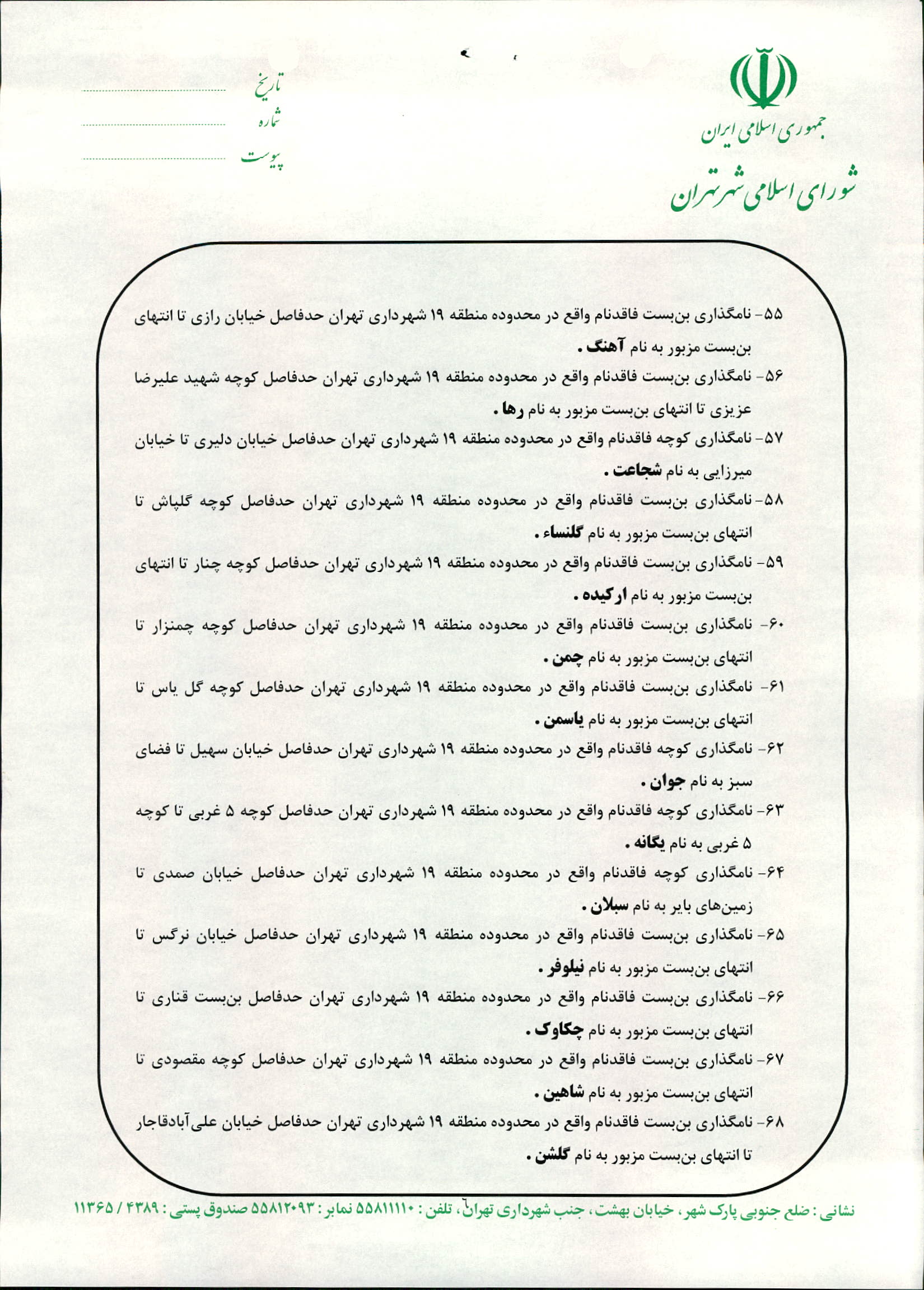 نامگذاری و تغییر نام 94 مورد از معابر شهر تهران