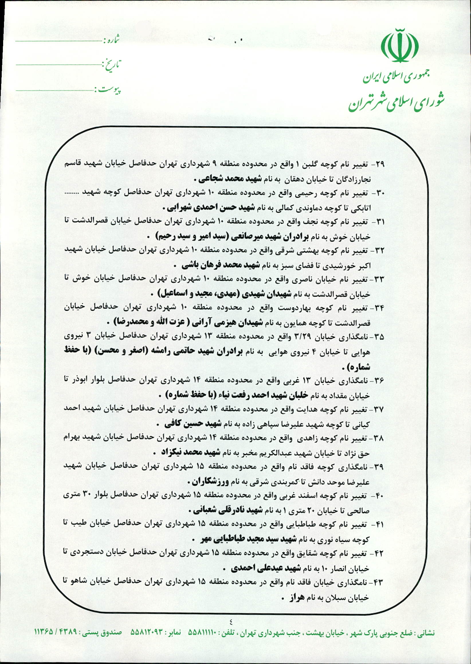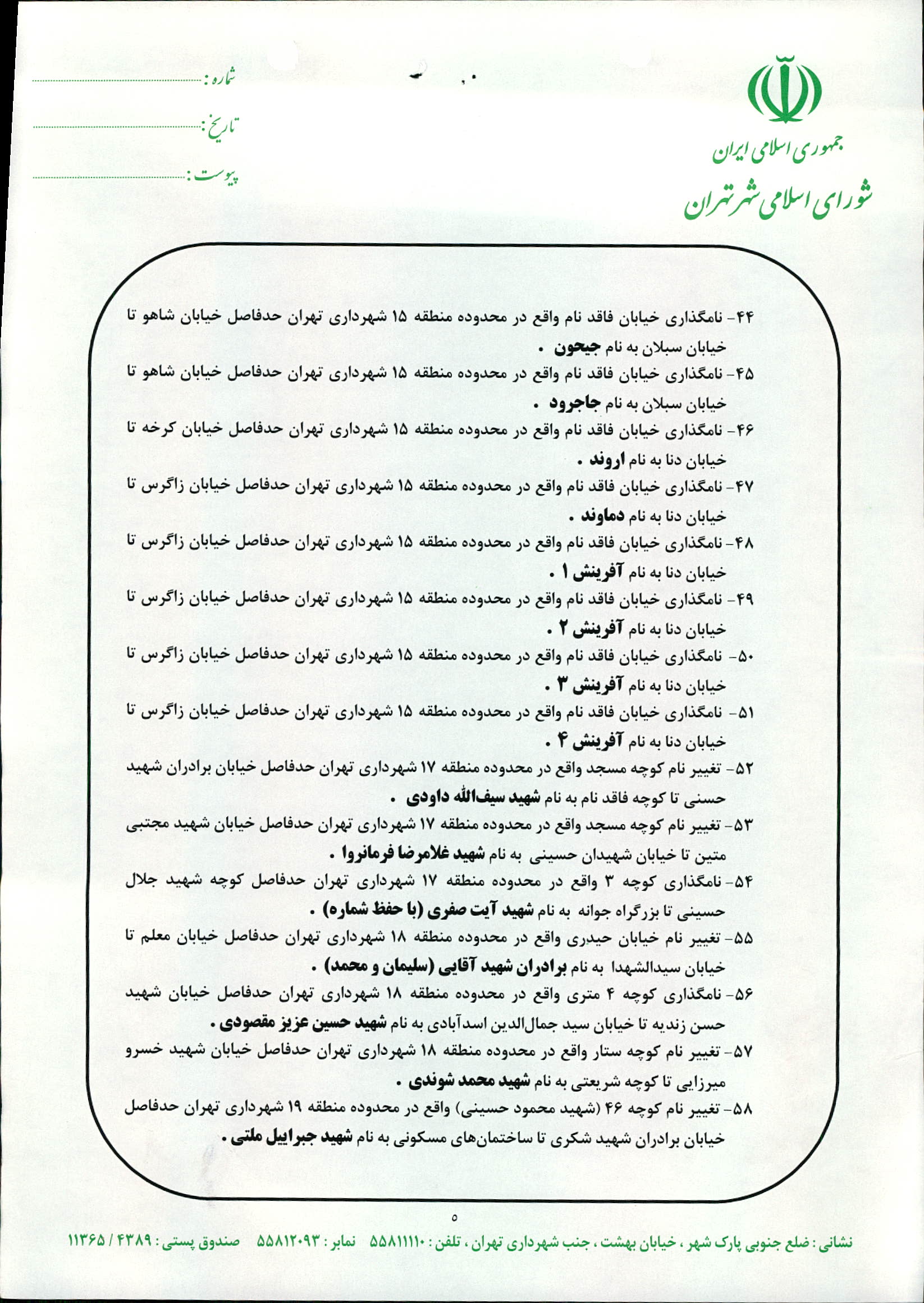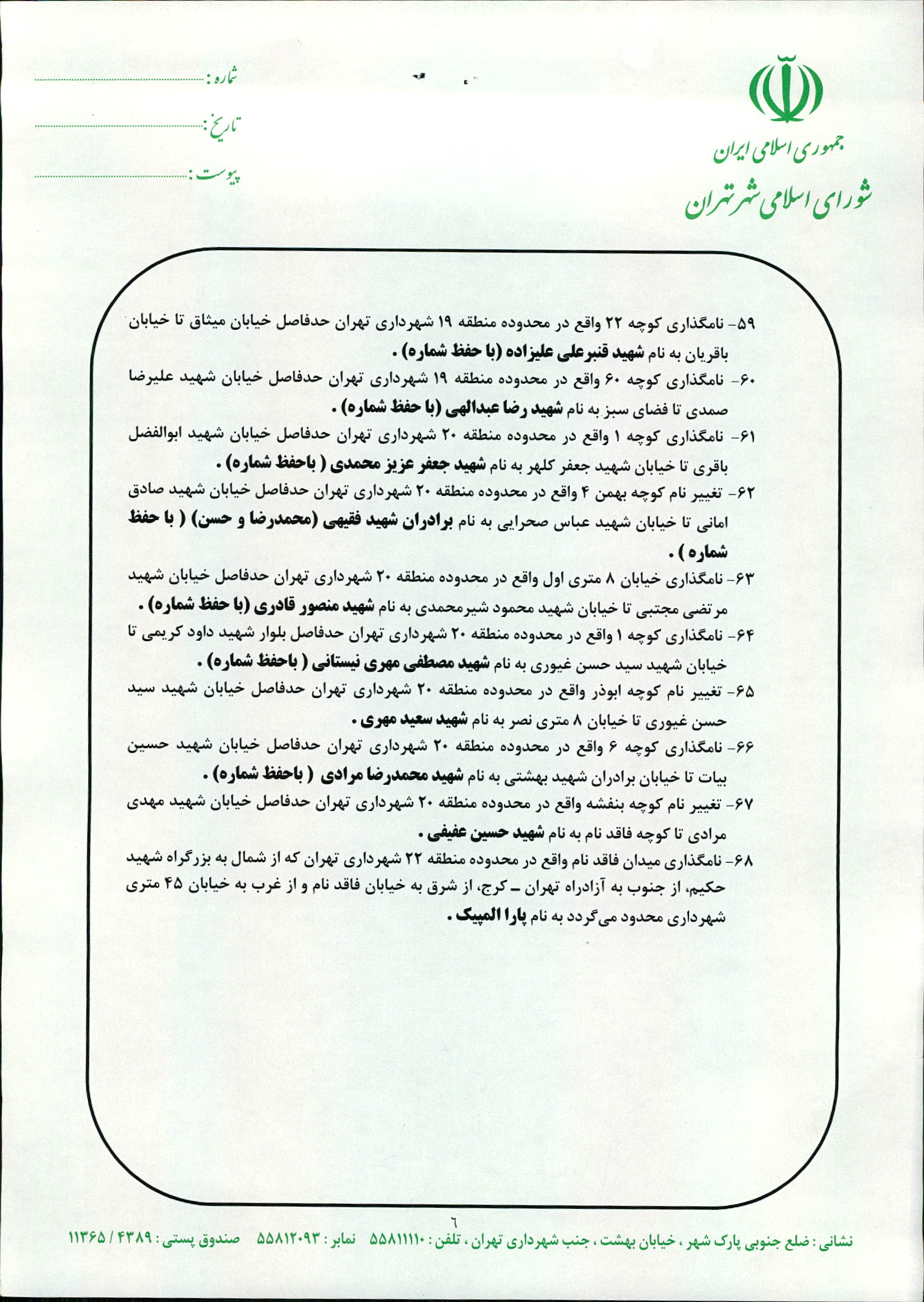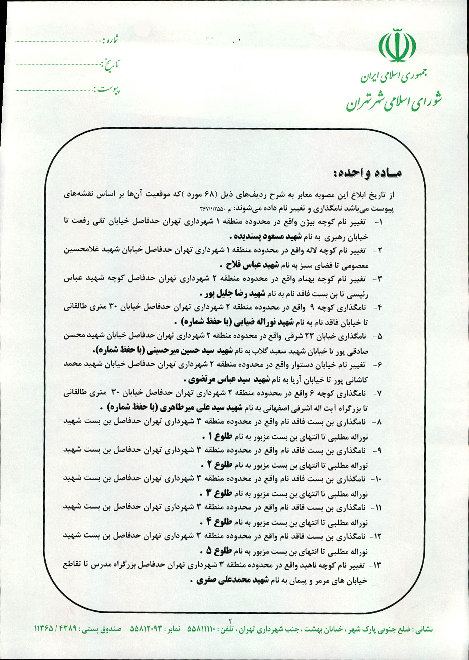 نامگذاری و تغییر نام 68 مورد از معابر شهر تهران