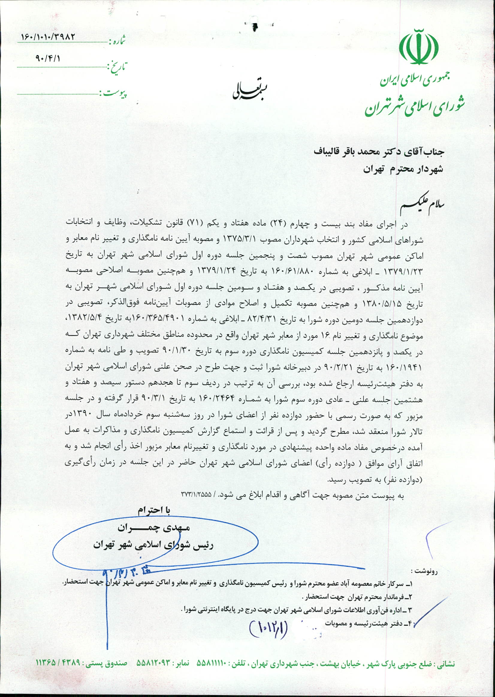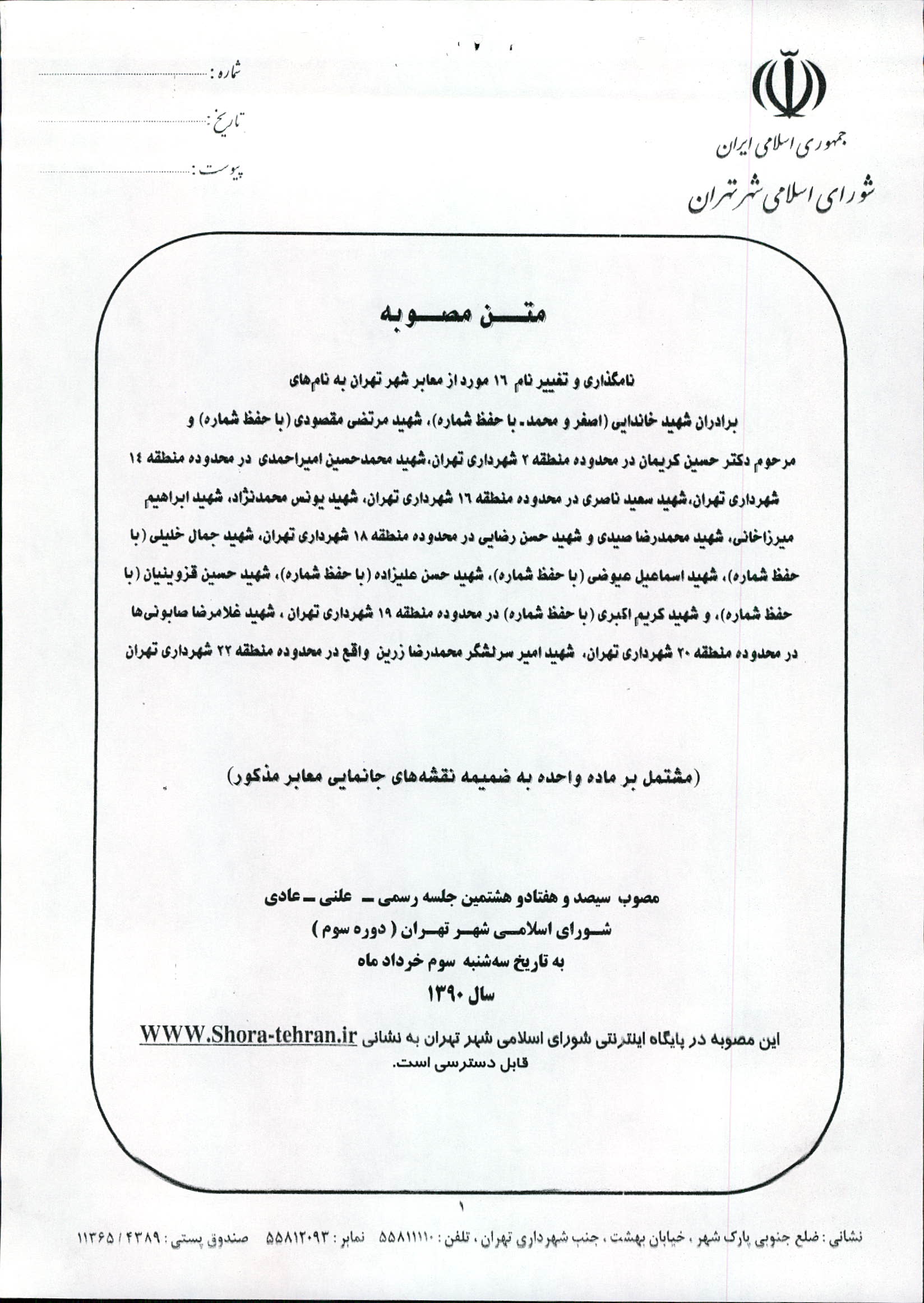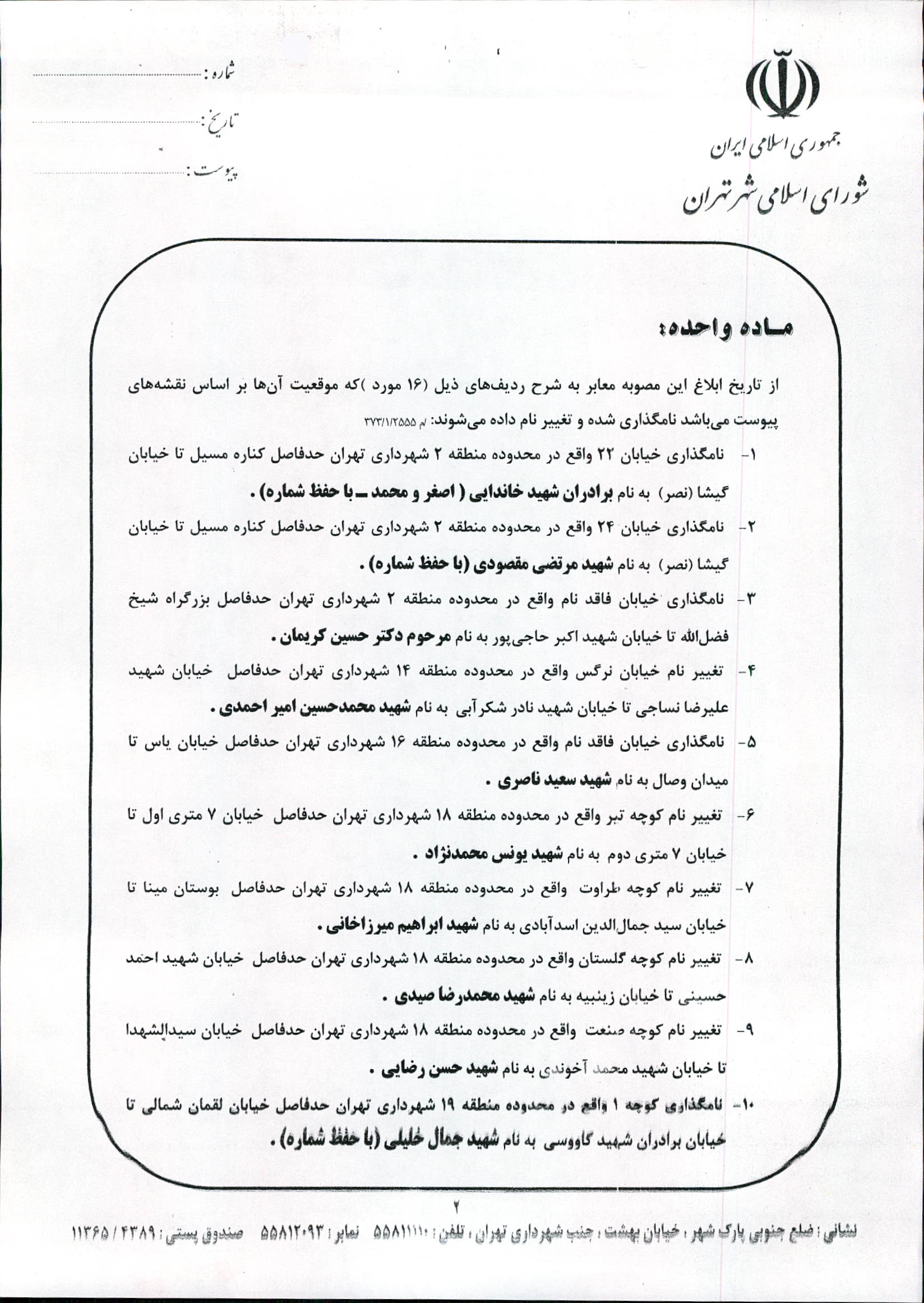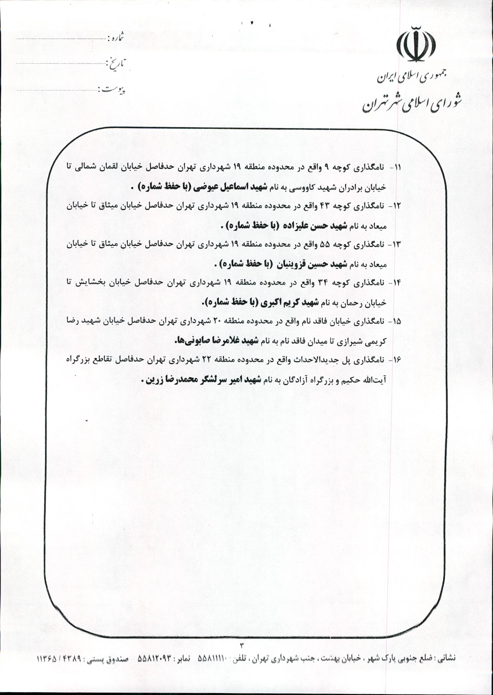 نامگذاری و تغییر نام 16 مورد از معابر شهر تهران