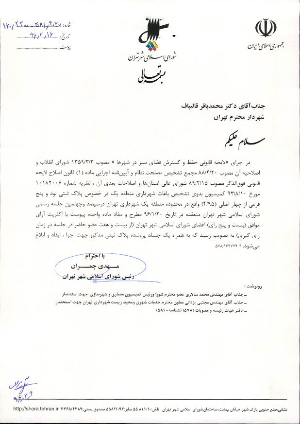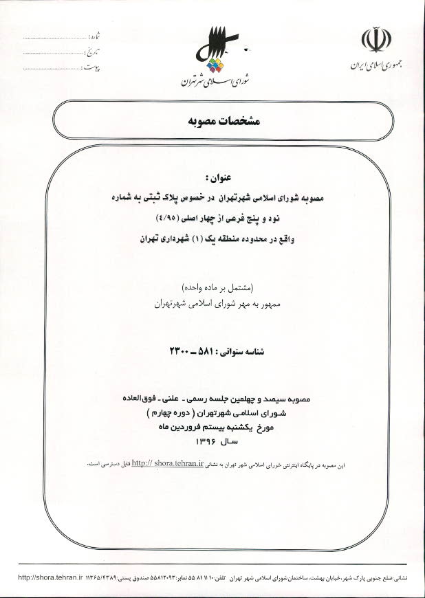 مصوبه شورای اسلامی شهر تهران در خصوص پلاك ثبتي به شماره نود و پنج فرعی از چهار اصلی (4/95) واقع در محدوده منطقه یک (1) شهرداري تهران