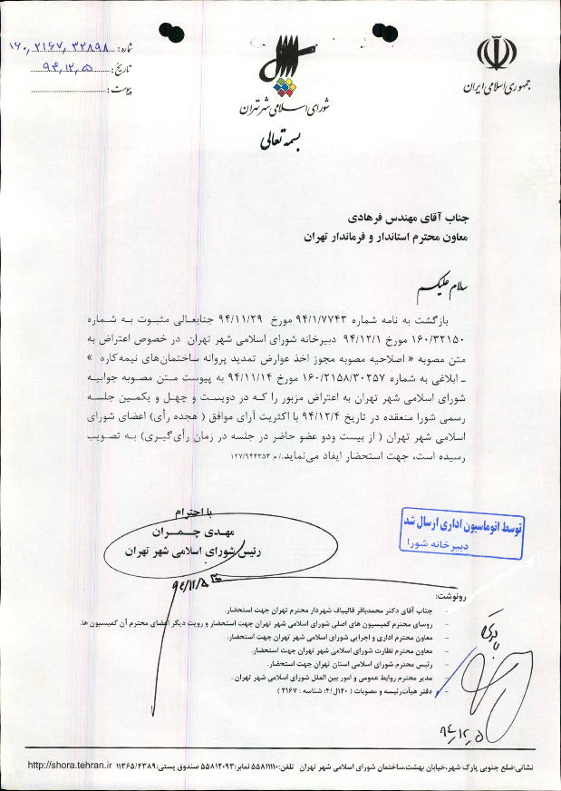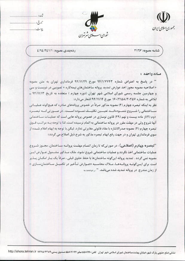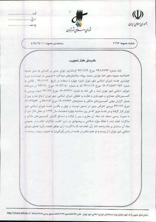 جوابیه شورای اسلامی شهر تهران به اعتراض شماره 94/1/7743 مورخ 1394/11/29 فرمانداری تهران به متن مصوبه «اصلاحیه مصوبه مجوز اخذ عوارض تمدید پروانه ساختمانهای نیمهکاره» ابلاغی به شماره 160/2158/30257 مورخ 94/11/14