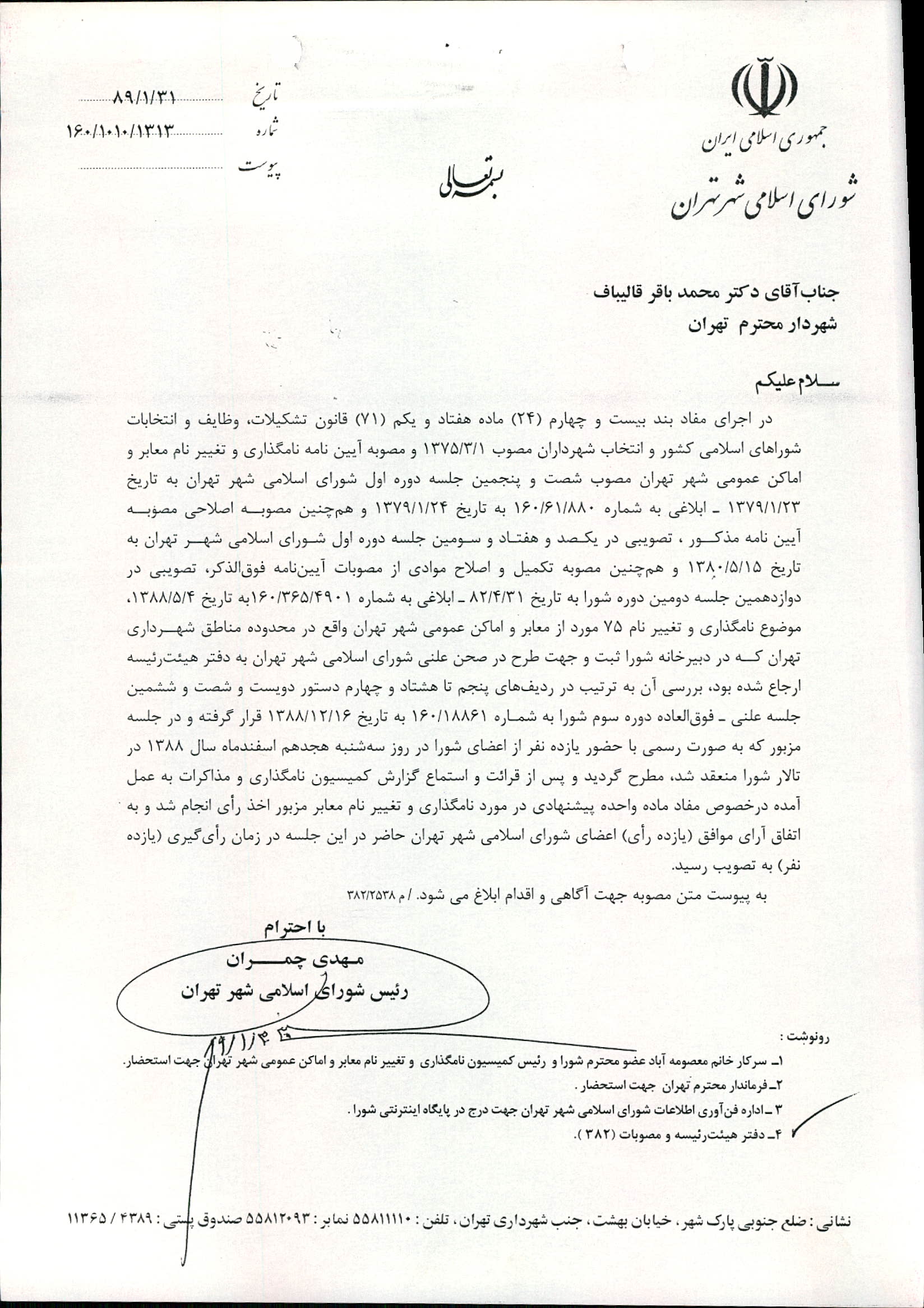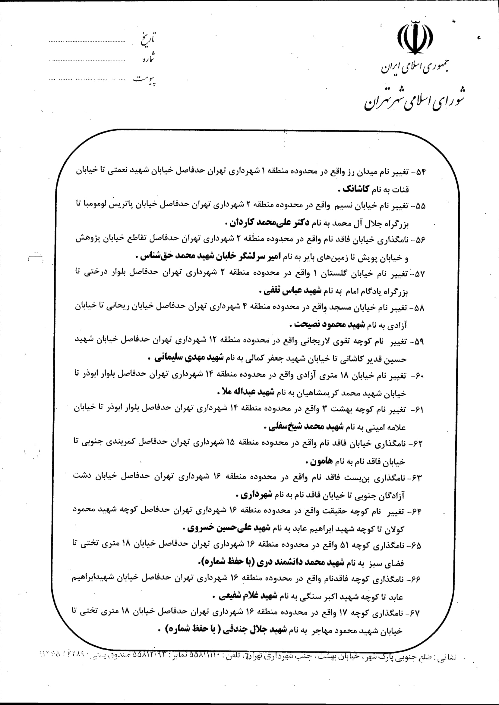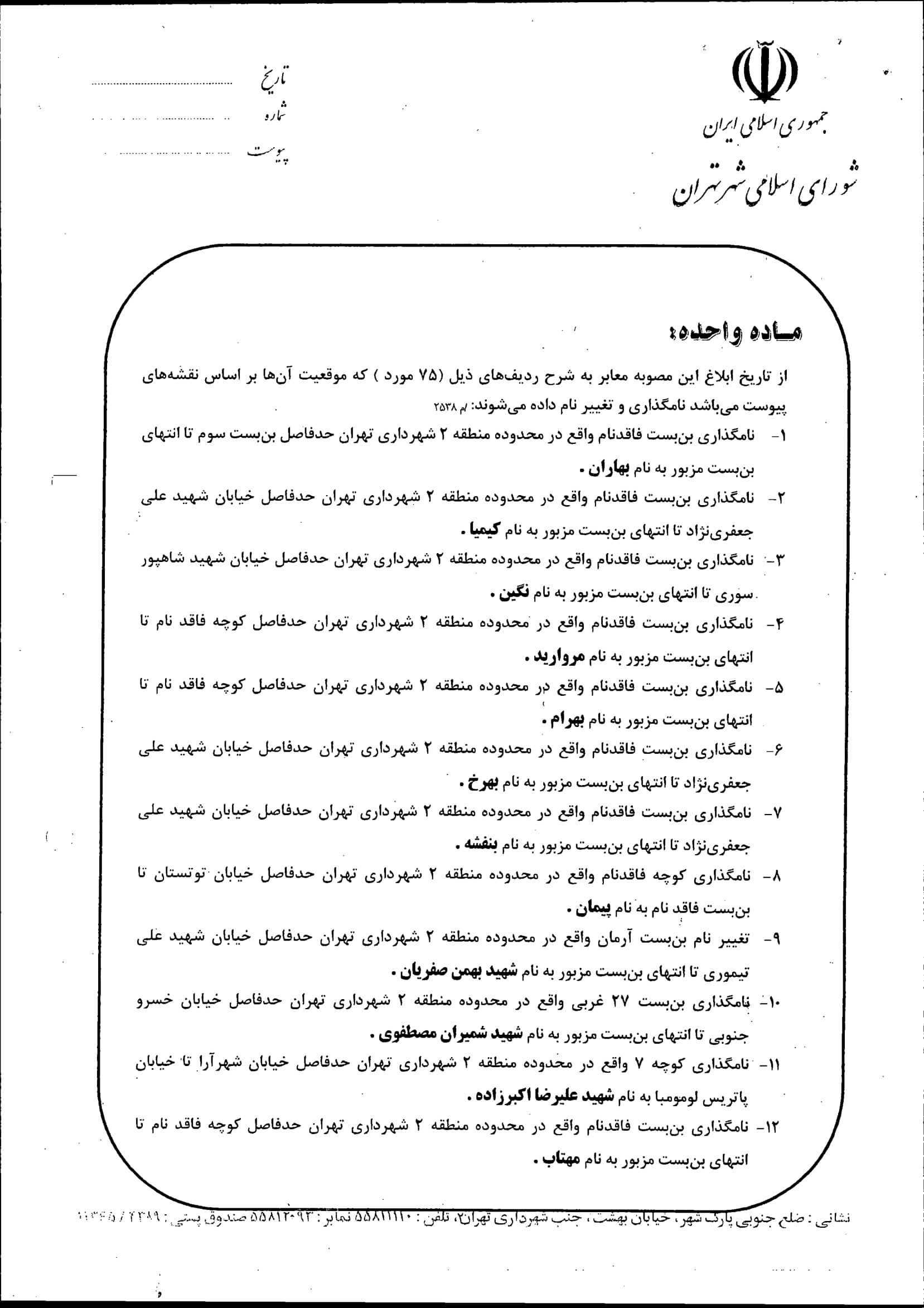 نامگذاری و تغییر نام 75 مورد از معابر شهر تهران