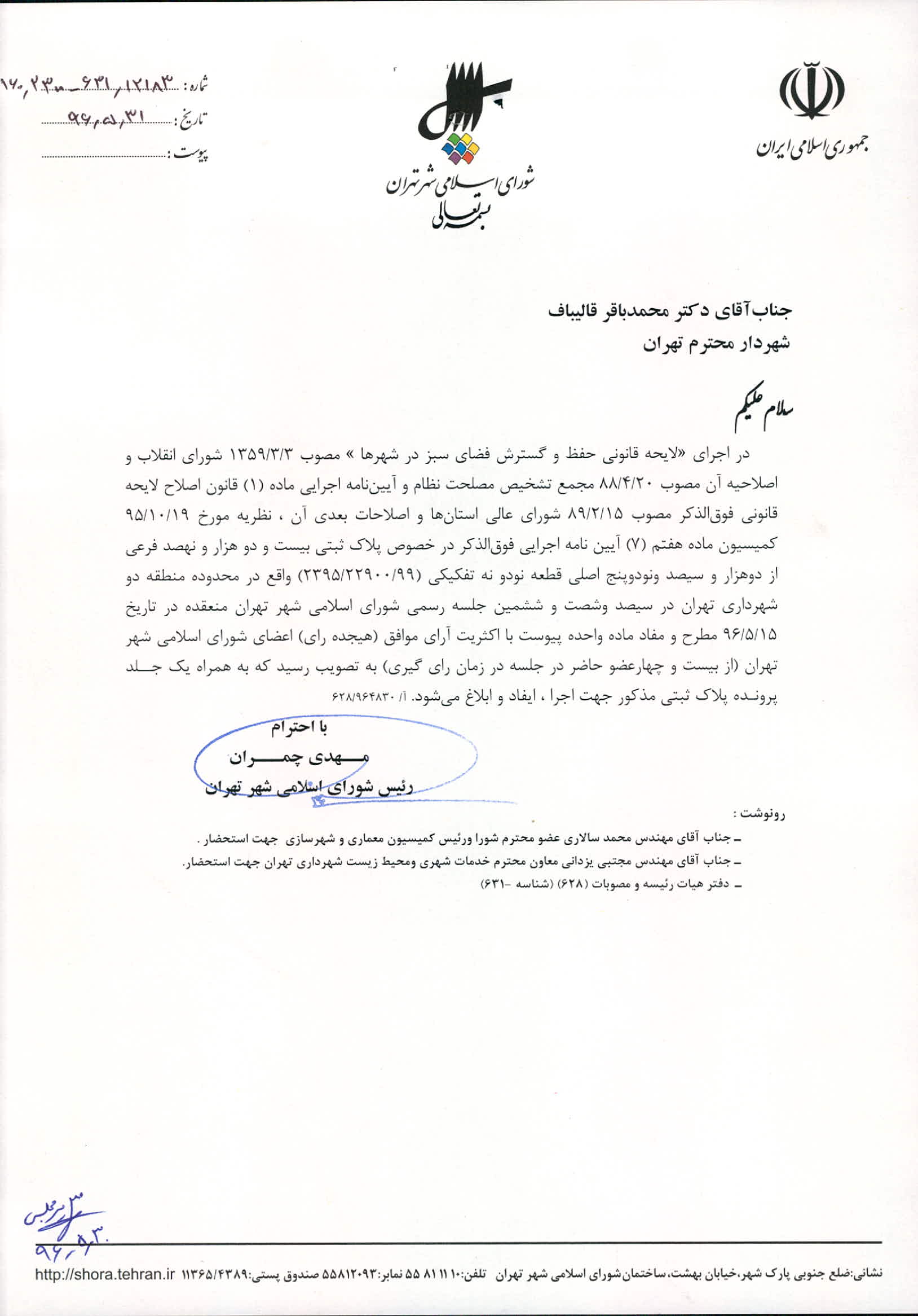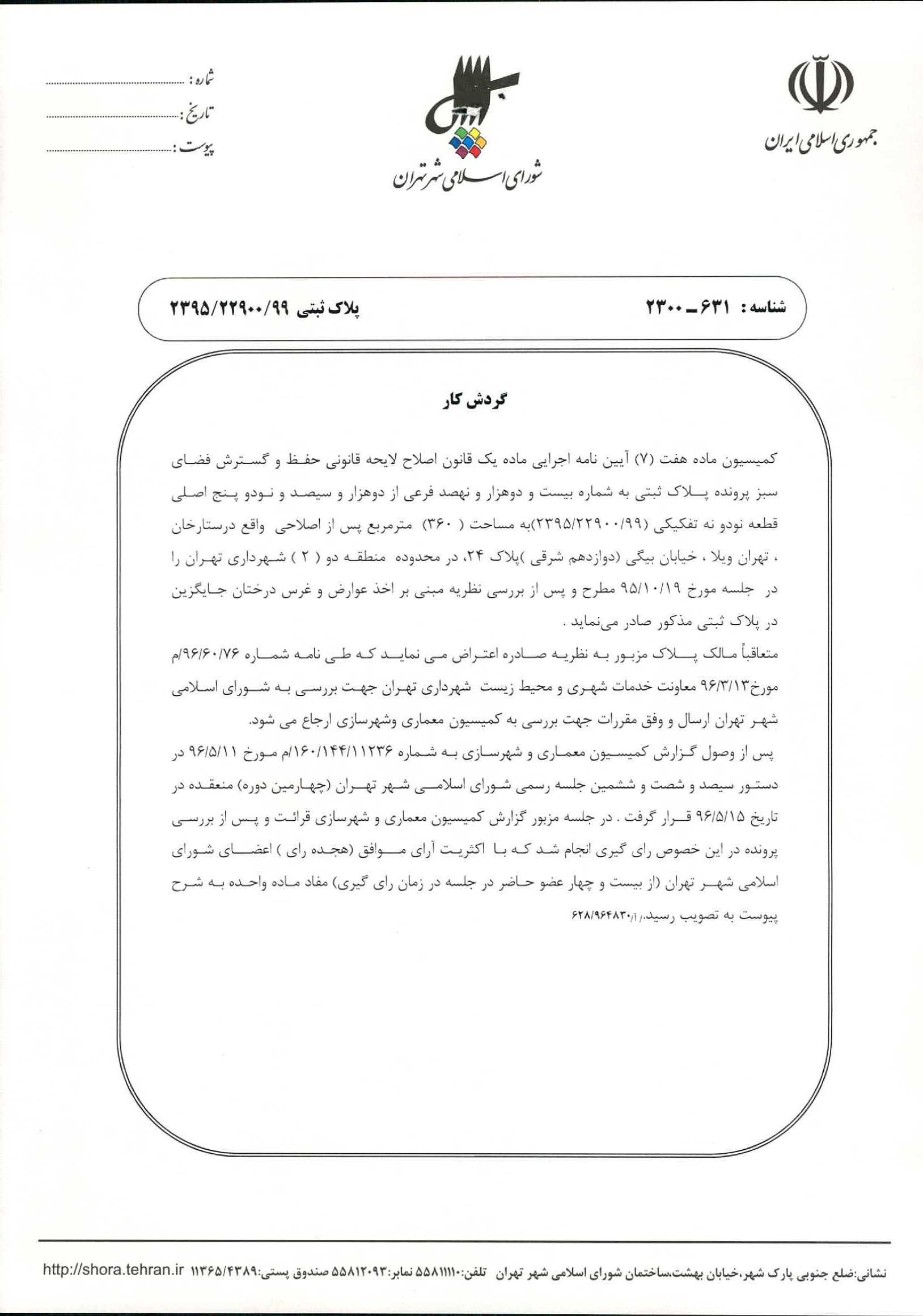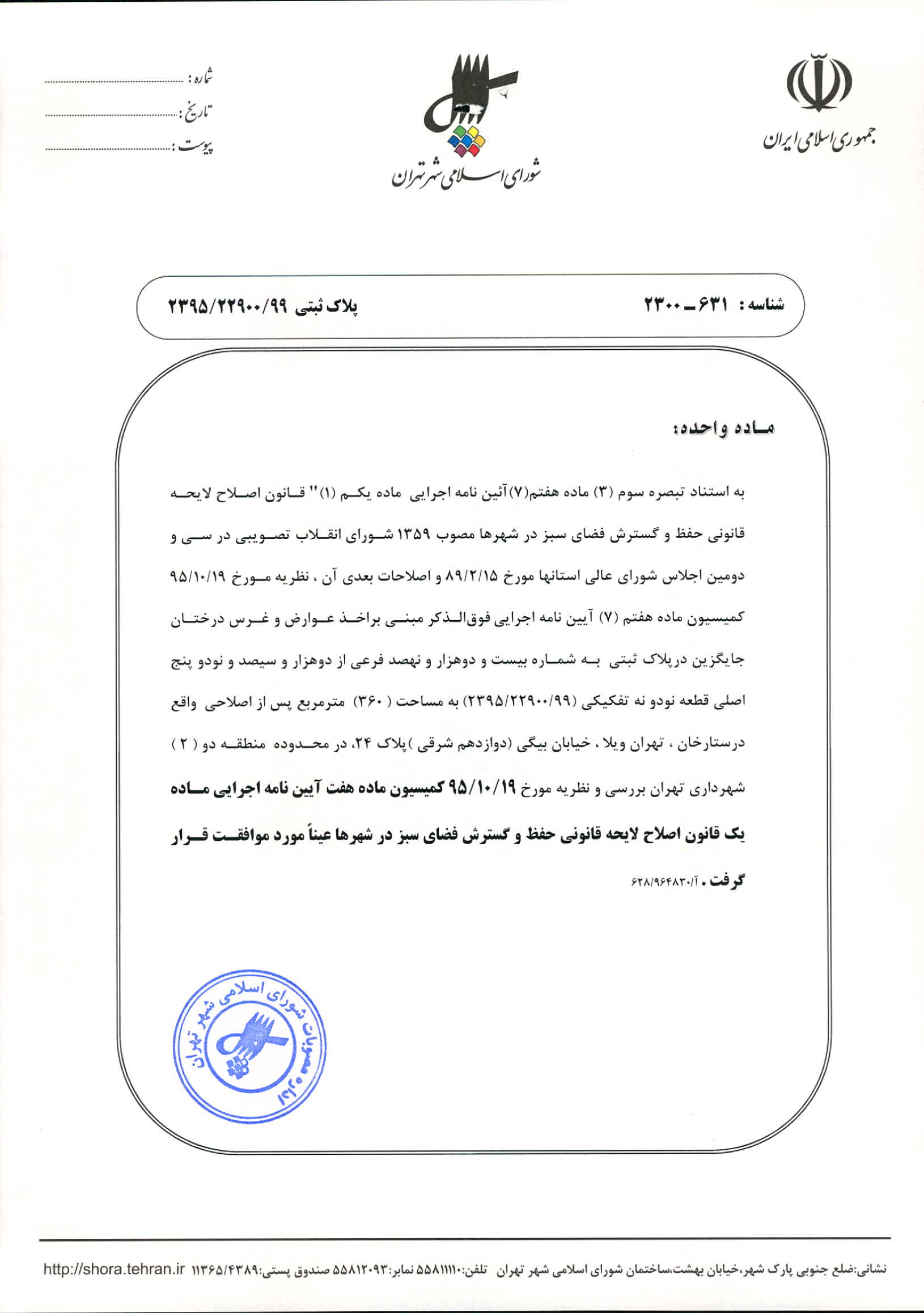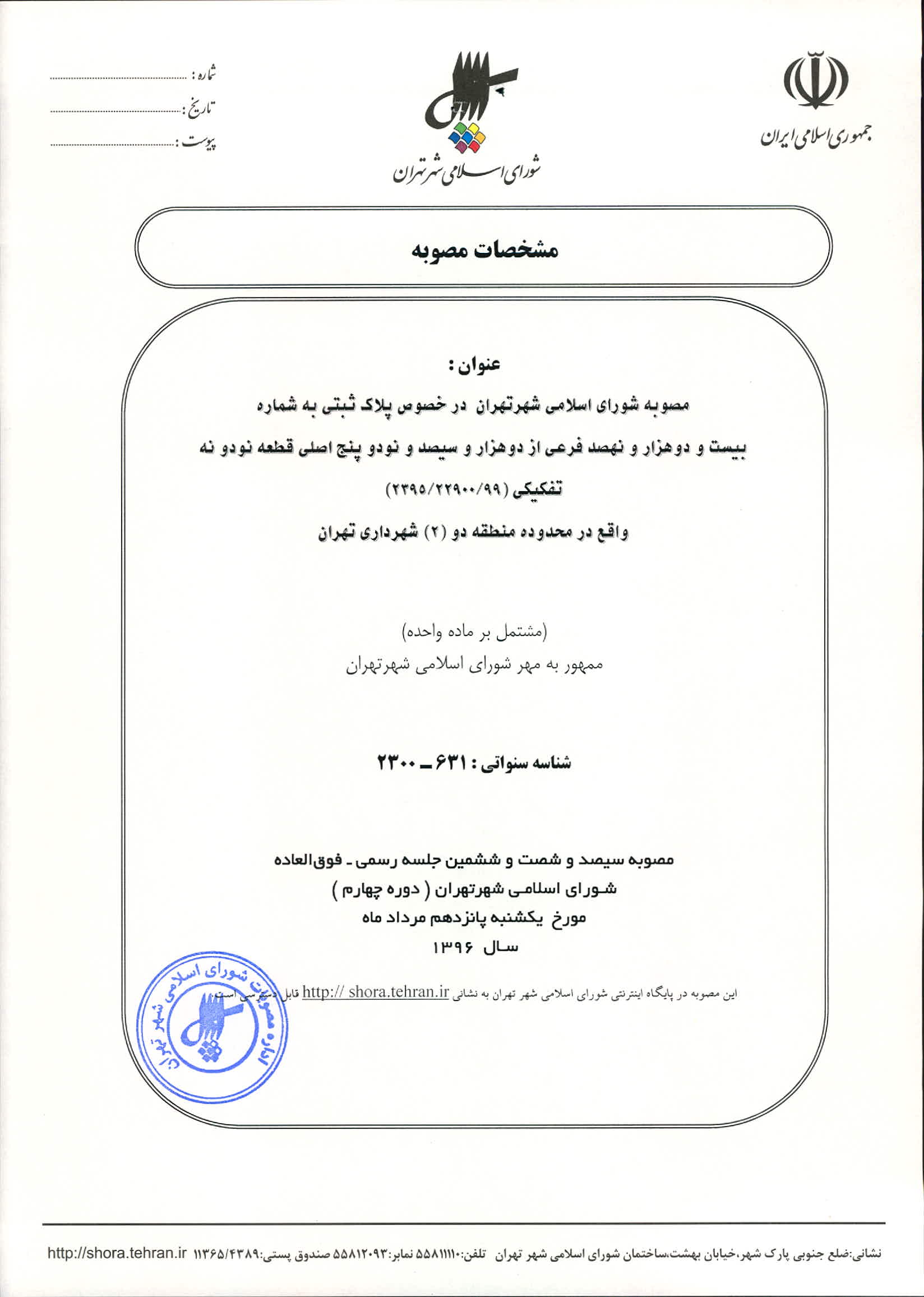 مصوبه شورای اسلامی شهر تهران در خصوص پلاك ثبتي به شماره بیست و دو هزار و نهصد فرعی از دو هزار و سیصد و نود و پنج اصلی قطعه نود و نه تفکیکی (2395/22900/99) واقع در محدوده منطقه دو (2) شهرداري تهران