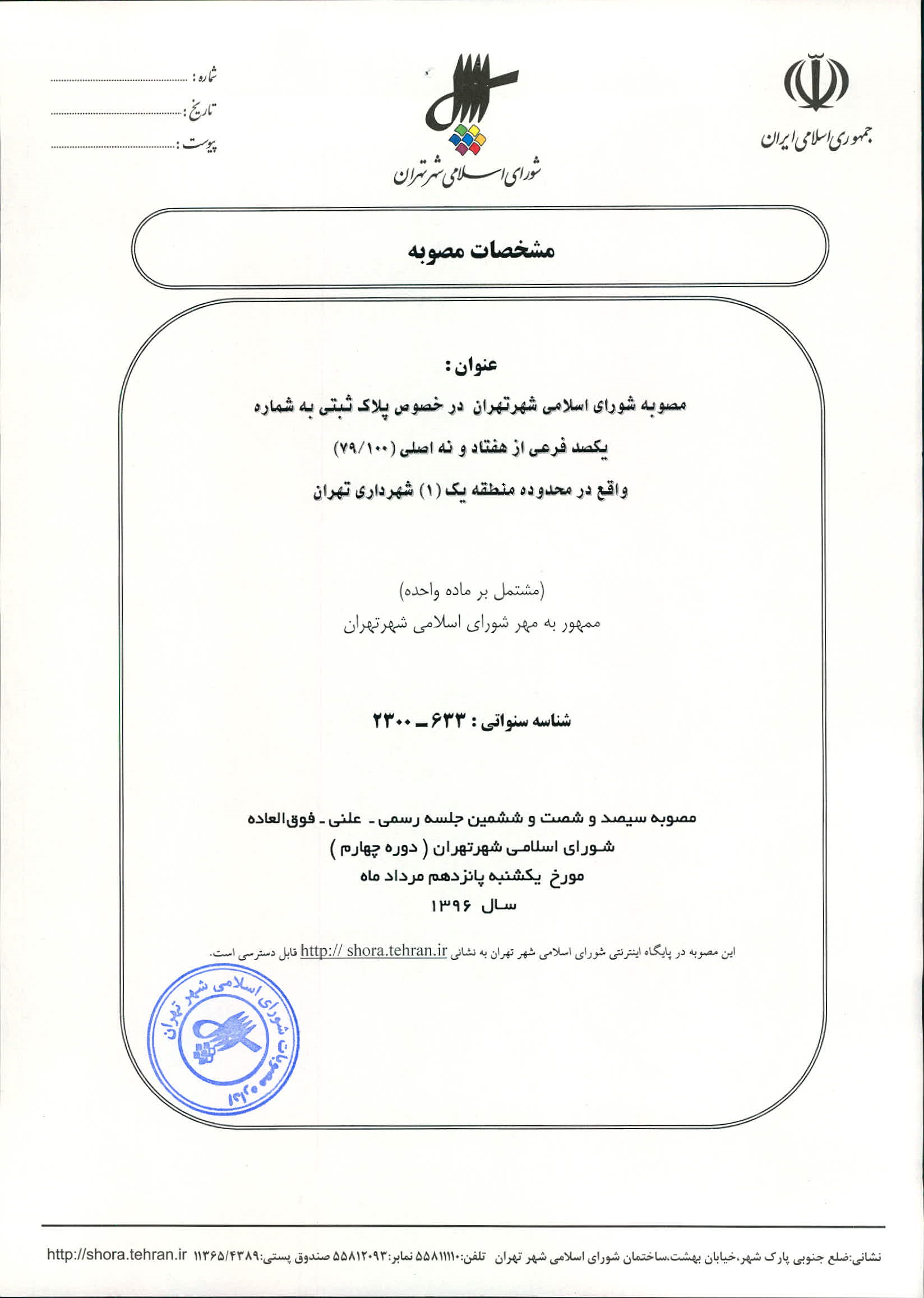 مصوبه شوراي اسلامي شهر تهران در خصوص پلاك ثبتي به شماره يكصد فرعي از هفتاد و نه اصلي (79/100) واقع در محدوده منطقه يك (1) شهرداري تهران