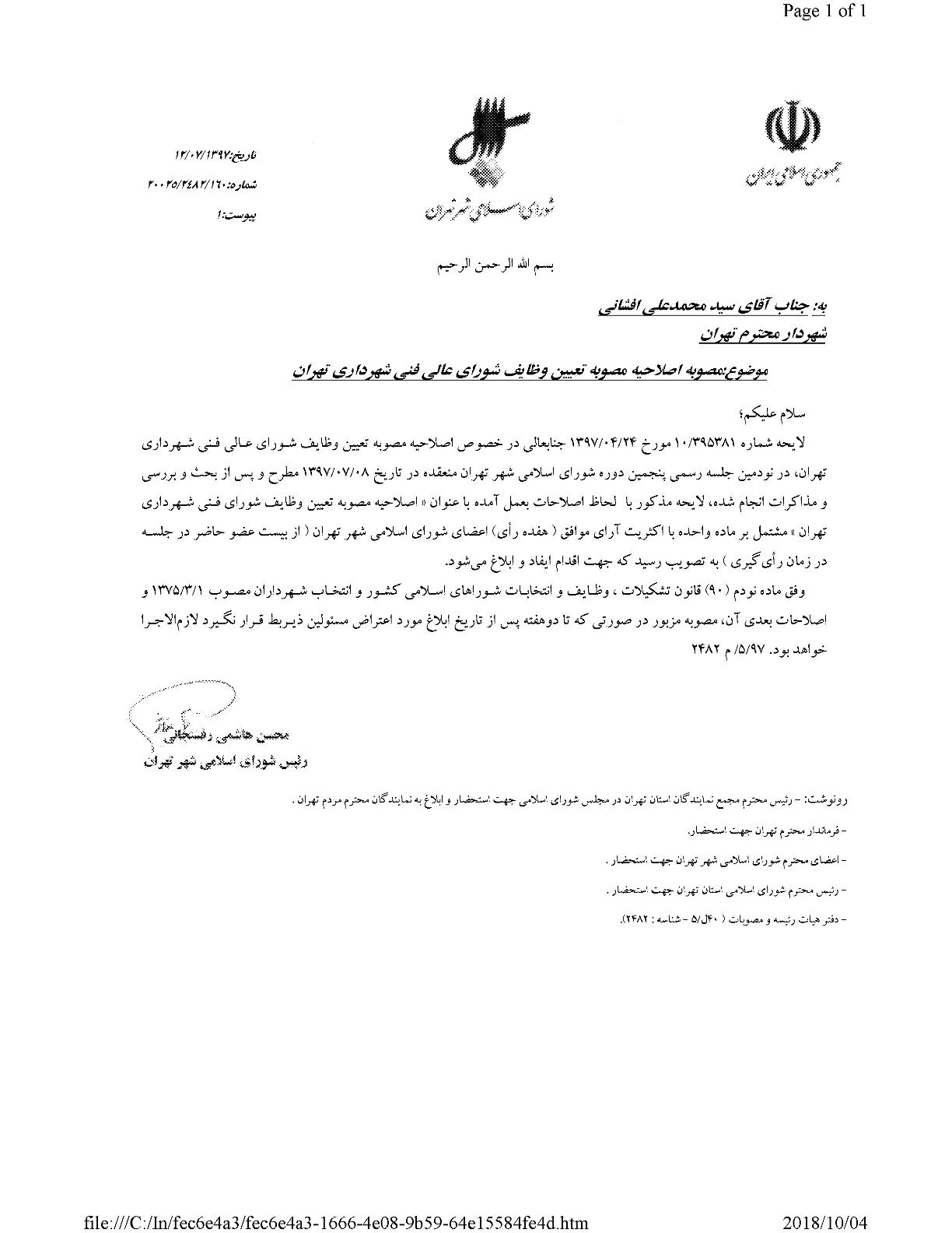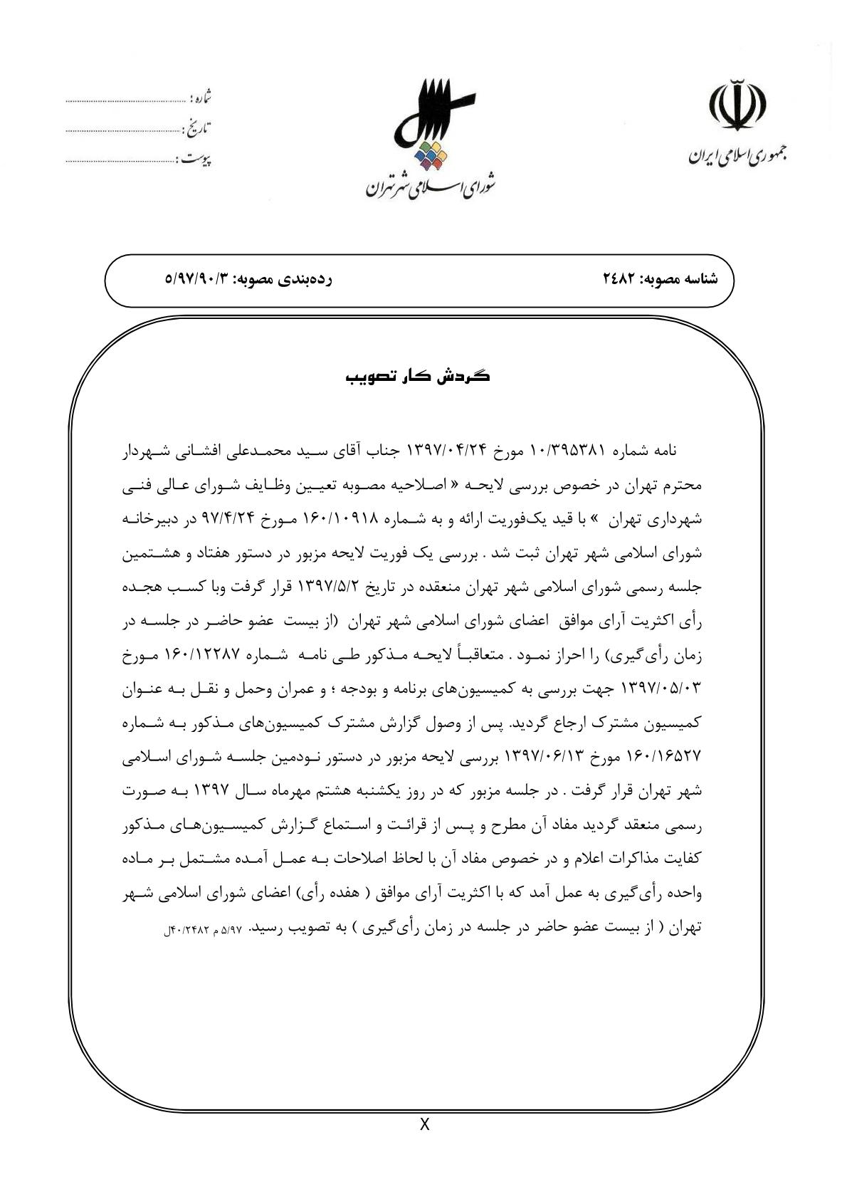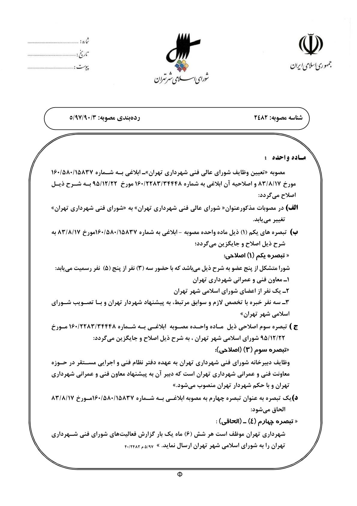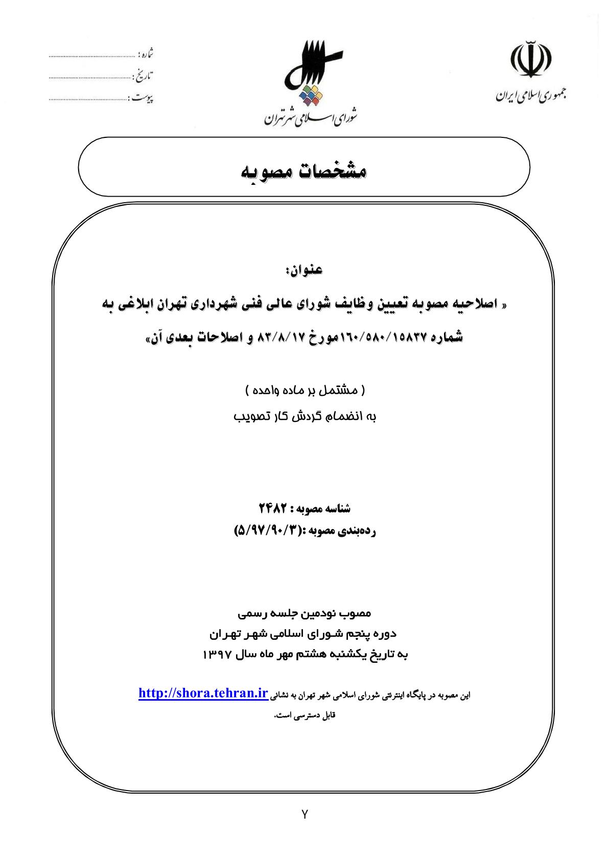 اصلاحيه مصوبه تعيين وظايف شوراي عالي فني شهرداري تهران ابلاغي به شماره 160/580/15837 مورخ 83/8/17 و اصلاحات بعدي آن