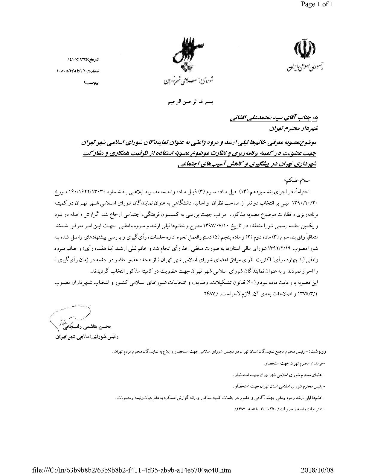 معرفي خانمها ليلي ارشد و مروه وامقي بهعنوان نمايندگان شوراي اسلامي شهر تهران جهت عضويت در كميته برنامهريزي و نظارت موضوع مصوبه استفاده از ظرفيت همكاري و مشاركت شهرداري تهران در پيشگيري و كاهش آسيبهاي اجتماعي