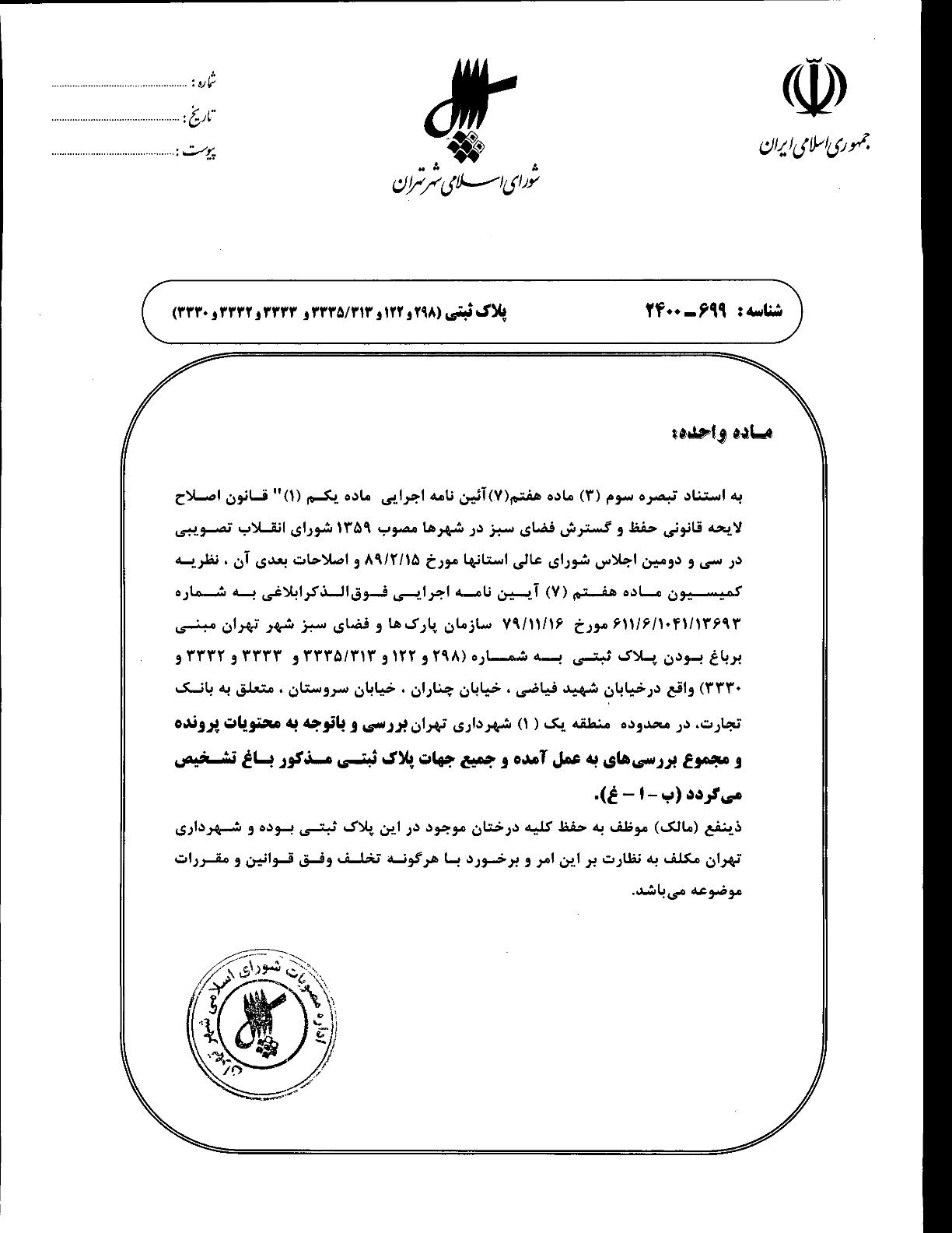 مصوبه شوراي اسلامي شهرتهران در خصوص پلاك ثبتي به شماره (298 و 122 و 3335/313 و 3333 و 3332 و 3330) واقع در محدوده منطقه يك (1) شهرداري تهران