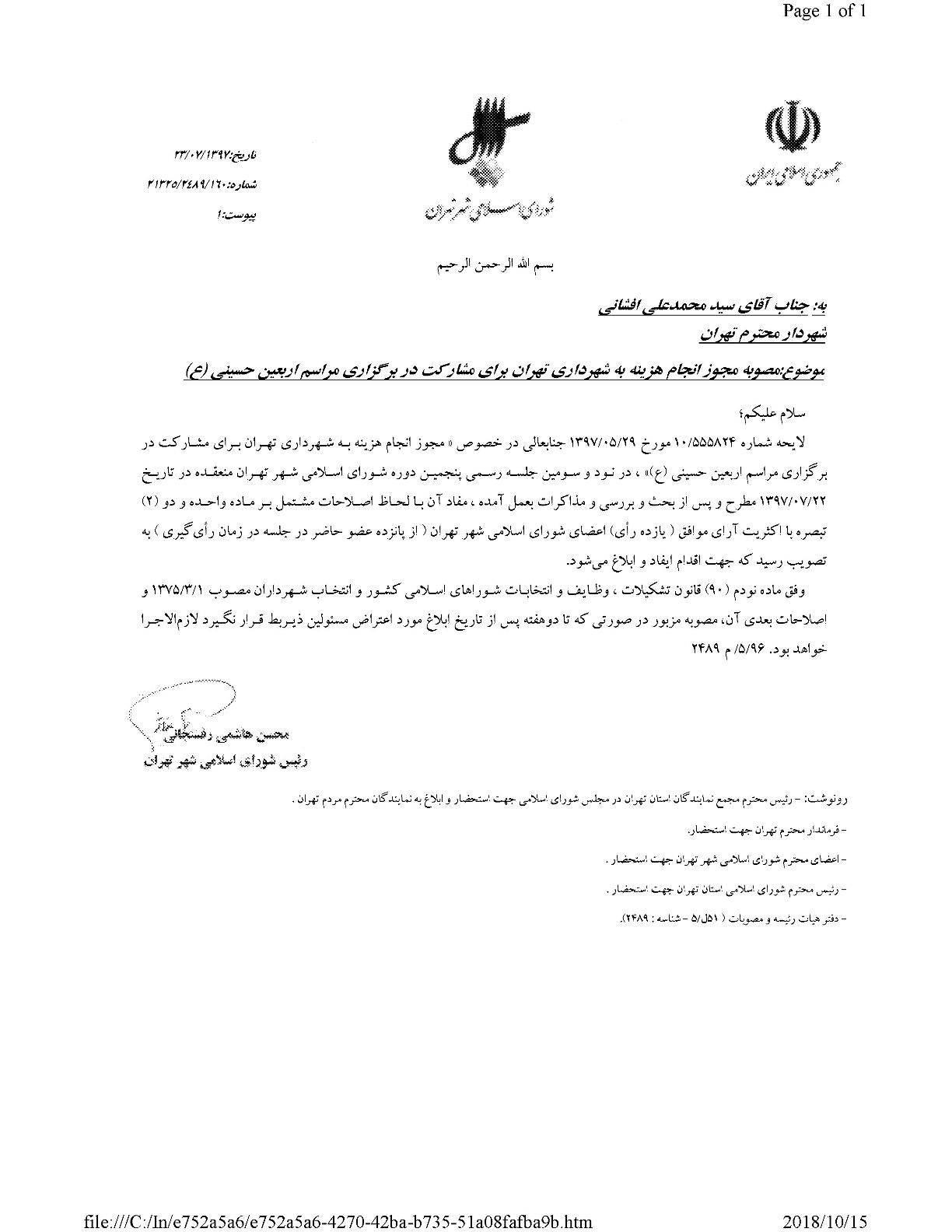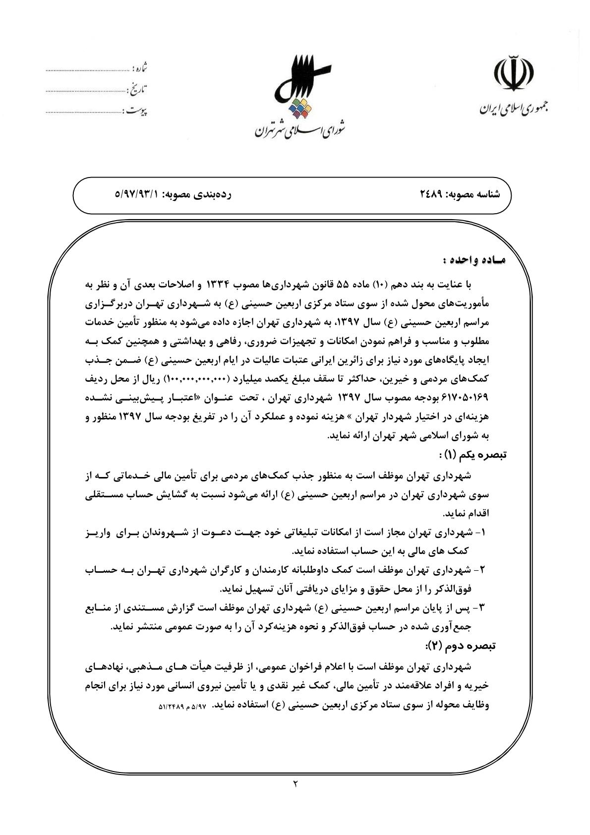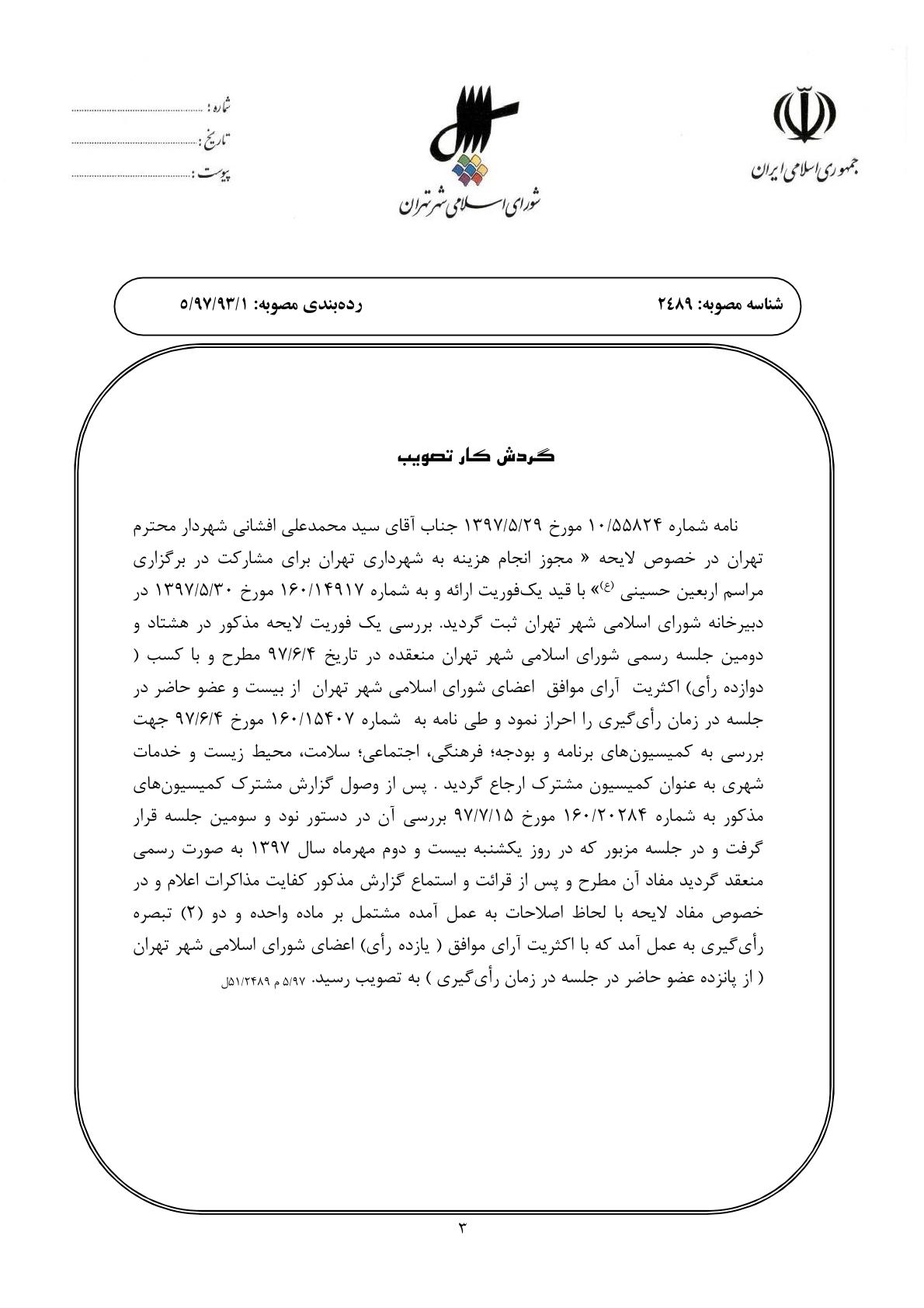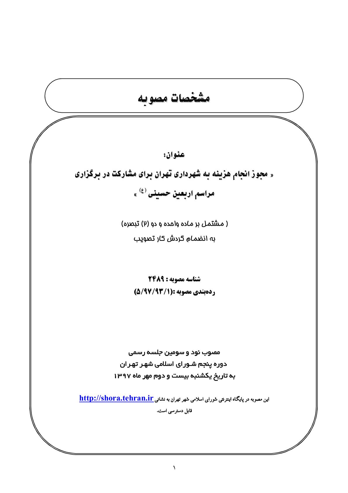 مجوز انجام هزينه به شهرداري تهران براي مشاركت در برگزاري مراسم اربعين حسيني(ع)