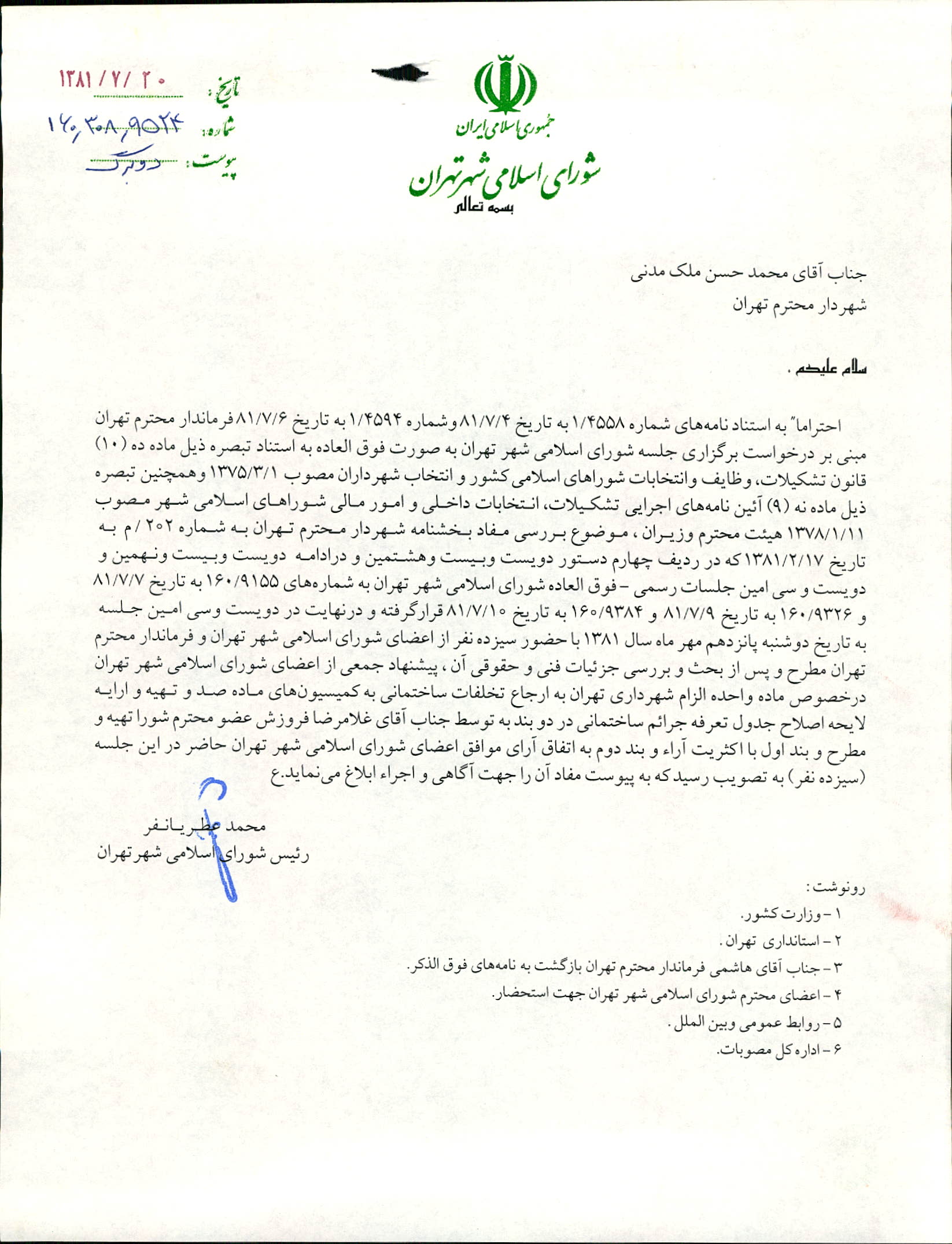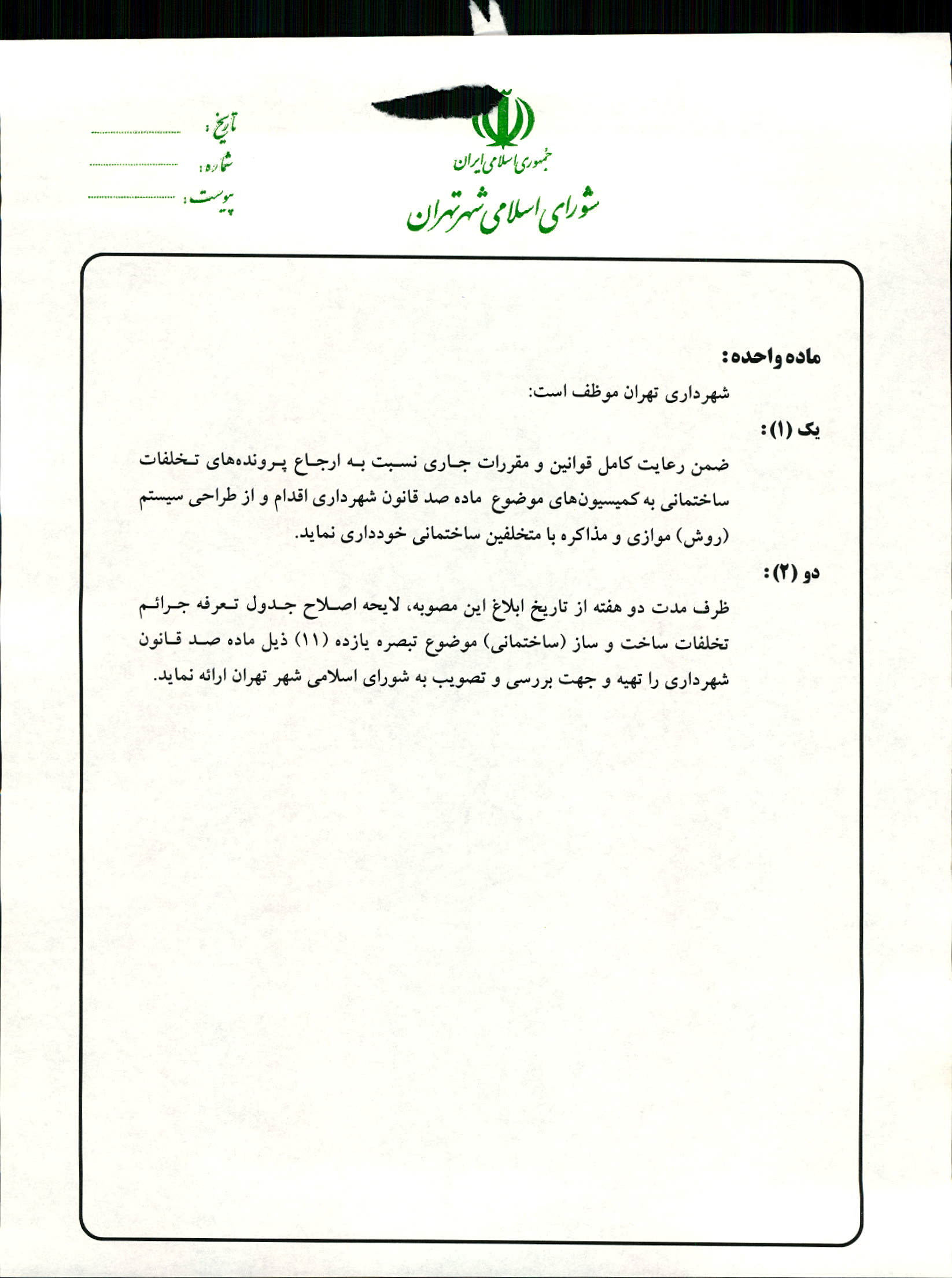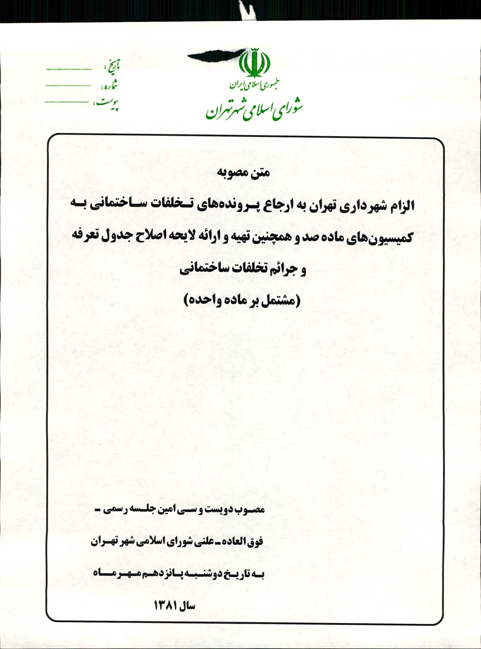 الزام شهرداری تهران به ارجاع پرونده های تخلفات ساختمانی به کمیسیون های ماده صد و همچنین تهیه و ارائه لایحه اصلاح جدول تعرفه و جرائم تخلفات ساختمانی