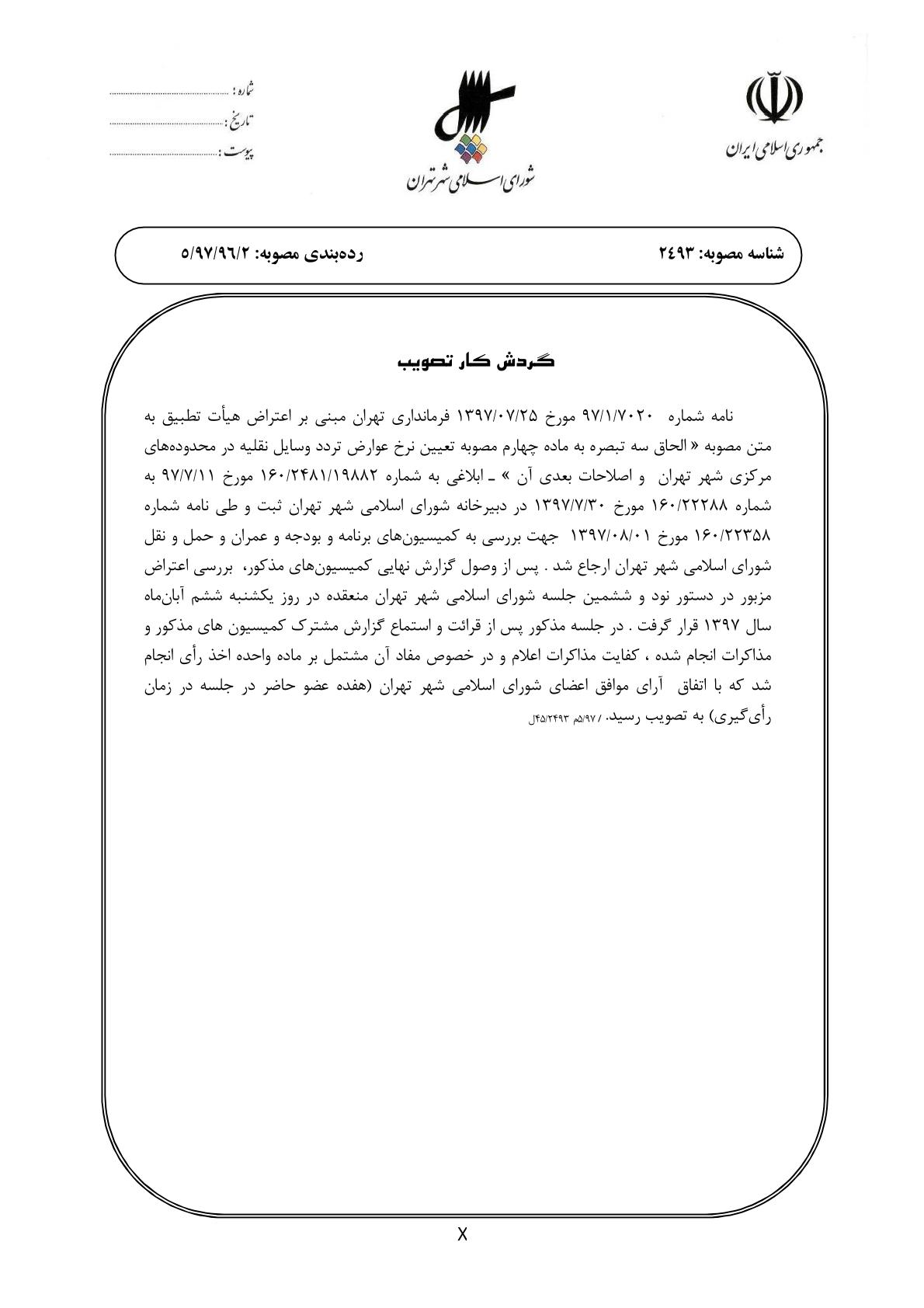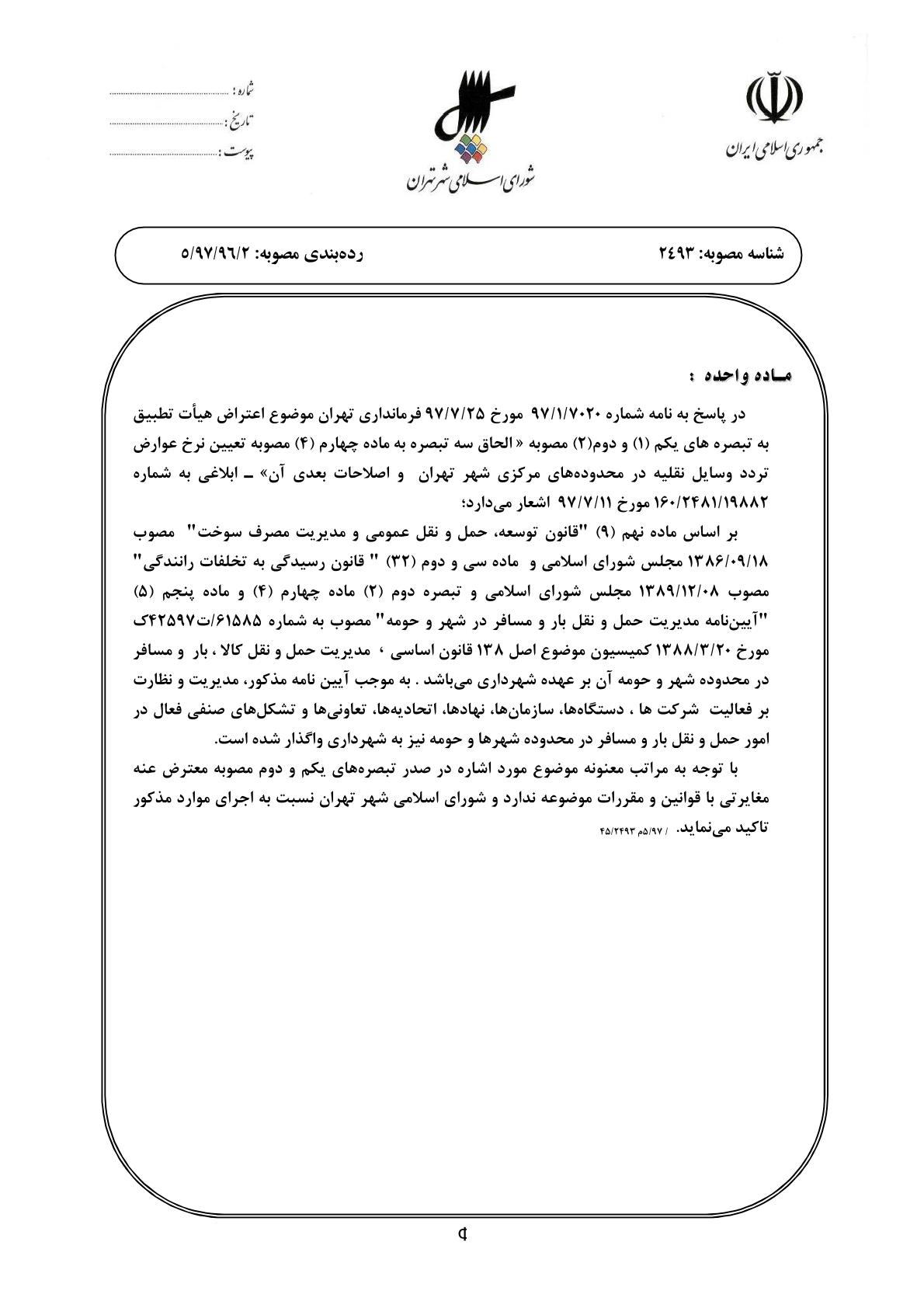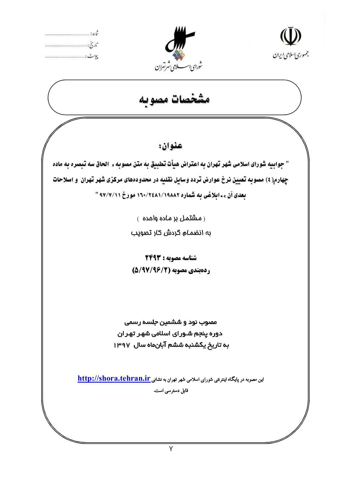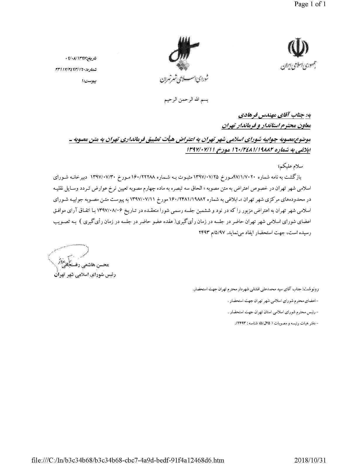 جوابيه شوراي اسلامي شهر تهران به اعتراض هيأت تطبيق به متن مصوبه «الحاق سه تبصره به ماده چهارم (4) مصوبه تعيين نرخ عوارض تردد وسايل نقليه در محدودههاي مركزي شهر تهران و اصلاحات بعدي آن» ـ ابلاغي به شماره 160/2481/19882 مورخ 97/7/11