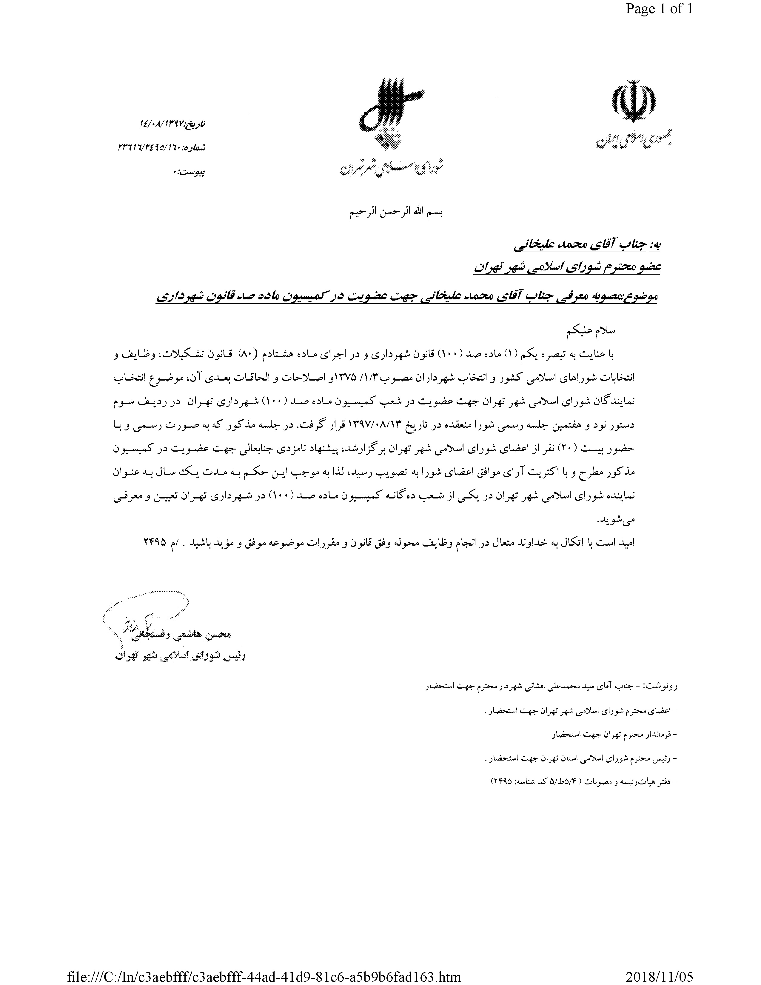 معرفي جناب آقاي محمد عليخاني جهت عضويت در كميسيون ماده صد قانون شهرداري