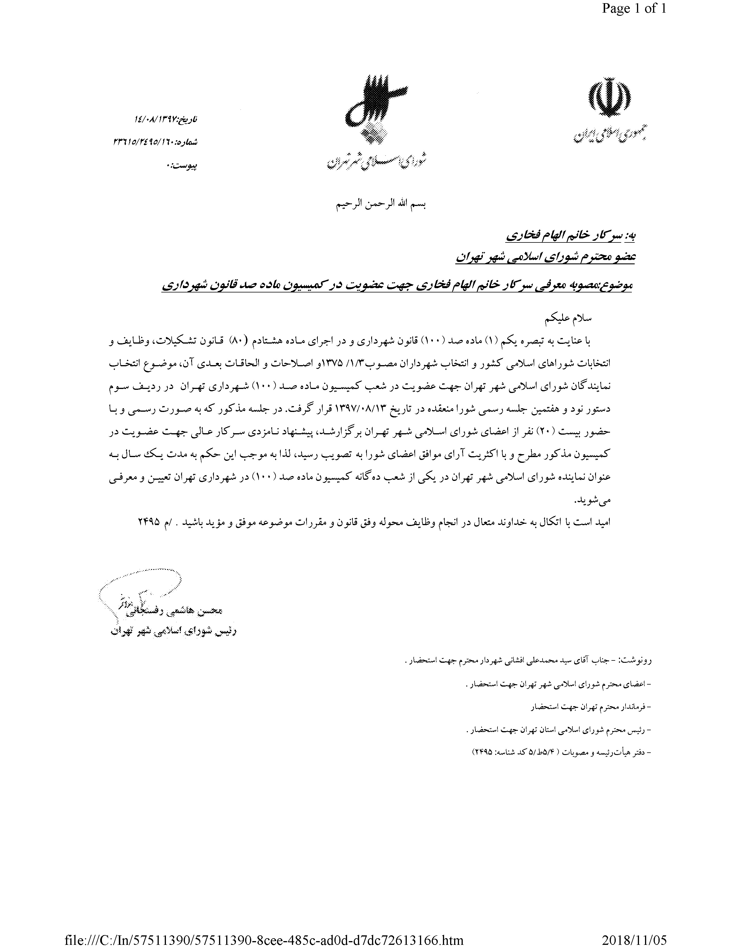 معرفي سركار خانم الهام فخاري جهت عضويت در كميسيون ماده صد قانون شهرداري