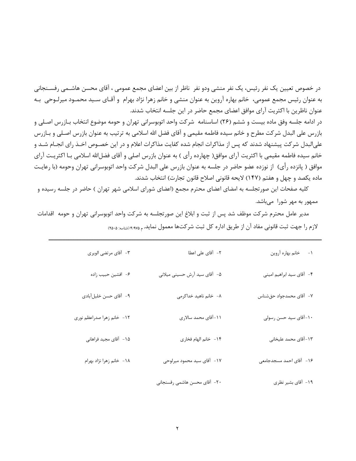 صورتجلسه مجمع عمومي عادي (به صورت فوق العاده) شركت واحد اتوبوسراني تهران و حومه منعقده در تاريخ يكشنبه بيست و پنجم آذرماه سال 1397