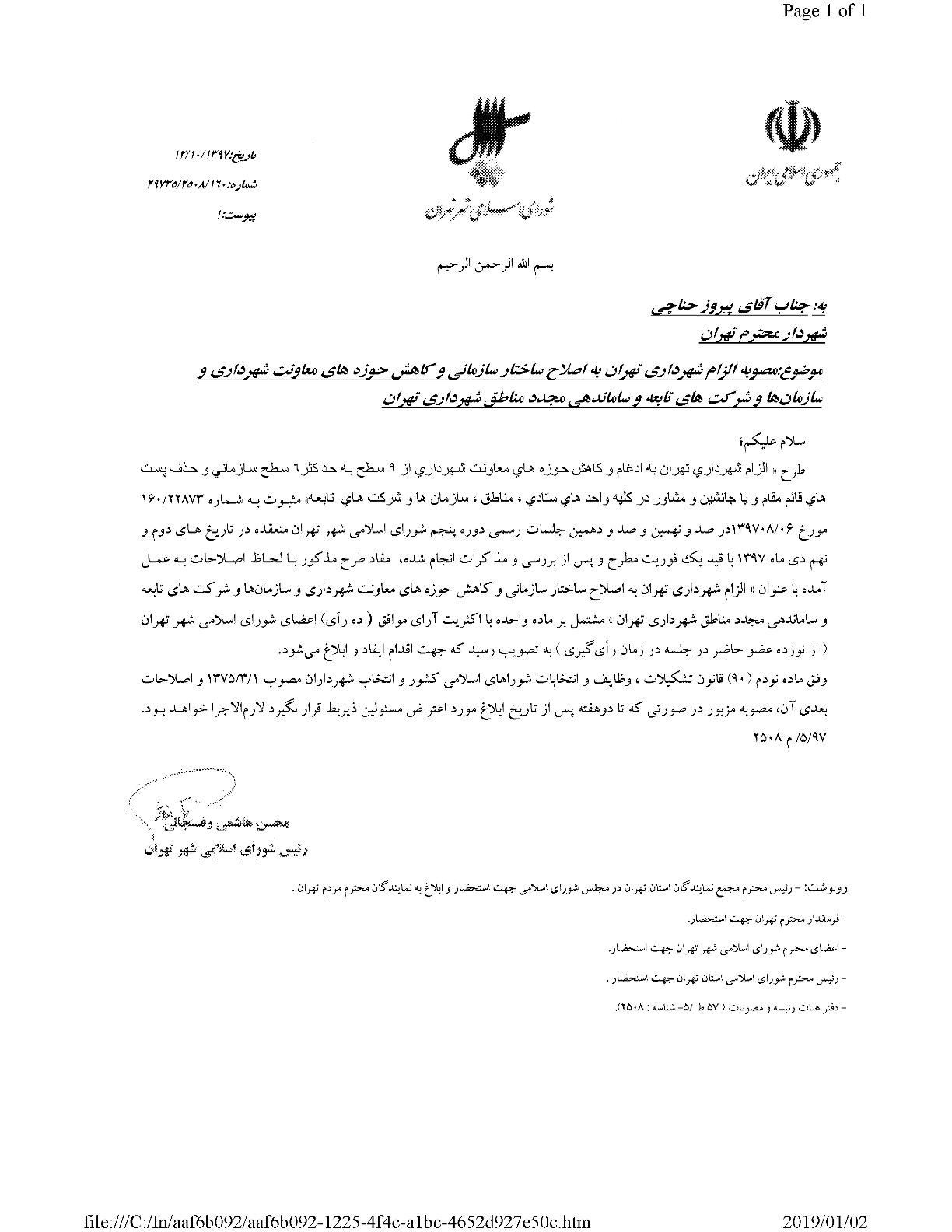 الزام شهرداري تهران به اصلاح ساختار سازماني و كاهش حوزههاي معاونت شهرداري و سازمانها و شركتهاي تابعه و ساماندهي مجدد مناطق شهرداري تهران