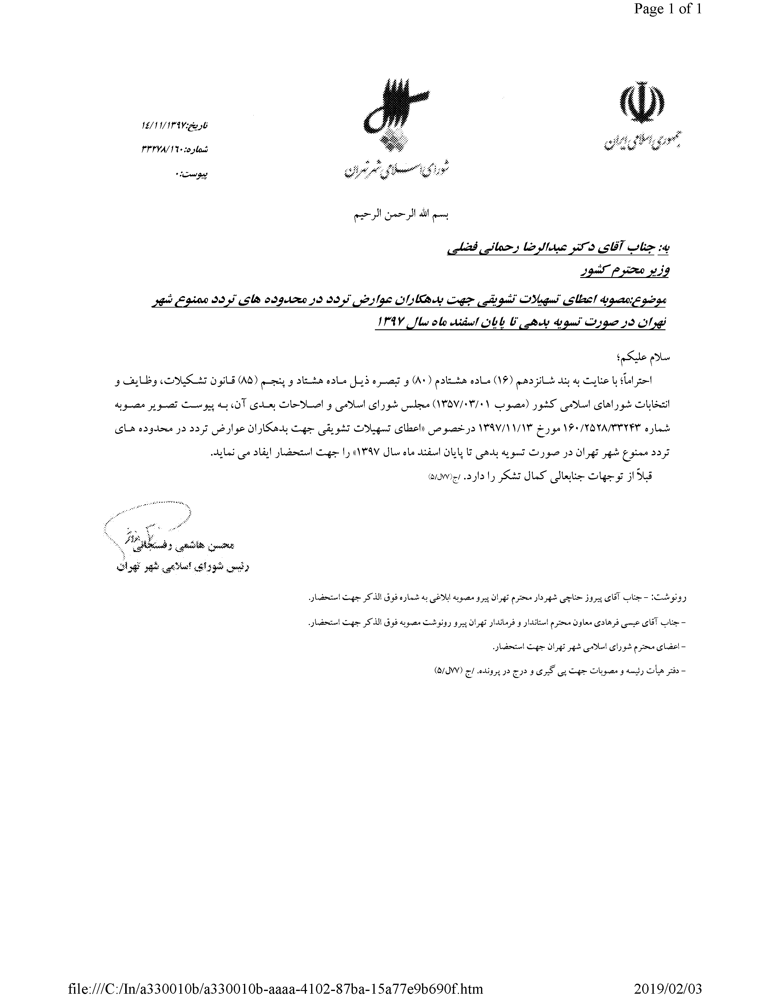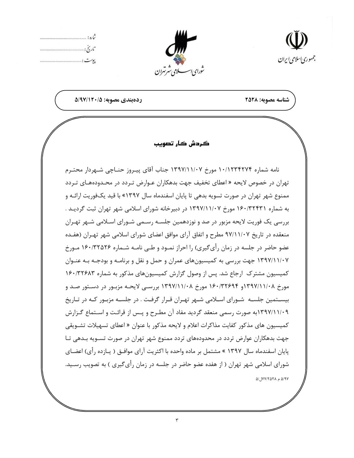 اعطاي تسهيلات تشويقي جهت بدهكاران عوارض تردد در محدودههاي تردد ممنوع شهر تهران در صورت تسويه بدهي تا پايان اسفندماه سال 1397