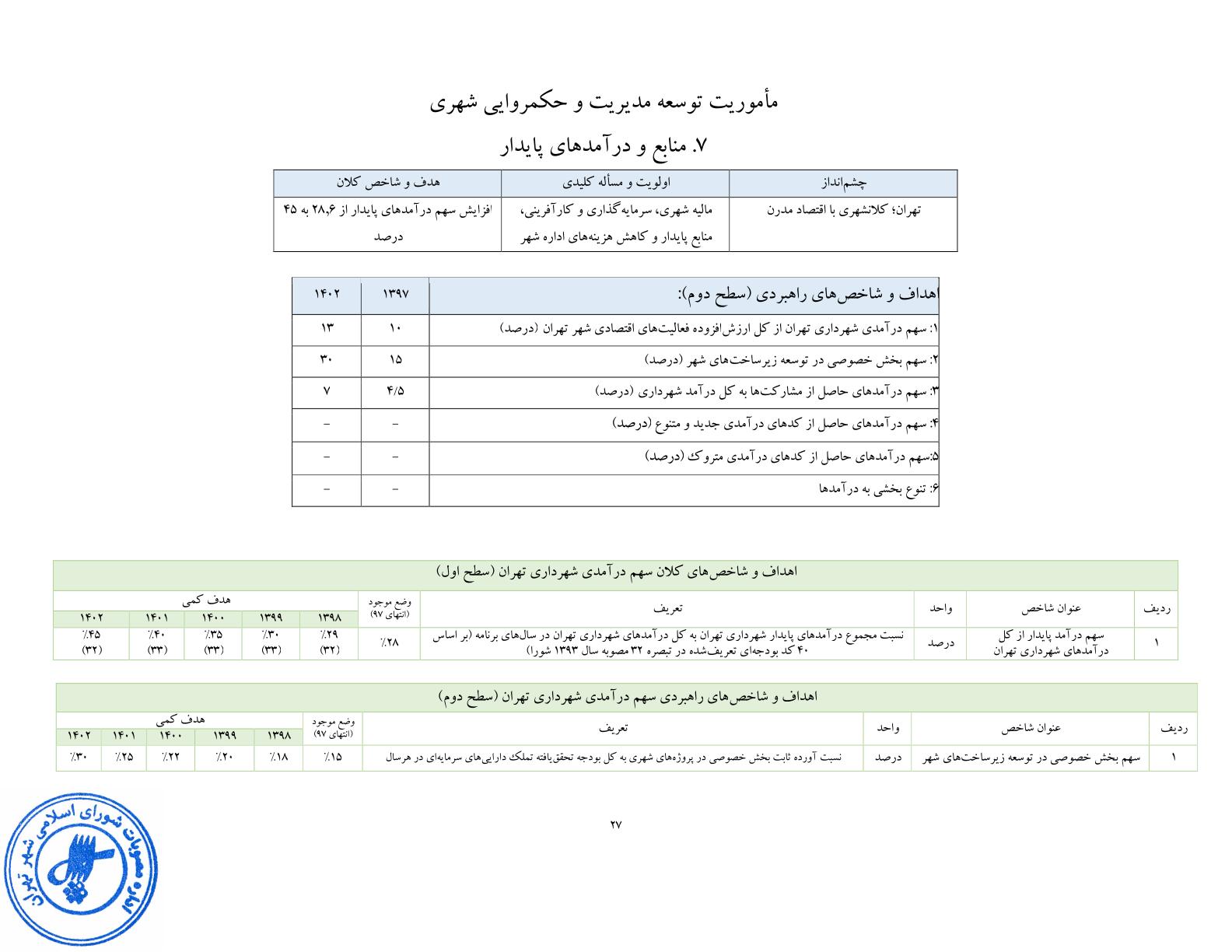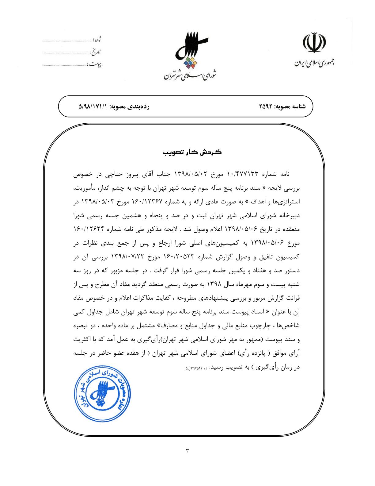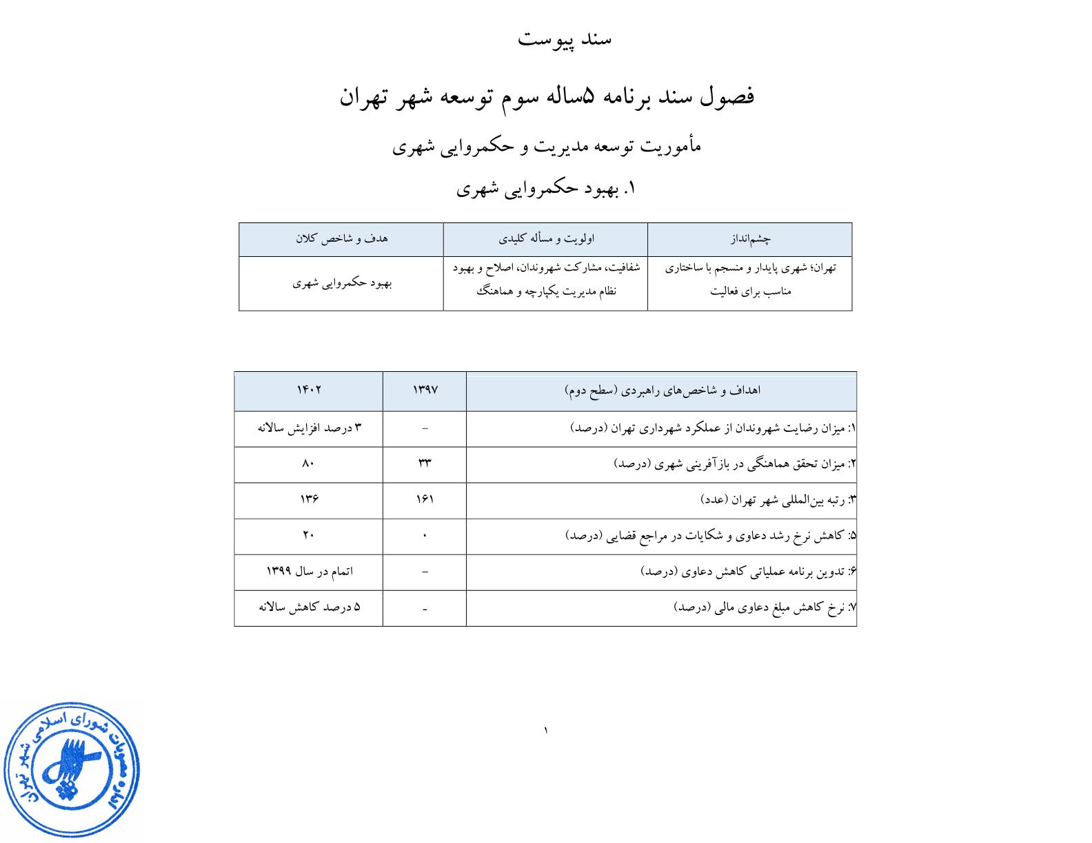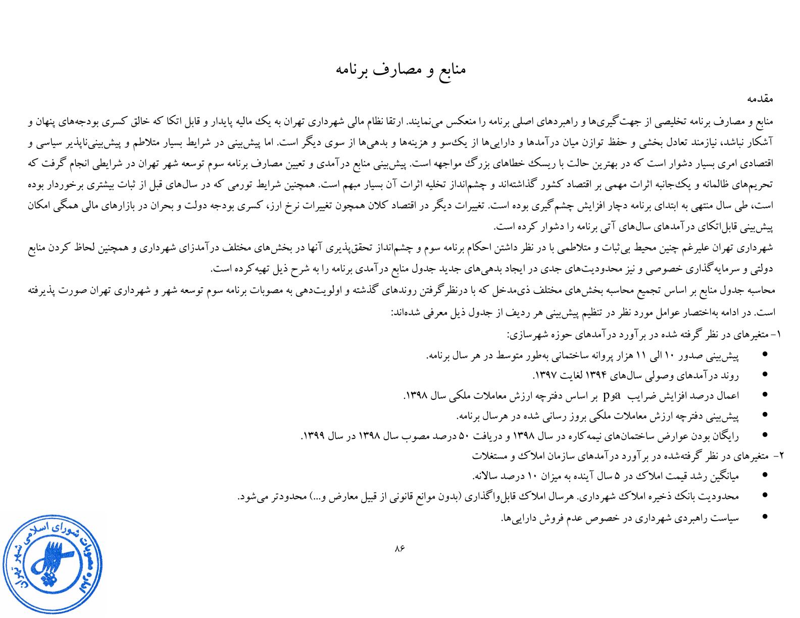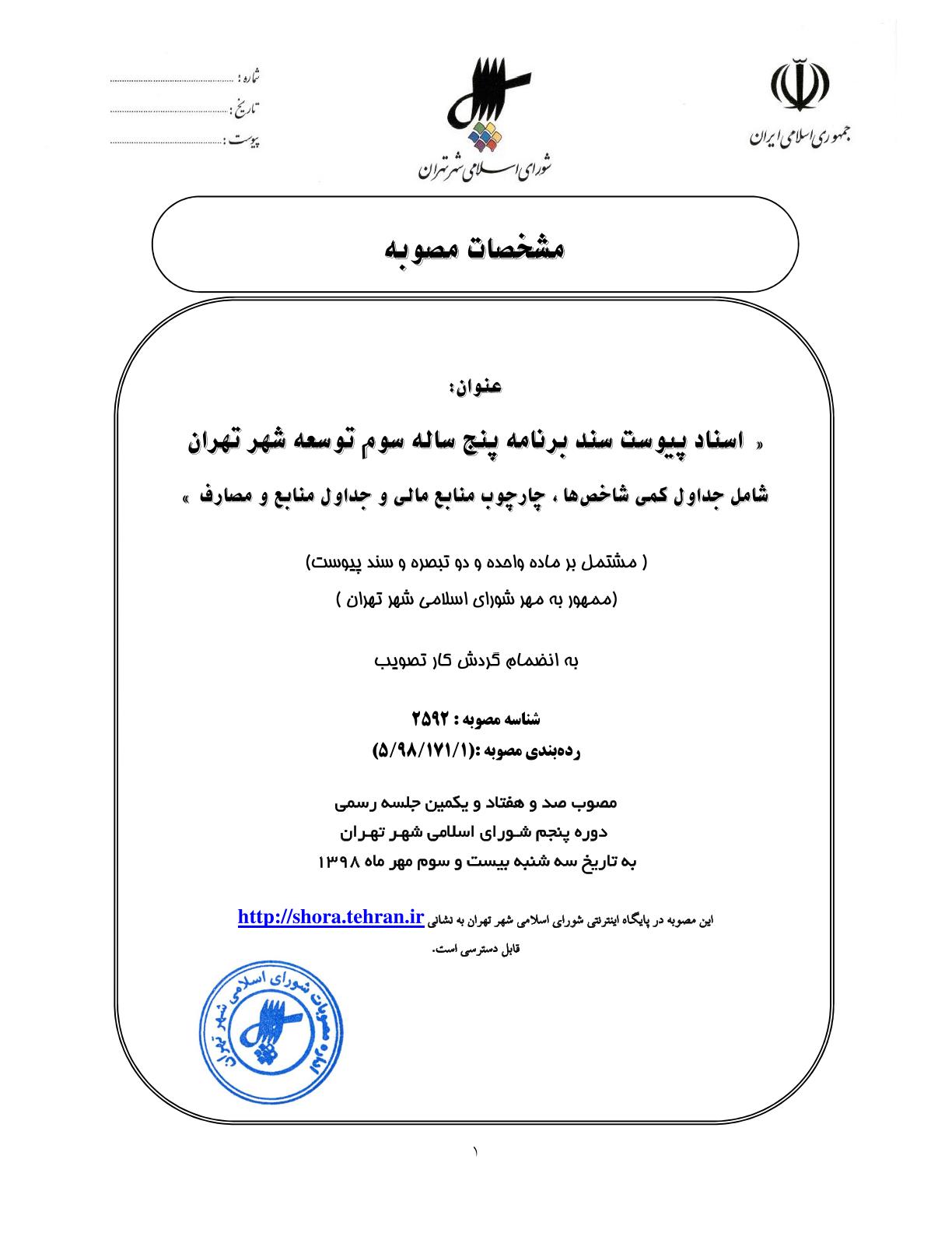اسناد پيوست سند برنامه پنج ساله سوم توسعه شهر تهران شامل جداول كمي شاخص‌ها، چارچوب منابع مالي و جداول منابع و مصارف