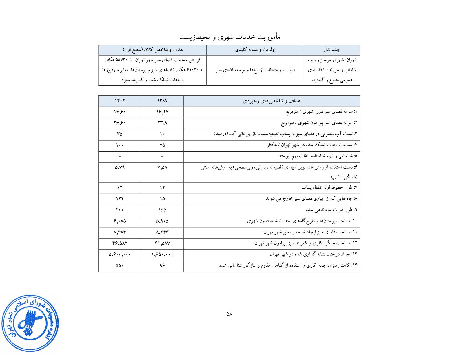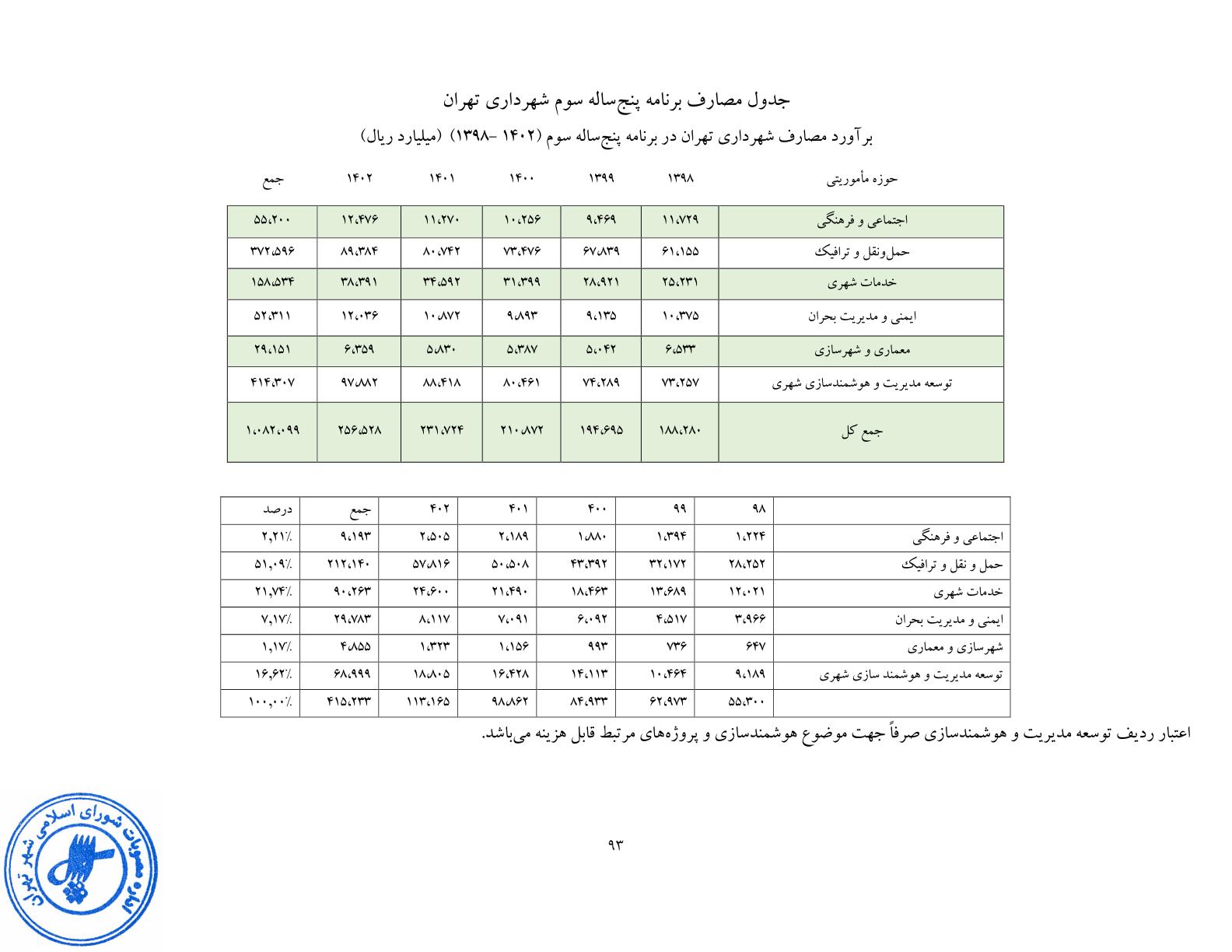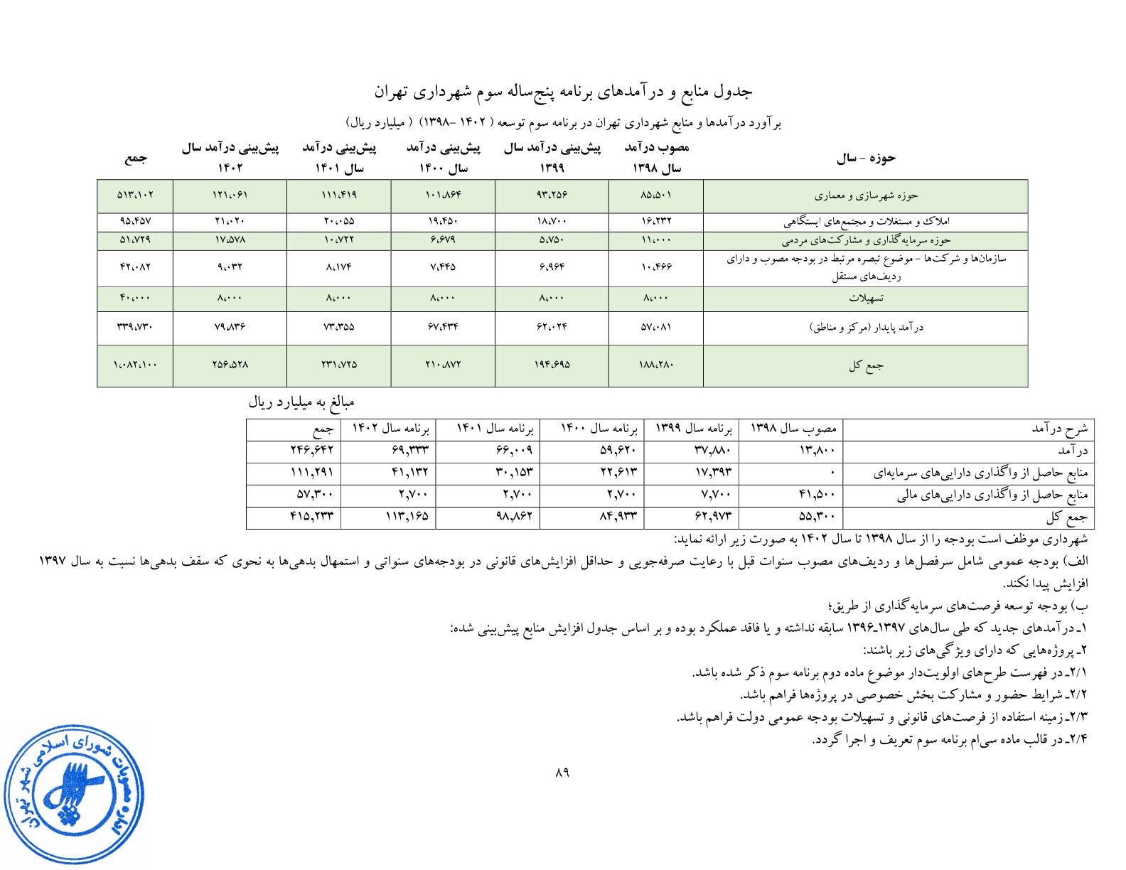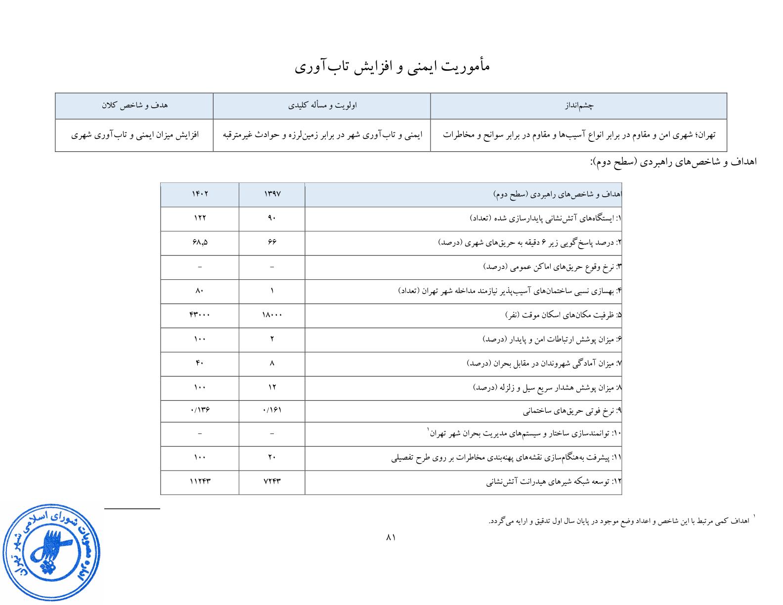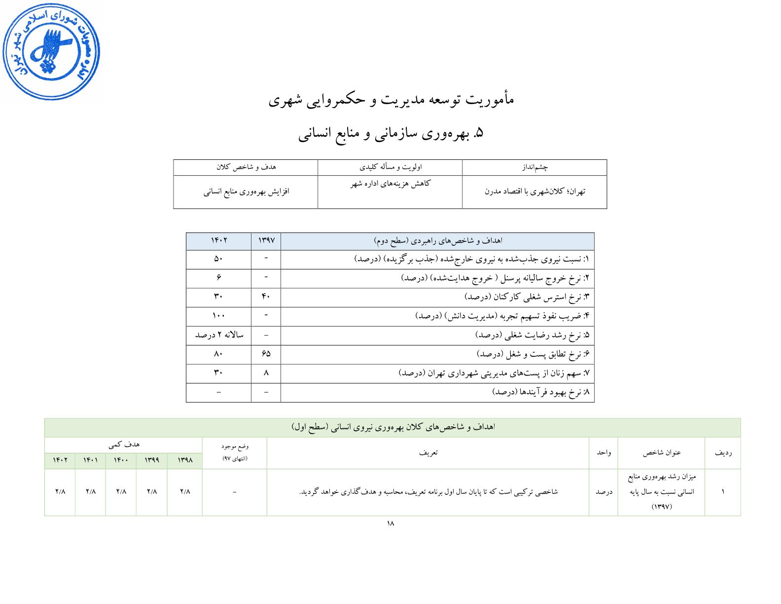 اسناد پيوست سند برنامه پنج ساله سوم توسعه شهر تهران شامل جداول كمي شاخص‌ها، چارچوب منابع مالي و جداول منابع و مصارف