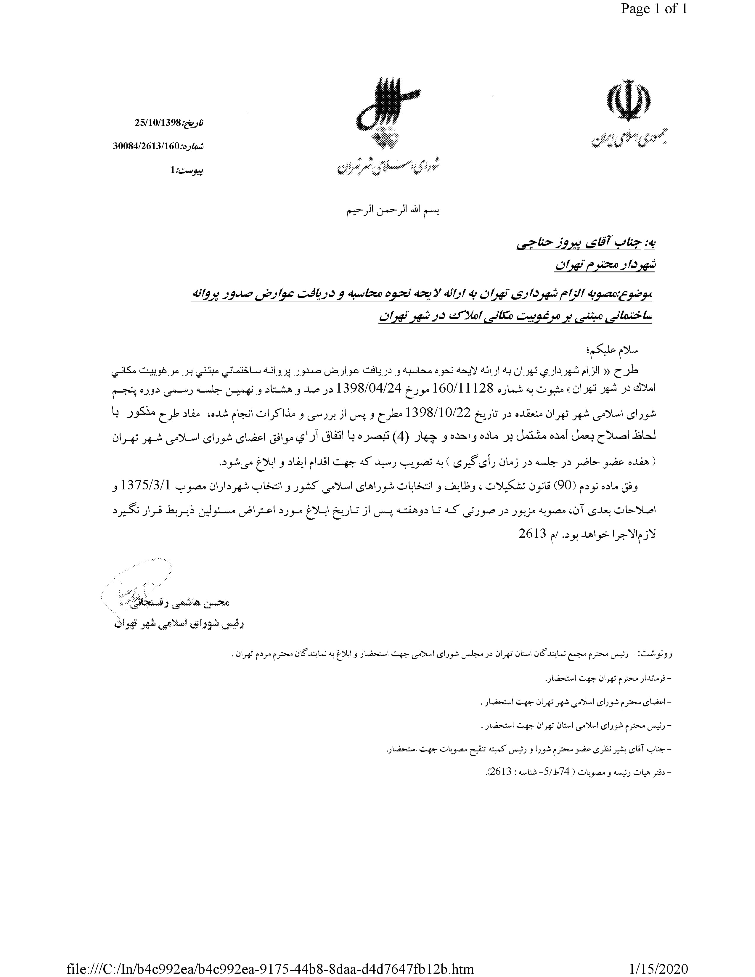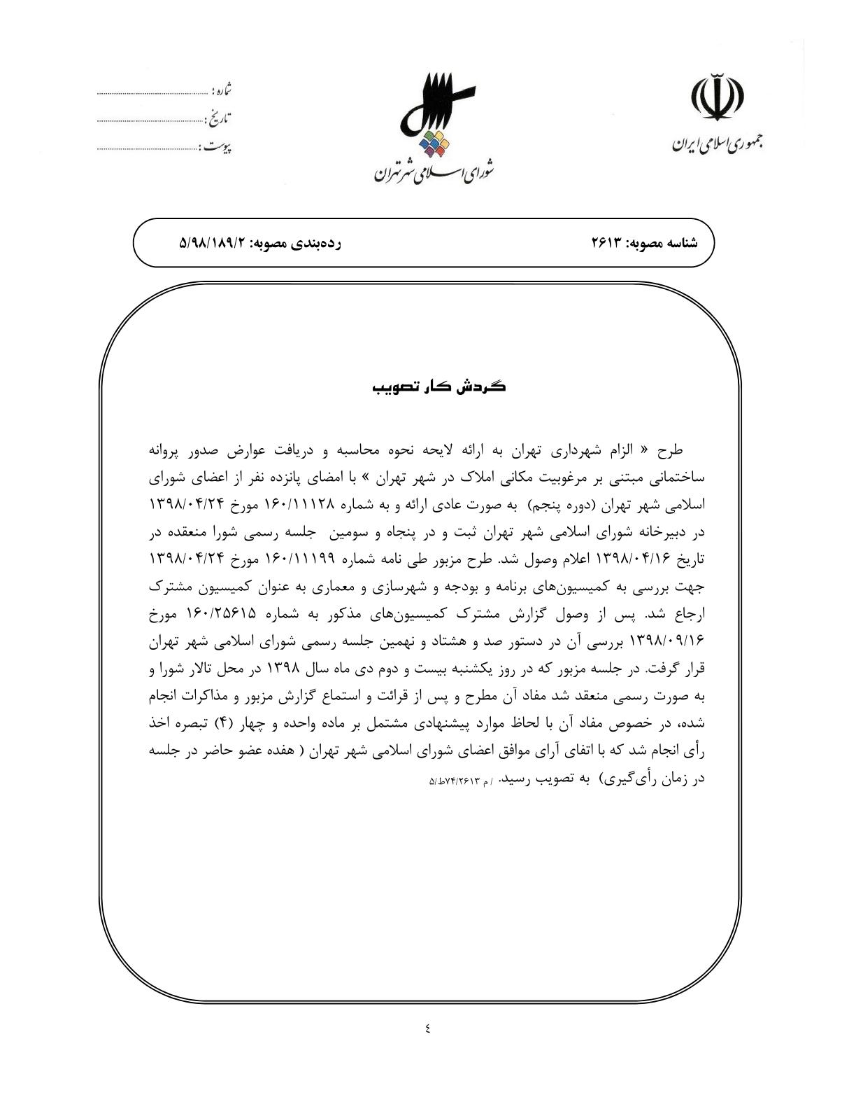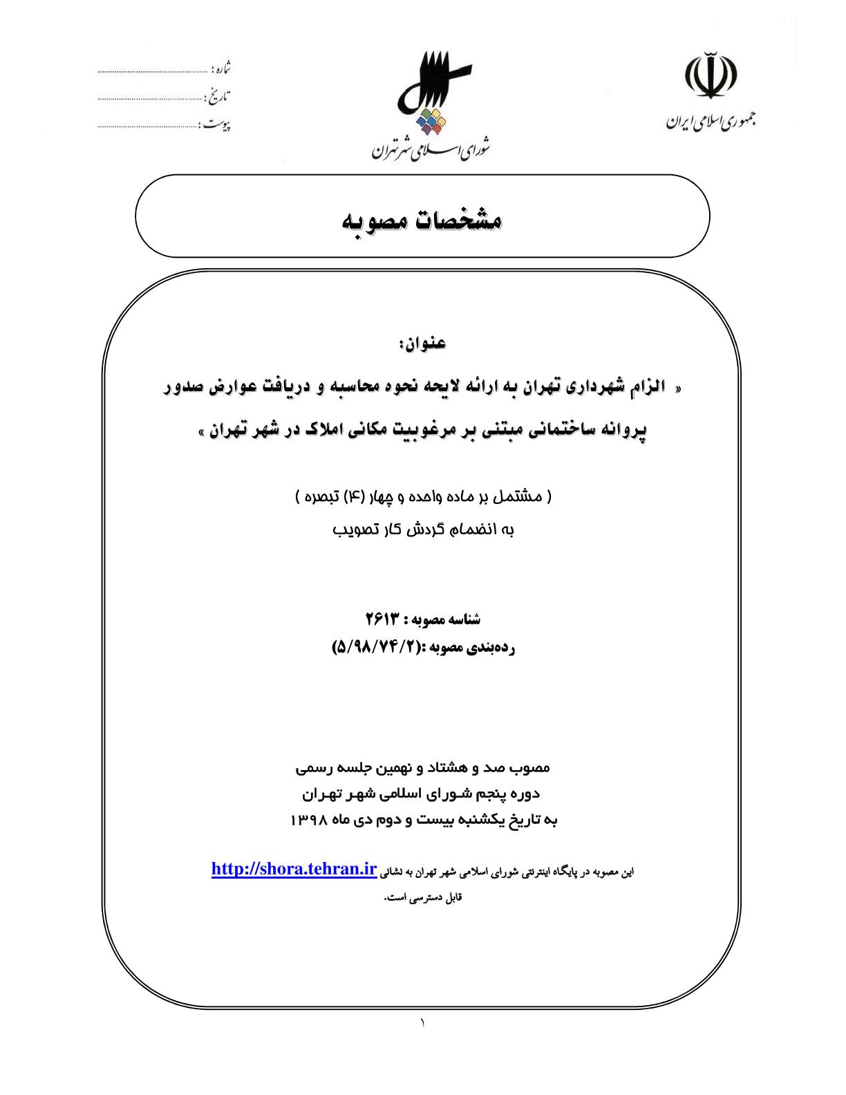 الزام شهرداري تهران به ارائه لايحه نحوه محاسبه و دريافت عوارض صدور پروانه ساختماني مبتني بر مرغوبيت مكان املاك در شهر تهران