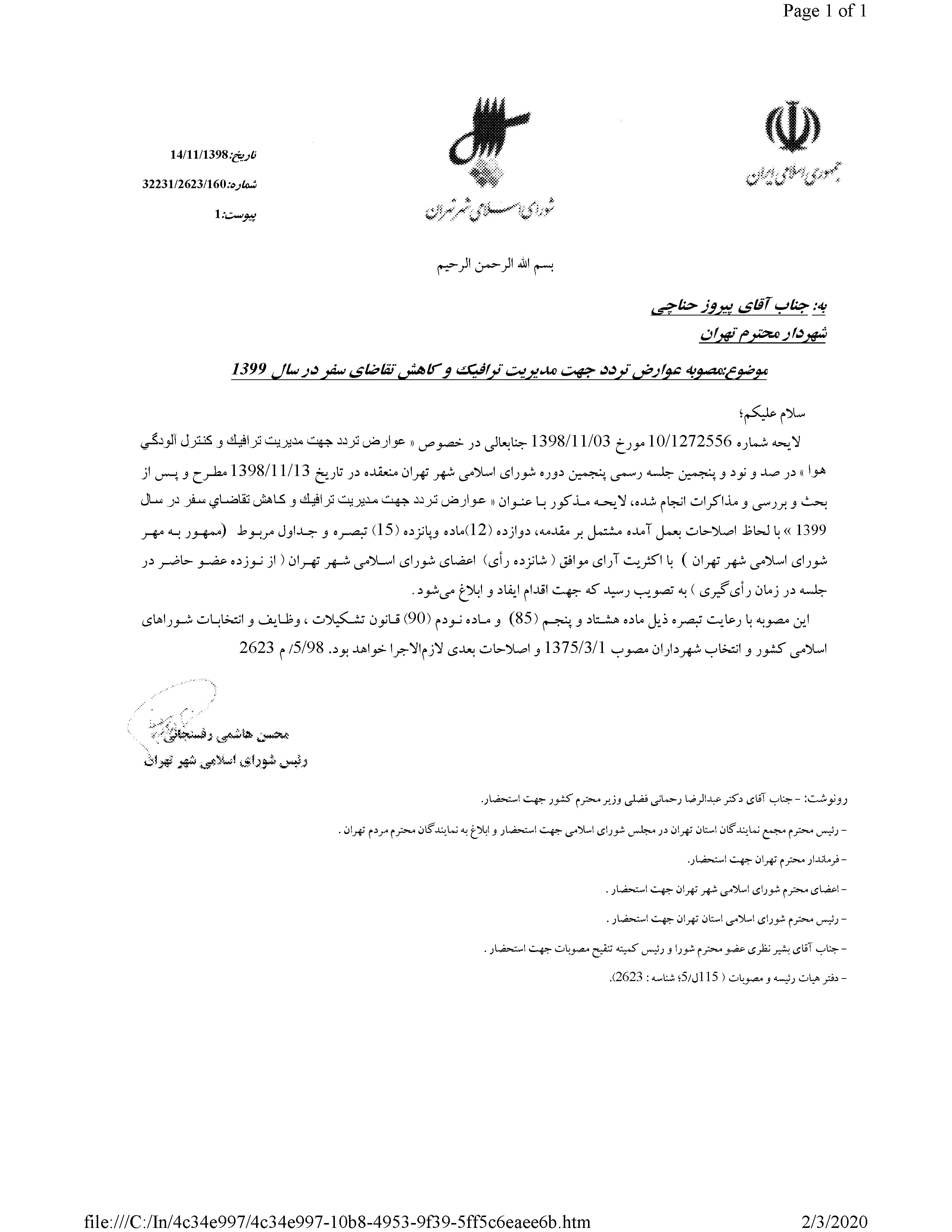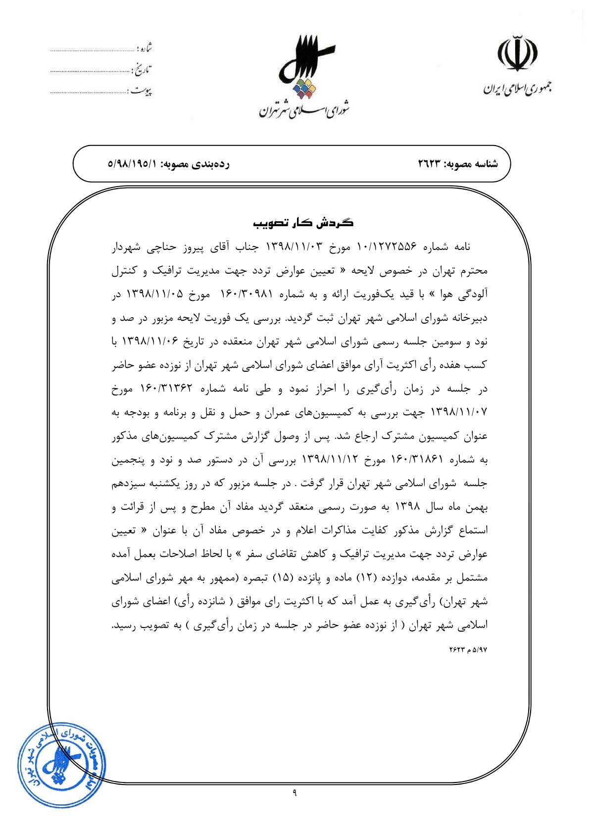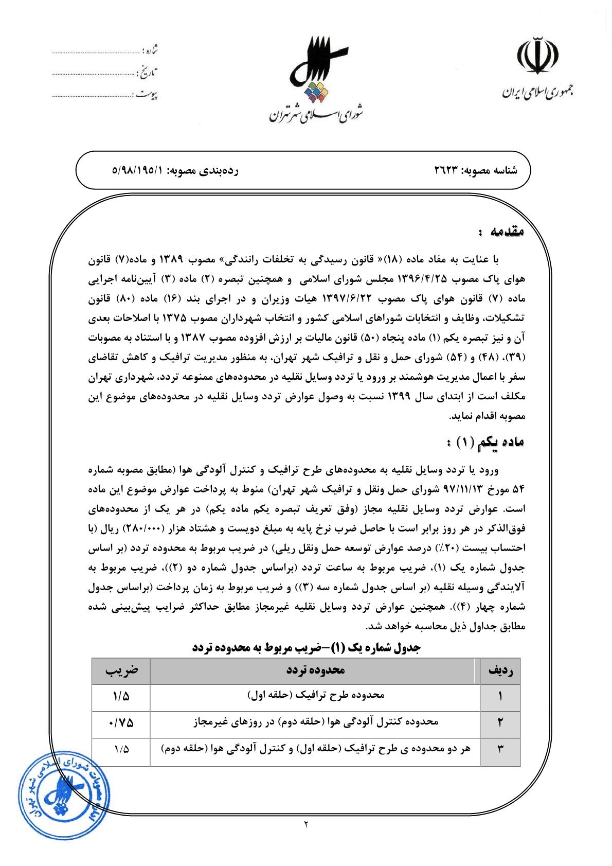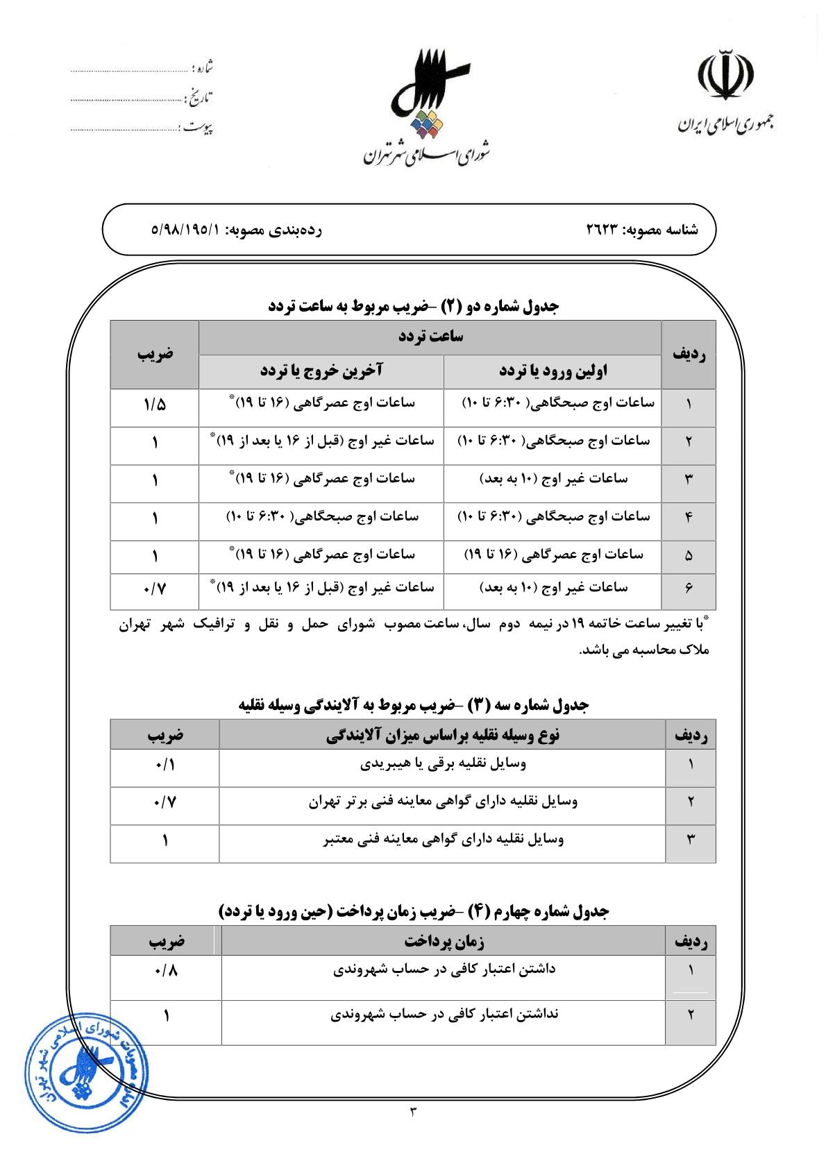 عوارض تردد جهت مديريت ترافيك، كاهش تقاضاي سفر و كنترل آلودگي هوا در سال ۱۳۹۹