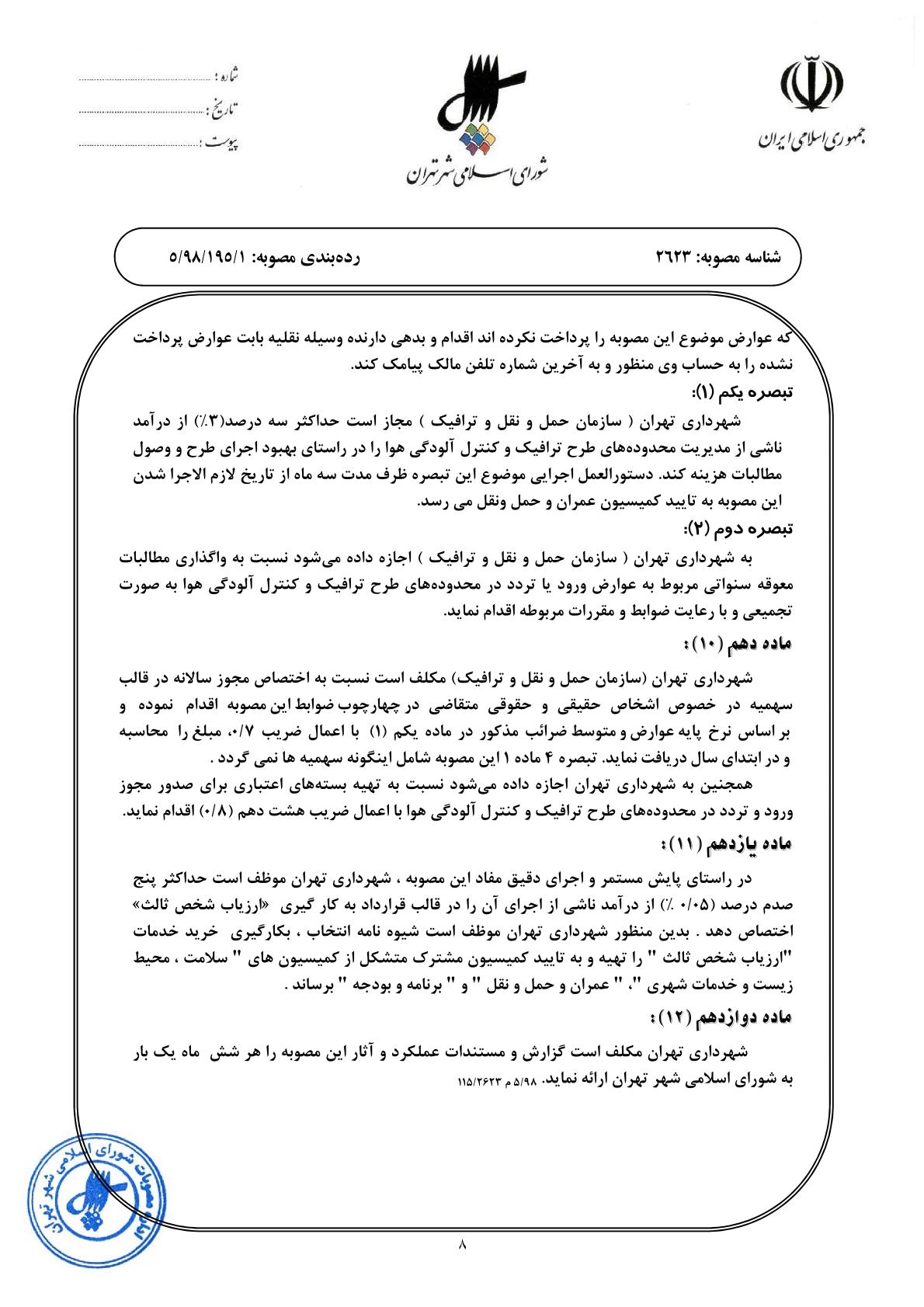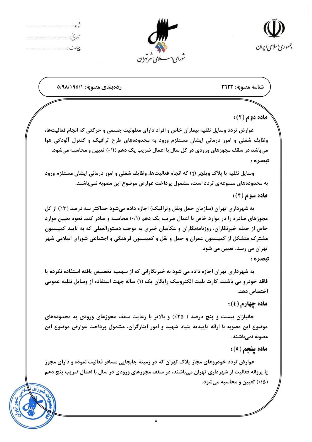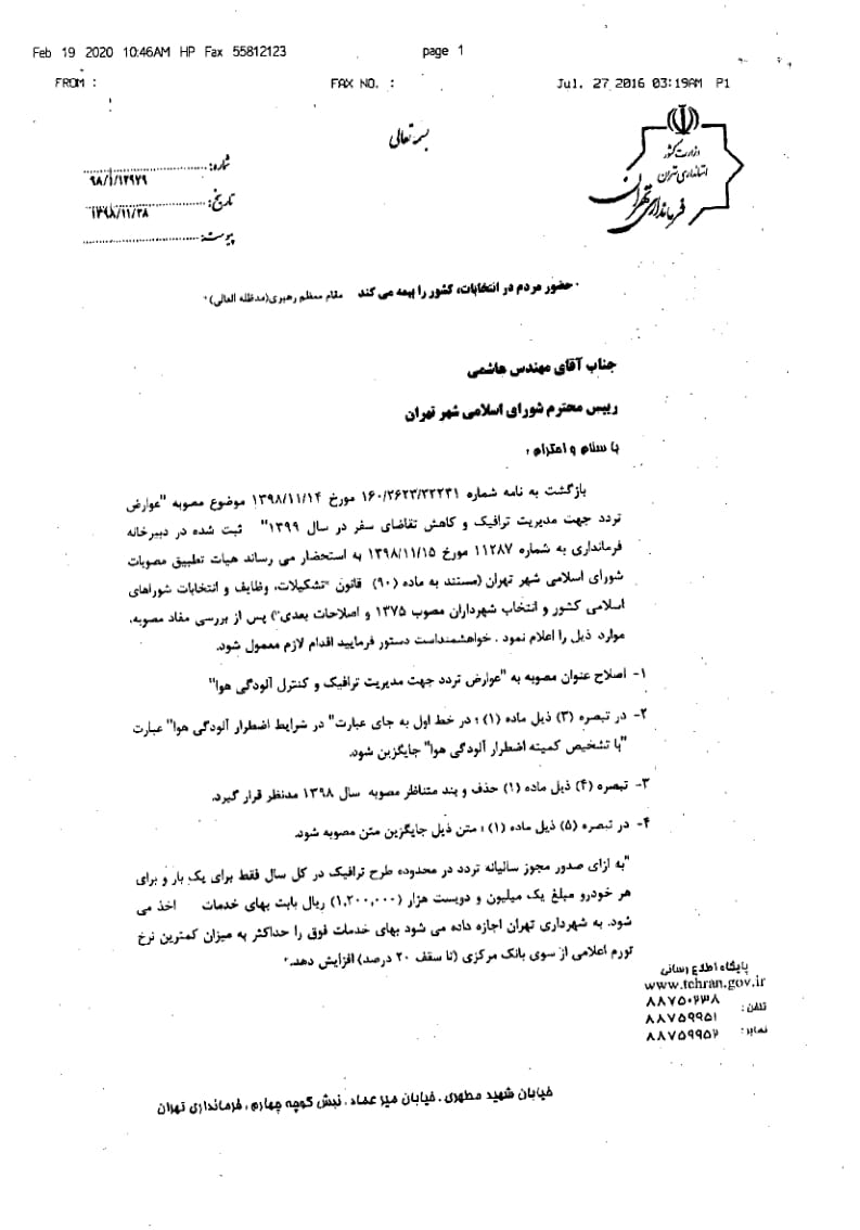 عوارض تردد جهت مديريت ترافيك، كاهش تقاضاي سفر و كنترل آلودگي هوا در سال ۱۳۹۹